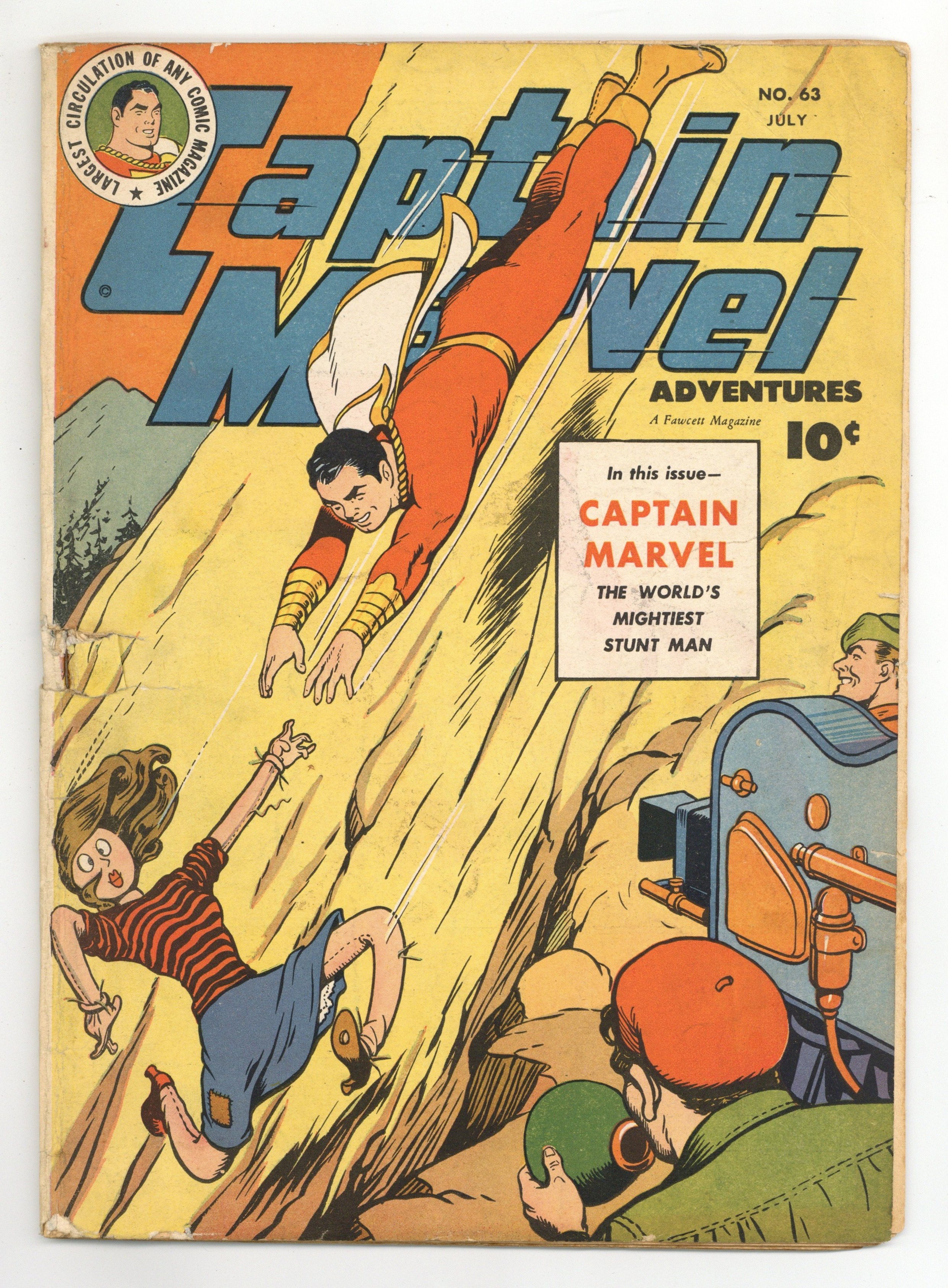 Cover pencils by C.C. Beck. Stories by Otto Binder, Bill Woolfolk and unknown. Art by C.C. Beck, Pete Costanza, Al Liederman and unknown. The Captain Marvel/Oggar serial continues with..."The Cult of the Curse Chapter 3: The Arena of Horror" by Otto Binder and C.C. Beck. Captain Marvel also stars in: "A Good Neighbor" by Bill Woolfolk, C.C. Beck and Pete Costanza; "The World's Greatest Stunt-Man" with story by Otto Binder; and "The Camera Fiend" by Otto Binder and C.C. Beck. Plus: Captain Kid..."Sounds Off" with art by Al Liederman. And: 2-page text story "The Lie That Killed" by Louis Wolfe. 52 Pages, Full Color. Cover price $0.10.