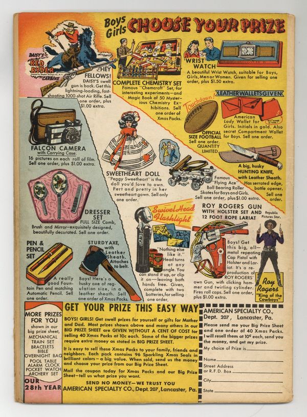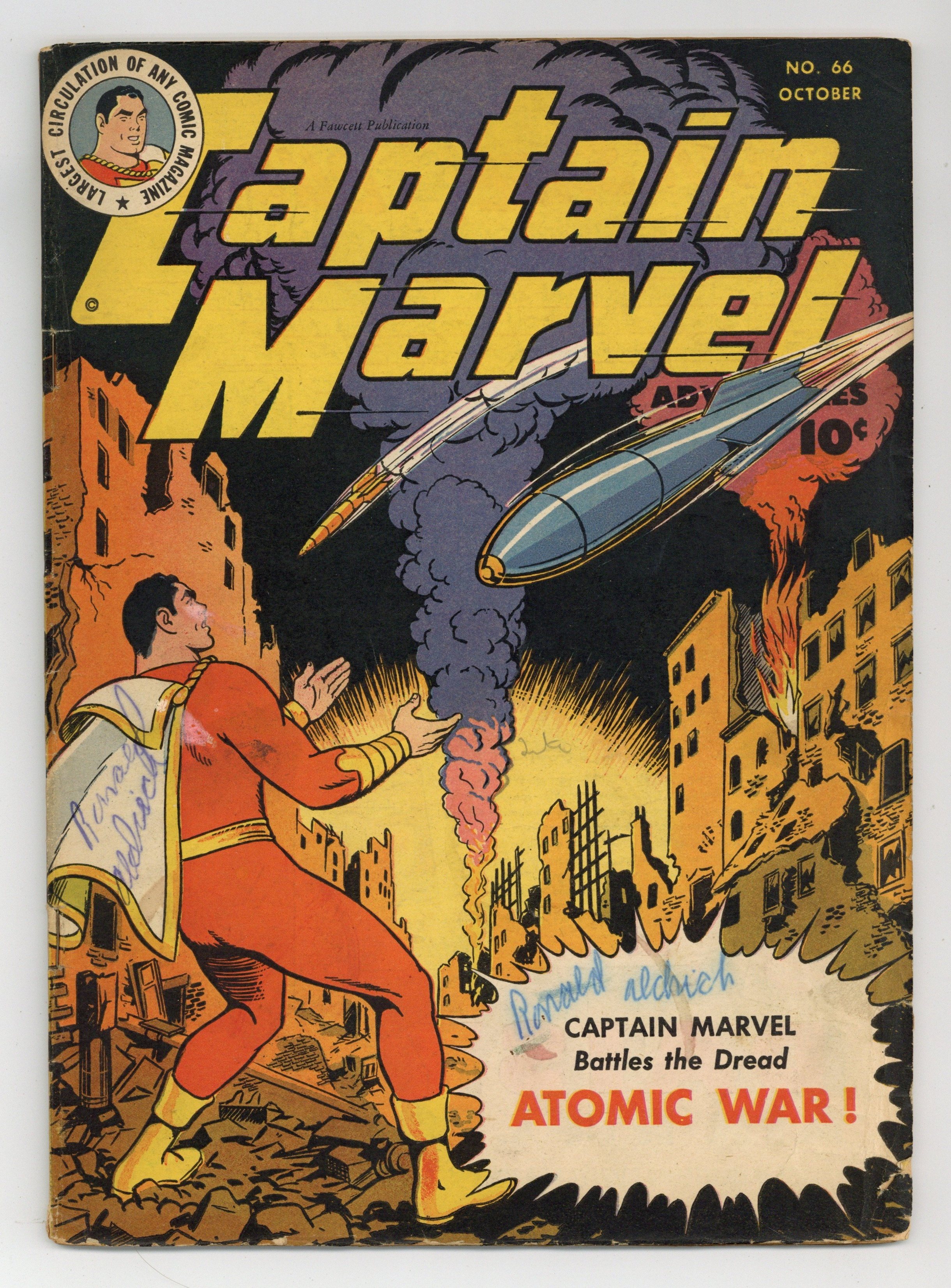 Cover by C.C. Beck. Stories by Otto Binder, Bill Woolfolk and unknown. Art by C.C. Beck, Pete Costanza, Al Liederman and unknown. The Captain Marvel/Oggar serial concludes with..."The Cult of the Curse Chapter 6: The Battle of the Century" by Otto Binder, C.C. Beck and Pete Costanza. Plus: Captain Marvel stars in The Day After-like TV show about nuclear holocaust in "The Atomic War!" by Otto Binder, C.C. Beck and Pete Costanza. Also: Aunt Minerva learns Captain Marvel's secret i.d. in "The Return of Aunt Minerva" with story by Bill Woolfolk. Plus: Captain Kid in "An Errand of Justice" with art by Al Liederman. And: Jon Jarl in the 2-page text story "Adventure in Space" with script by Otto Binder. 52 Pages, Full Color. Cover price $0.10.