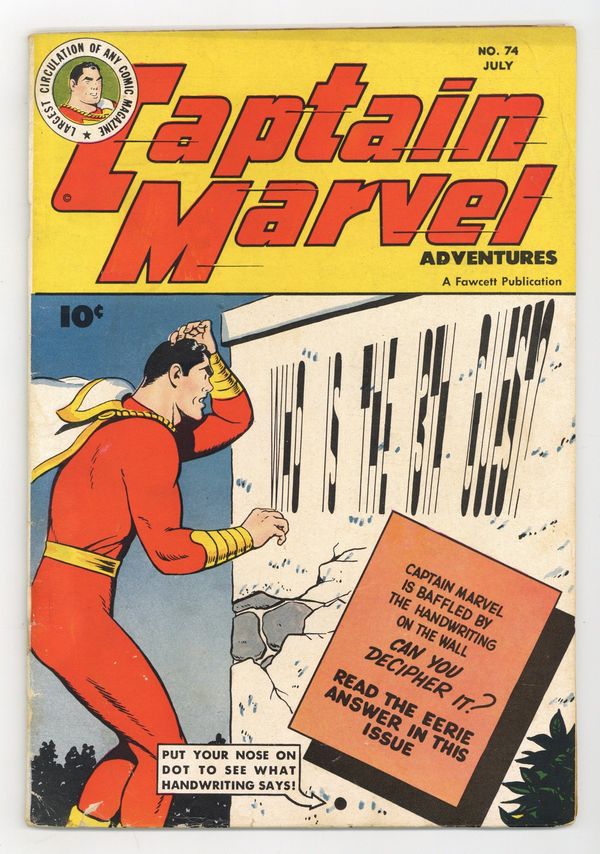 Cover by C.C. Beck. Stories by Bill Woolfolk, Otto Binder and Al Liederman. Art by Pete Costanza, Al Liederman and unknown. Captain Marvel (Billy Batson) stars in: "The Fate of the World" by Bill Woolfolk and Pete Costanza; "The Crazy Cave Colors" by Otto Binder and Pete Costanza; "Captain Marvel Takes a Beating" by Otto Binder and Pete Costanza; and "The Thirteenth Guest" with story by Otto Binder. Plus: Captain Kid in "The Formal Escapade" by Al Liederman. And: Jon Jarl in the 2-page text story "Human Pets of Neptune" with script by Otto Binder (as Eando Binder). 52 Pages, Full Color. Cover price $0.10.
