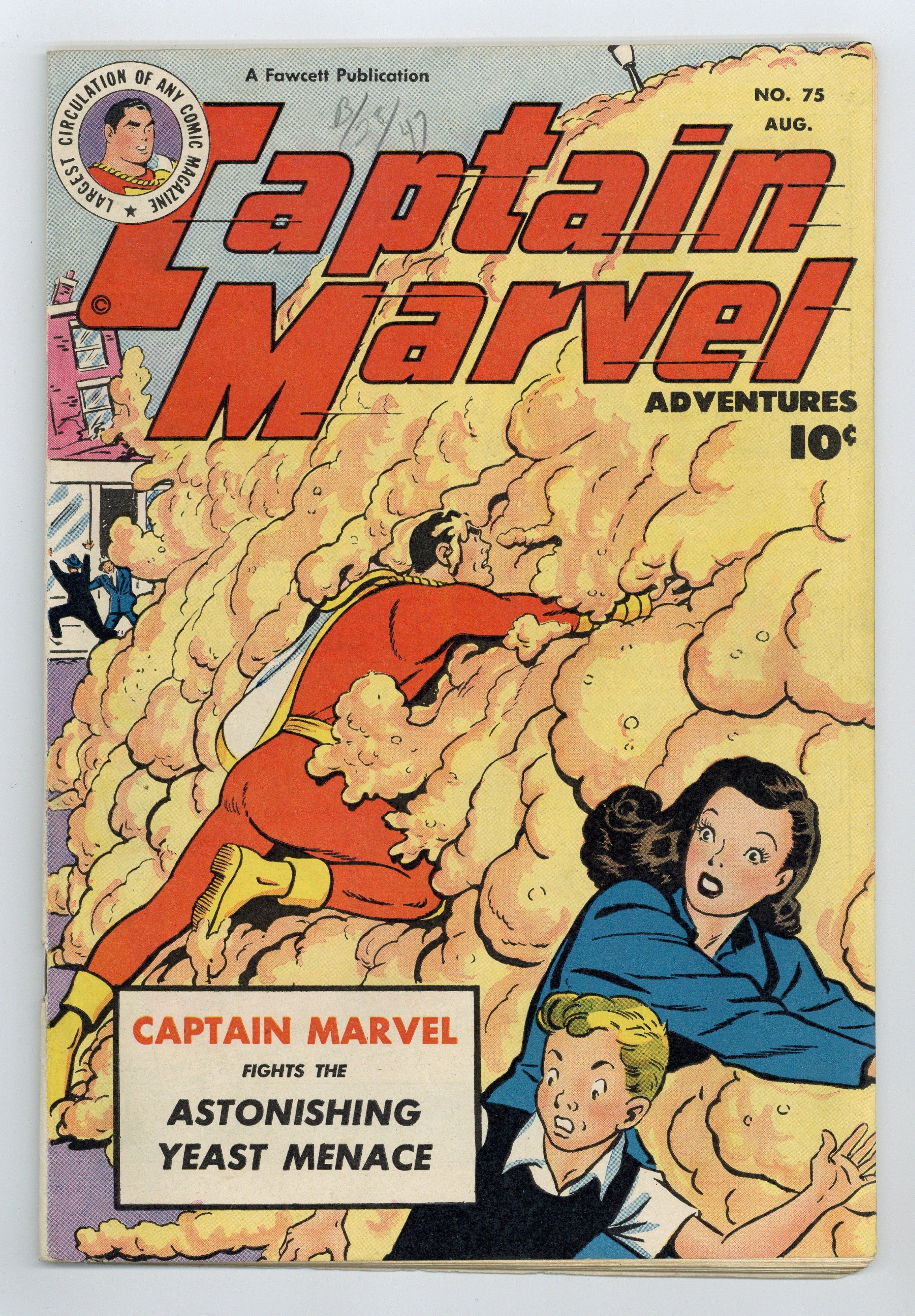 Captain Marvel stars in "Billy Batson, School Editor," "The Mississippi Steamboat Race," "The Yeast Menace," and "The Dream Transmitter." Scripts Al Liederman. Art by Pete Costanza and Al Liederma. Back-up story, "Captain Kid Blows Up." Two-page Jon Jarl text story, "Exile on Mercury" by Eando Binder. One-page Tootsie Roll ad, "Captain Tootsie Saves the School Party" by C.C. Beck and Costanza. Beck cover. 52 Pages, Full Color. Cover price $0.10.