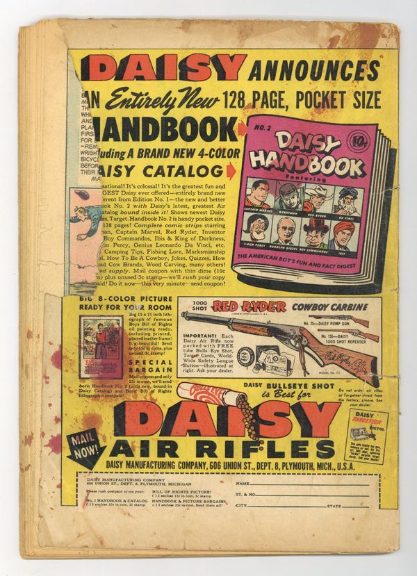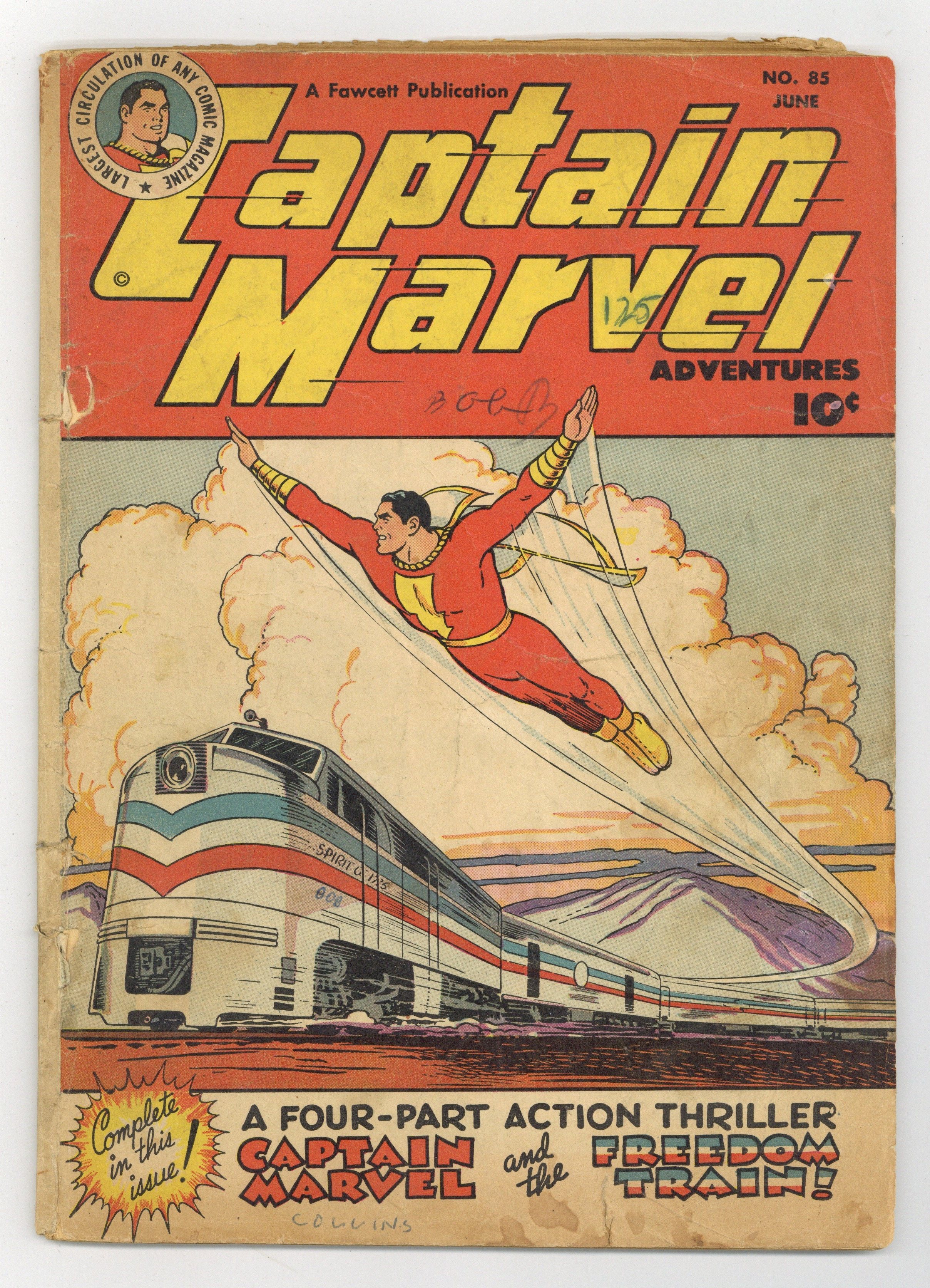 Cover by C.C. Beck. Stories by Otto Binder and unknown. Art by C.C. Beck, Pete Costanza and unknown. Complete in this issue...Captain Marvel (Billy Batson) stars in a four-part action thriller by Otto Binder, C.C. Beck and Pete Costanza: "The Freedom Train Part 1: The Freedom Train Rolls On"; "The Freedom Train Part 2: The Chase Through History"; "The Freedom Train Part 3: The Heritage of America"; and "The Freedom Train Part 4: The Freedom Plane" (Sivana appears throughout). Plus: Kid Gloves tale "A Sentimental Mood"! Also: Jon Jarl in the 2-page text story "Freedom Rocket" with script by Otto Binder (as Eando Binder). And: 1-page Tootsie Roll ad "Captain Tootsie Traps Killer Bear with Invisible Light" with art by C.C. Beck and Pete Costanza. 52 Pages, Full Color. Cover price $0.10.