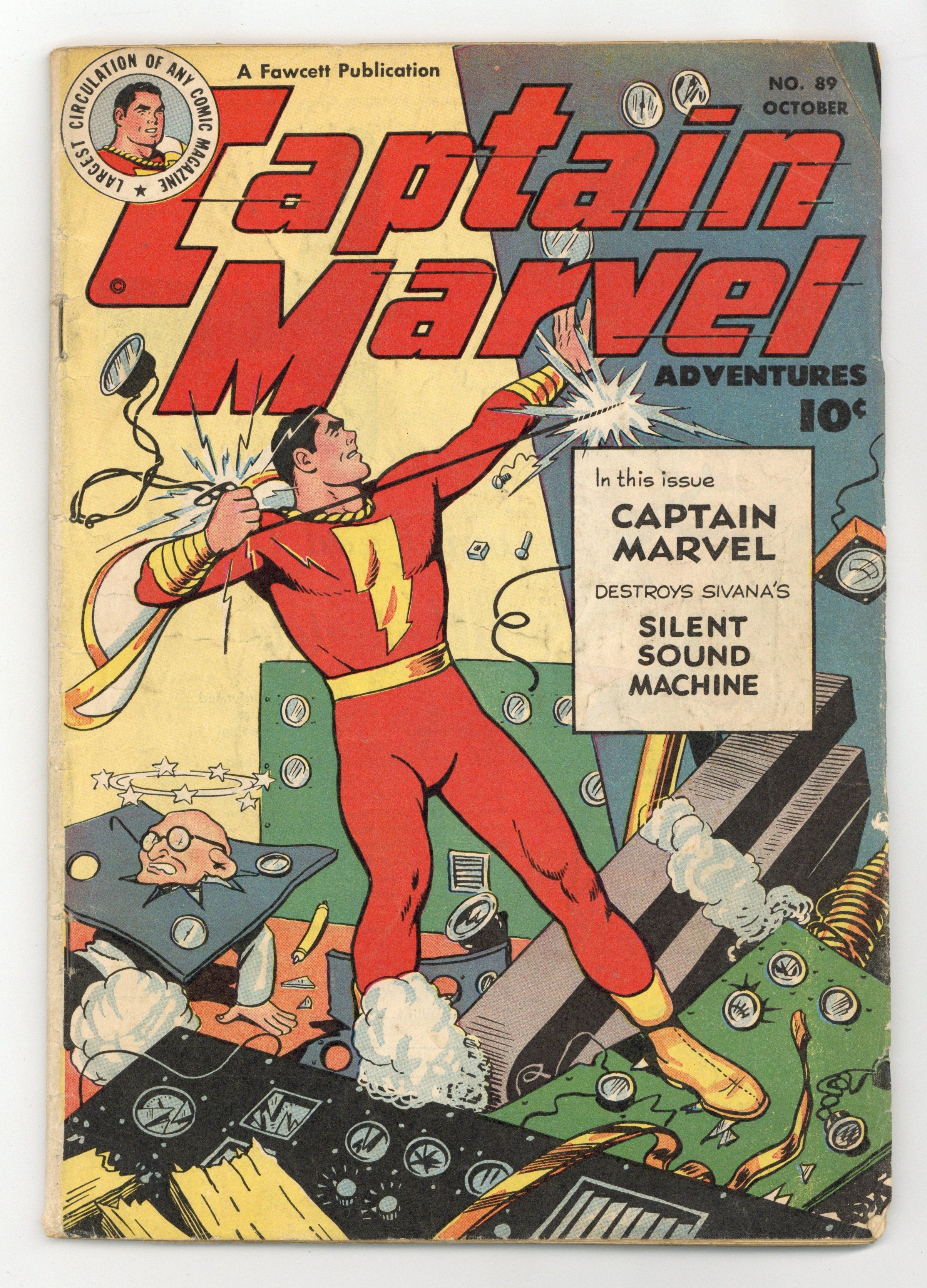 Cover by C.C. Beck. Stories by Bill Woolfolk, Otto Binder, Al Liederman and Frank Bolle. Art by C.C. Beck, Pete Costanza, Al Liederman and Frank Bolle. The living embodiment of Fear causes trouble for Captain Marvel by stirring up a panic with rumors about an atomic bomb in the city in "Captain Marvel Faces Fear!" by Bill Woolfolk, C.C. Beck and Pete Costanza. Also in this issue: "Captain Marvel's Melancholia!" by Bill Woolfolk, C.C. Beck and Pete Costanza; "Captain Marvel and the Pride of Mr. Morris" by Otto Binder, C.C. Beck and Pete Costanza; and "Captain Marvel Fights Silent Sound" by Otto Binder, C.C. Beck and Pete Costanza (Sivana appearance). Plus: Captain Kid in "The Big Clean Up" by Al Liederman; Freshman Freddy tale "The Glassy Approach" by Frank Bolle; Jon Jarl in the 2-page text story "World of Titans" by Otto Binder (as Eando Binder); and 1-page Tootsie Roll ad "Captain Tootsie Traps Killer Bear with Invisible Light" with art by C.C. Beck and Pete Costanza. 52 Pages, Full Color. Cover price $0.10.