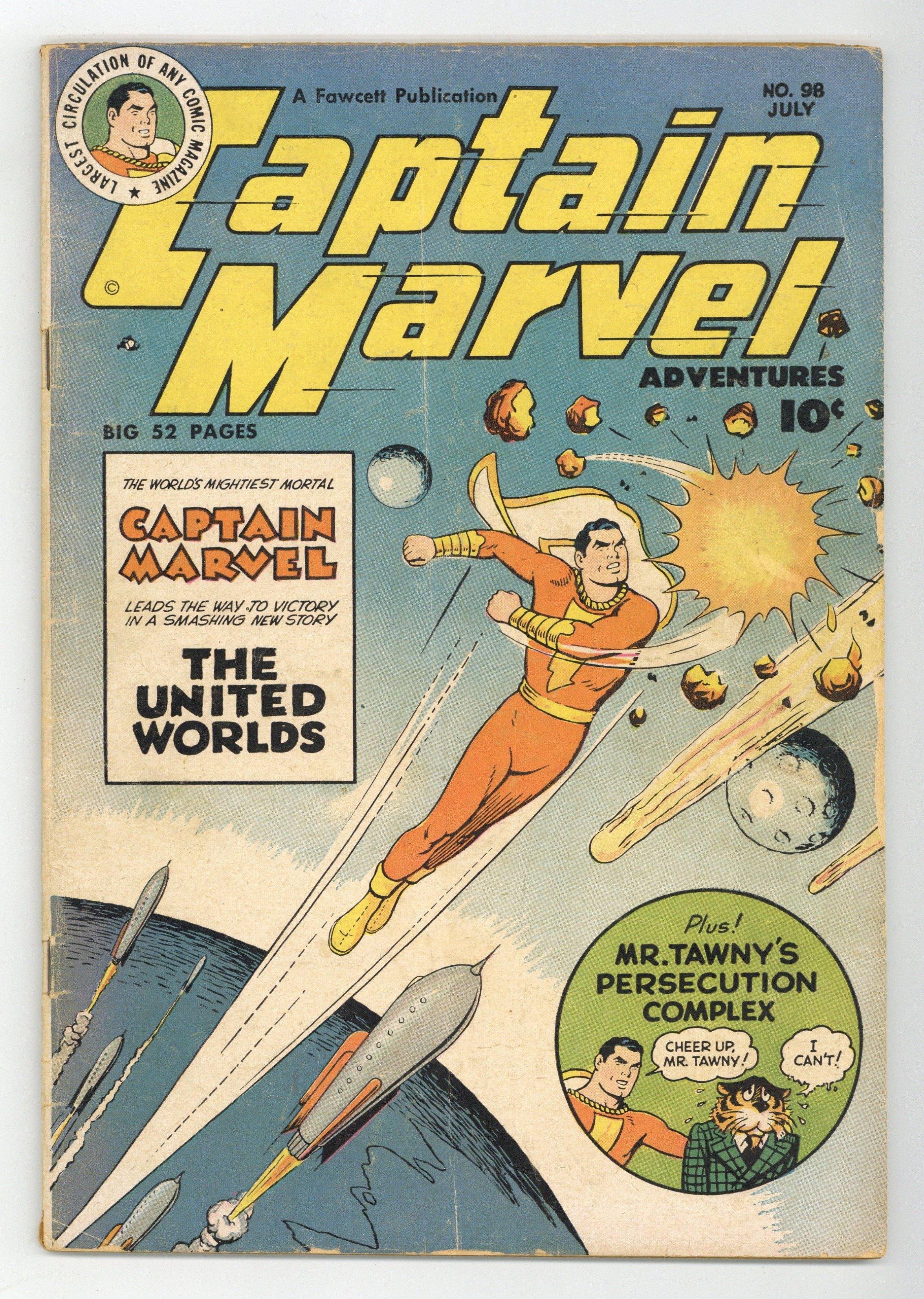 Cover by C.C. Beck. Stories by unknown. Art by C.C. Beck, Al Liederman and unknown. In this issue: Captain Marvel investigates a flying saucer and learns of..."The United Worlds" with art by C.C. Beck; Professor Sebastian has discovered a 93rd element in "The Mystery Metal" with art by C.C. Beck; Captain Marvel is stuck on an island with no memory of his identity or powers in "Captain Marvel Loses His Memory"; and Chester Chudney tries to make Mr. Tawny feel self-conscious about his tail in "Mr. Tawny's Persecution Complex" with art by C.C. Beck. Plus: Captain Kid in "The Clean-Up Man" with art by Al Liederman. And: Jon Jarl in the 2-page text story "Atomic Express Mail" with script by Otto Binder (as Eando Binder). 52 Pages, Full Color. Cover price $0.10.