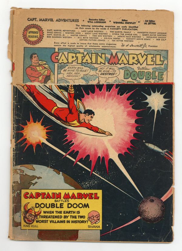 Cover pencils by C.C. Beck. Stories by Otto Binder and unknown. Art by C.C. Beck and unknown. When the Earth is threatened by Sivana and King Kull -- the two worst villains in history -- Captain Marvel (Billy Batson) battles..."Double Doom" with story by Otto Binder and pencils by C.C. Beck. Captain Marvel also stars in "The Famine Foiler" and "The Mysterious Invisible Monster," both by Otto Binder and C.C. Beck. Plus: "The Big Trip"; Captain Kid in "The Innocent Panic"; and Jon Jarl in the 2-page text story "The Worthless World" with script by Otto Binder (as Eando Binder). 36 Pages, Full Color. Cover price $0.10.