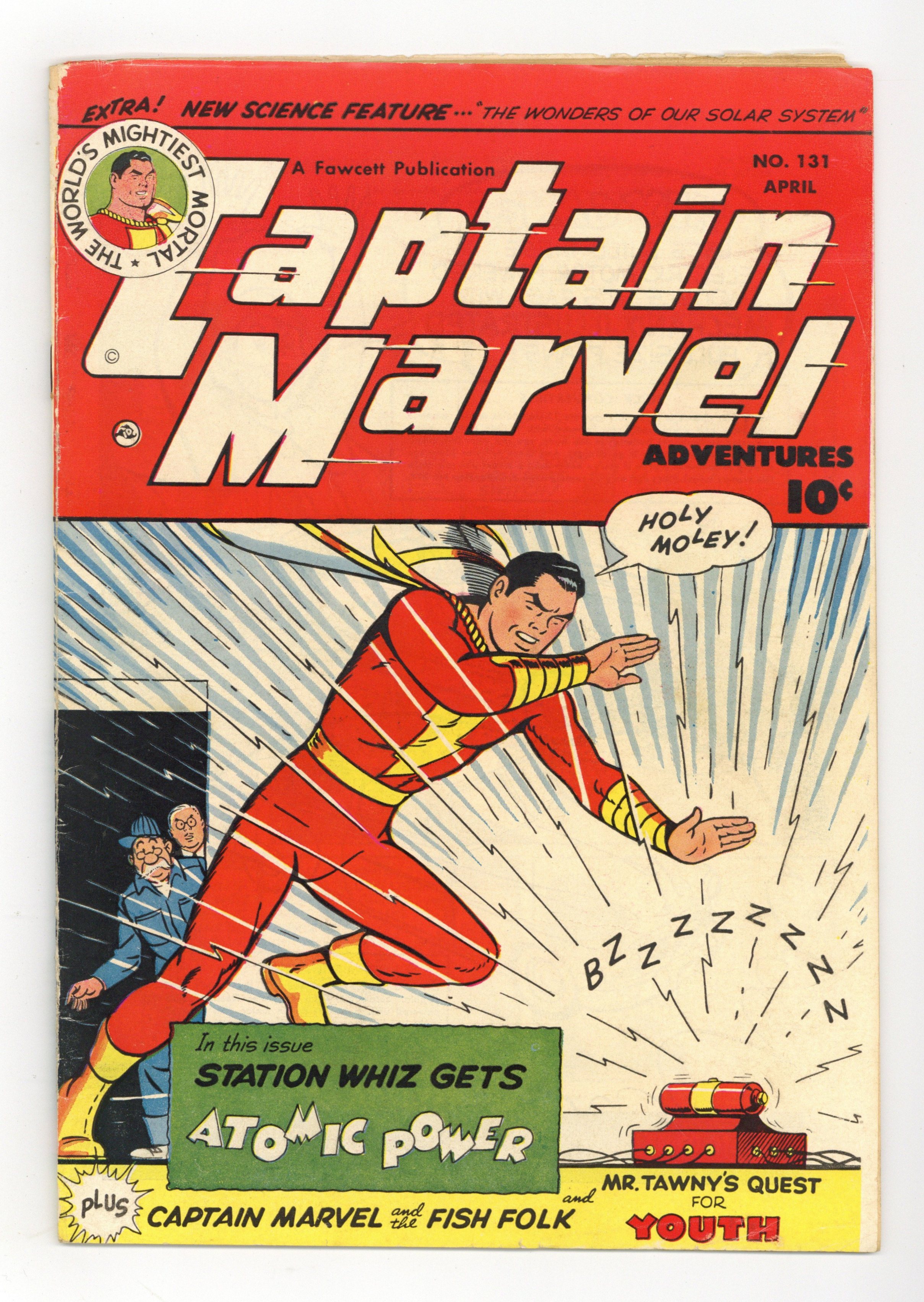 Cover by C.C. Beck. Stories by Otto Binder, Al Liederman and unknown. Art by C.C. Beck, Pete Costanza, Al Liederman and unknown. Captain Marvel (Billy Batson) stars in: "Station WHIZ Gets Atomic Power" by Otto Binder, C.C. Beck and Pete Costanza; "The Fishing Fish Folk" by Otto Binder and Pete Costanza; and "Mr. Tawny's Quest for Youth" with story by Otto Binder and pencils by C.C. Beck. Plus: A Science Feature "The Wonders of Our Solar System" with art by C.C. Beck; Captain Kid in "The Bully's Revenge" by Al Liederman; and Jon Jarl in the 2-page text story "The Space Test" by Otto Binder (as Eando Binder). 36 Pages, Full Color. Cover price $0.10.