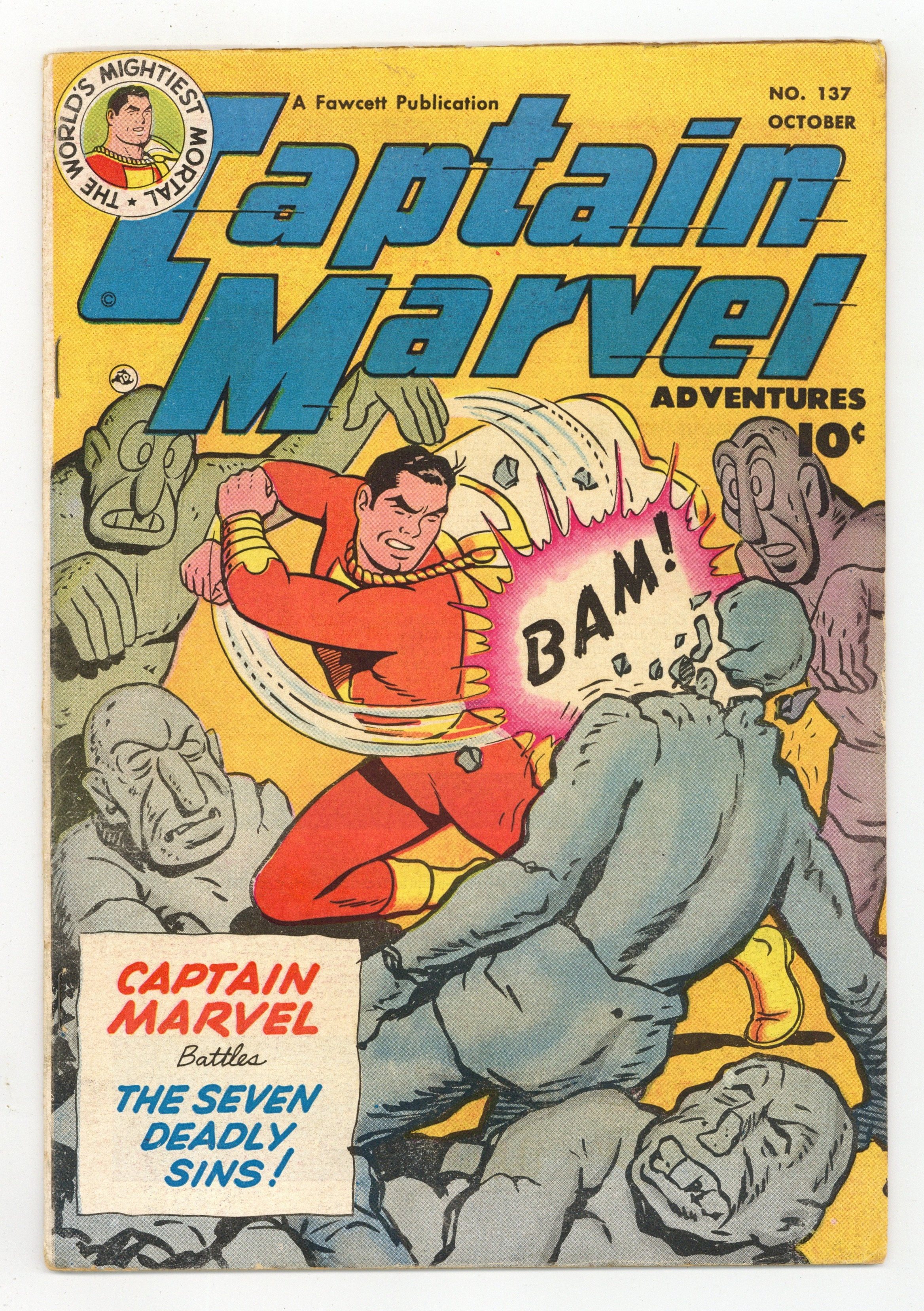 Cover by C.C. Beck. Stories by Otto Binder and unknown. Art by C.C. Beck and unknown. Captain Marvel (Billy Batson) stars in: "King Kull and the Seven Sins" by Otto Binder and C.C. Beck (appearances by Shazam, Dexter Knox and King Kull); "Mr. Tawny's Culture Craze" by Otto Binder and C.C. Beck; and "The Royal Riddle" by Otto Binder and C.C. Beck. Plus: Big Bow and Little Arrow tale "Old Age"; Captain Kid in "The Sat-On Baby Sitter"; and Jon Jarl in the 2-page text story "Pied Piper of Space" by Otto Binder (as Eando Binder). 36 Pages, Full Color. Cover price $0.10.