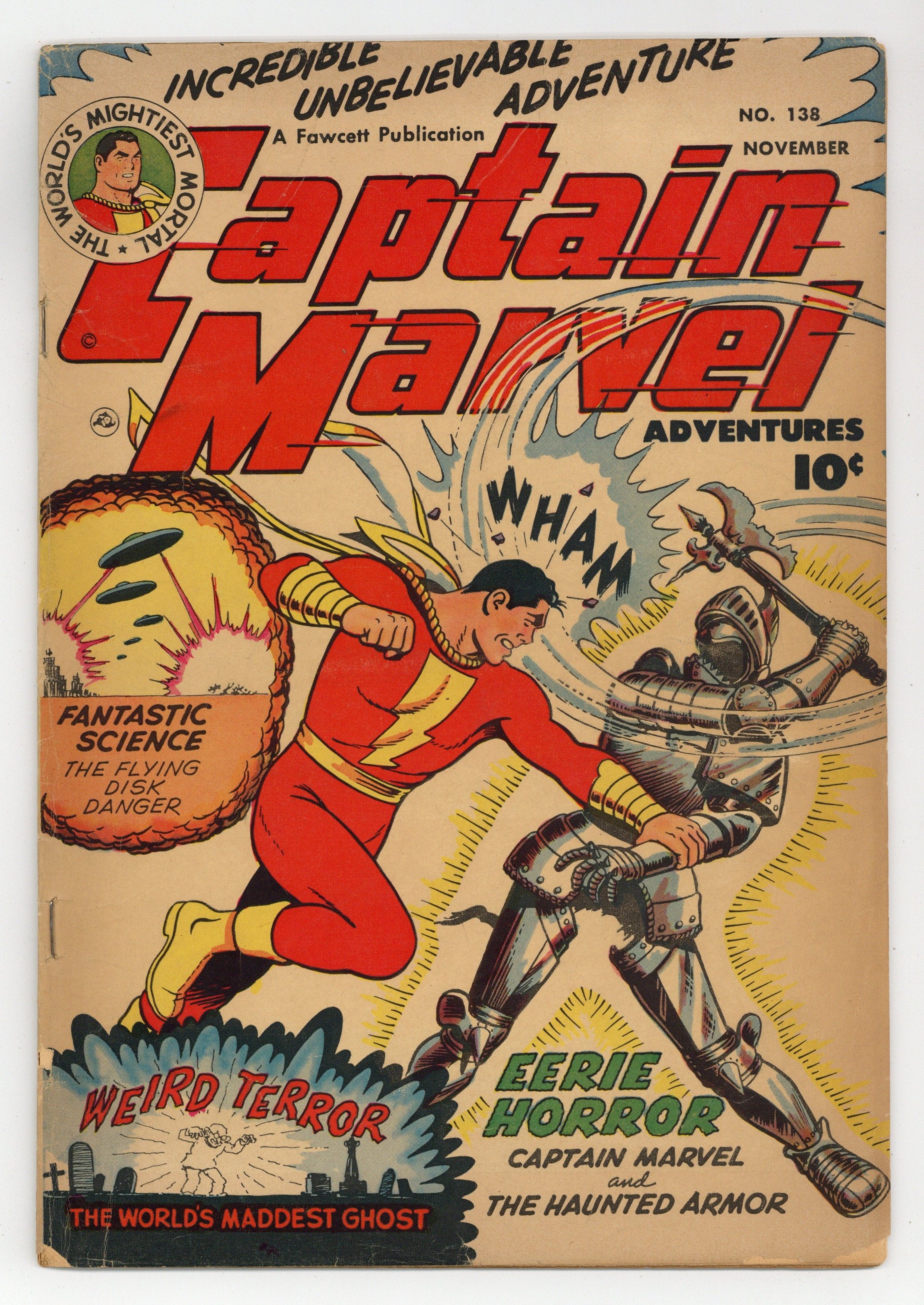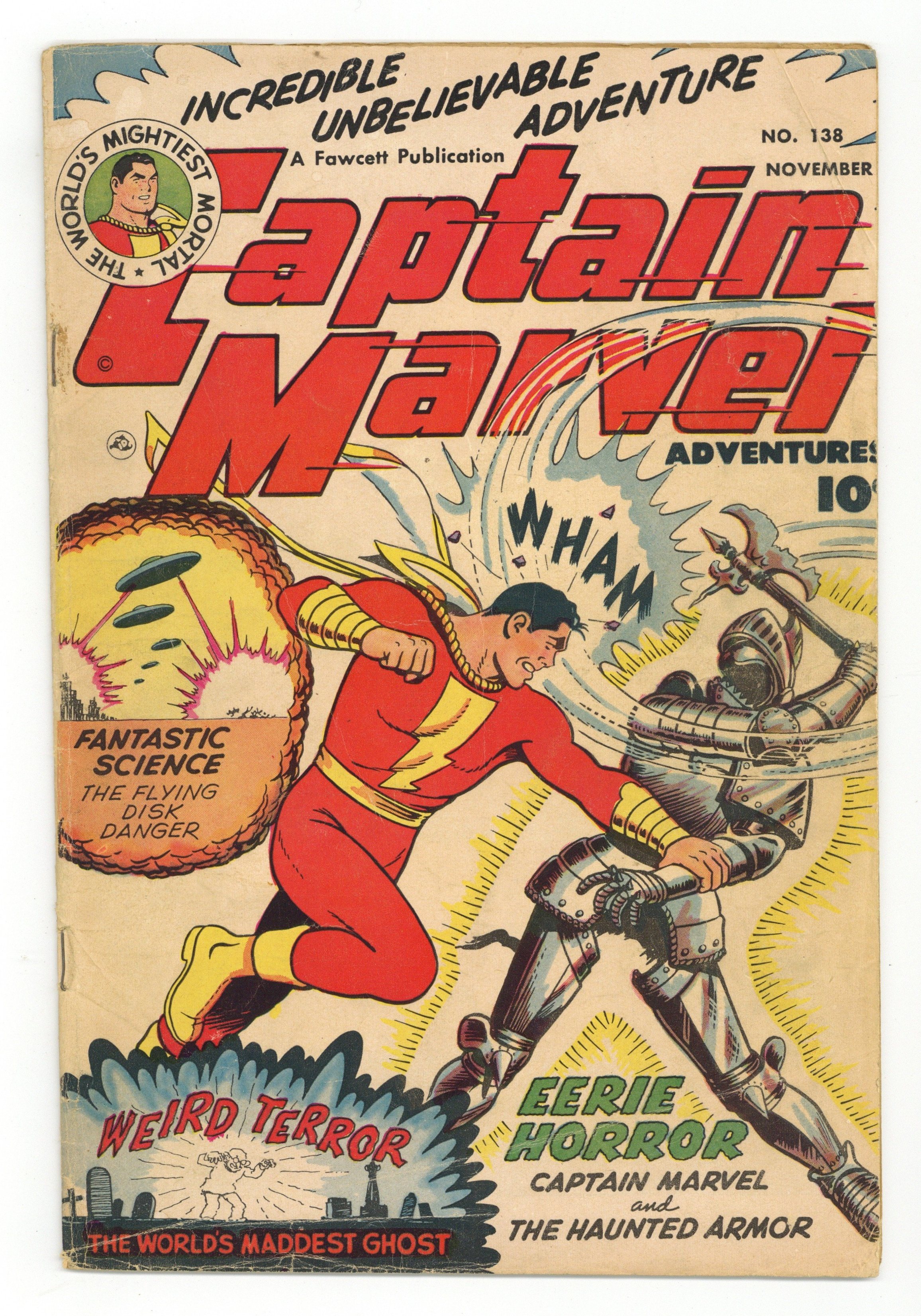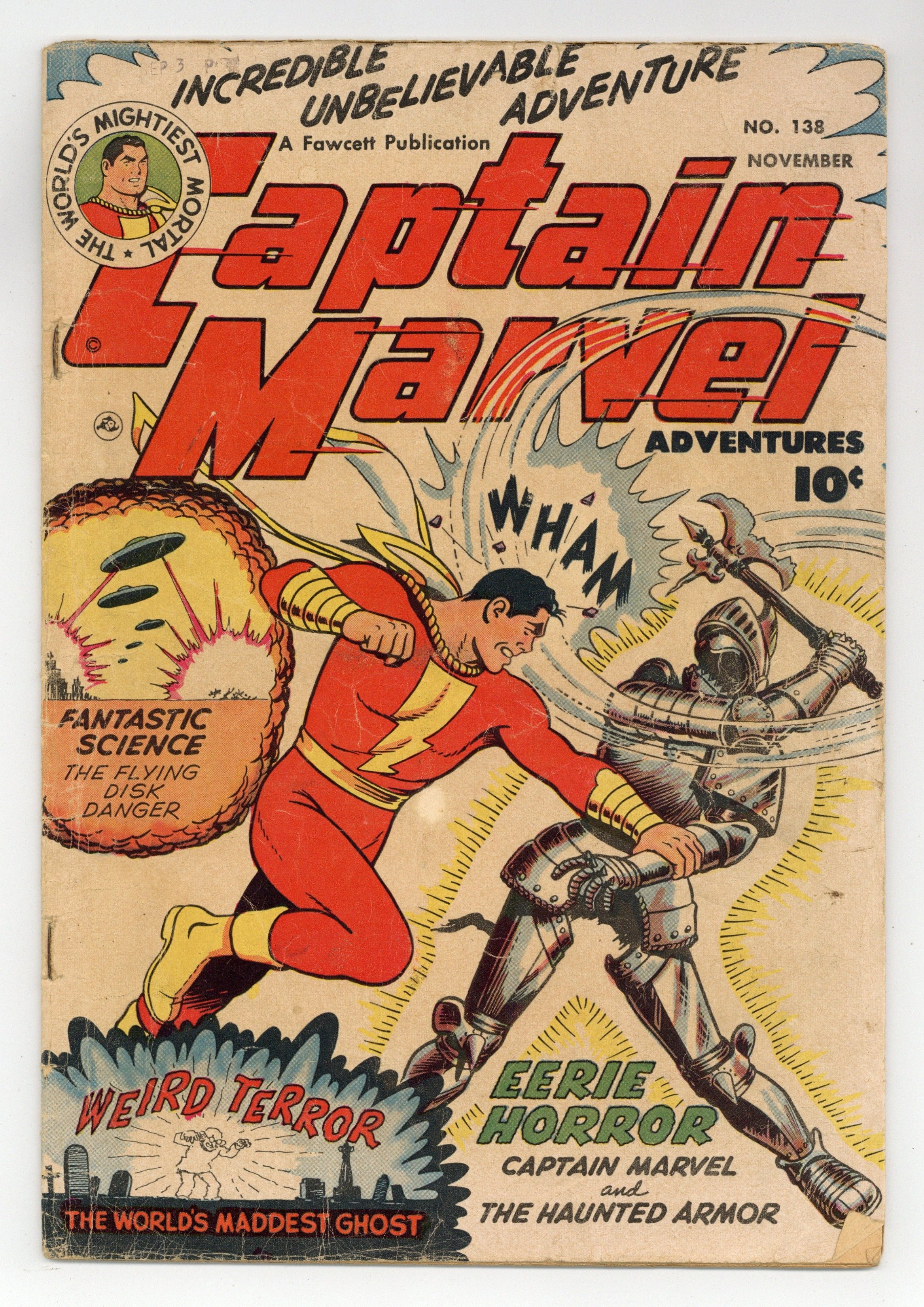 Cover by C.C. Beck. Stories by Otto Binder and unknown. Art by C.C. Beck, Pete Costanza and unknown. Captain Marvel (Billy Batson) stars in: "Captain Marvel Fights the Flying Disk Danger" by Otto Binder and C.C. Beck; "The Horrible Haunted Armor" by Otto Binder, C.C. Beck and Pete Costanza; and "Captain Marvel Battles the World's Maddest Ghost!" by Otto Binder and C.C. Beck (appearances by Sivana and Dexter Knox). Plus: Captain Kid in "The Losing Winner"! And: Jon Jarl in the 2-page text story "Interplanetary Firebug" by Otto Binder (as Eando Binder). 36 Pages, Full Color. Cover price $0.10.