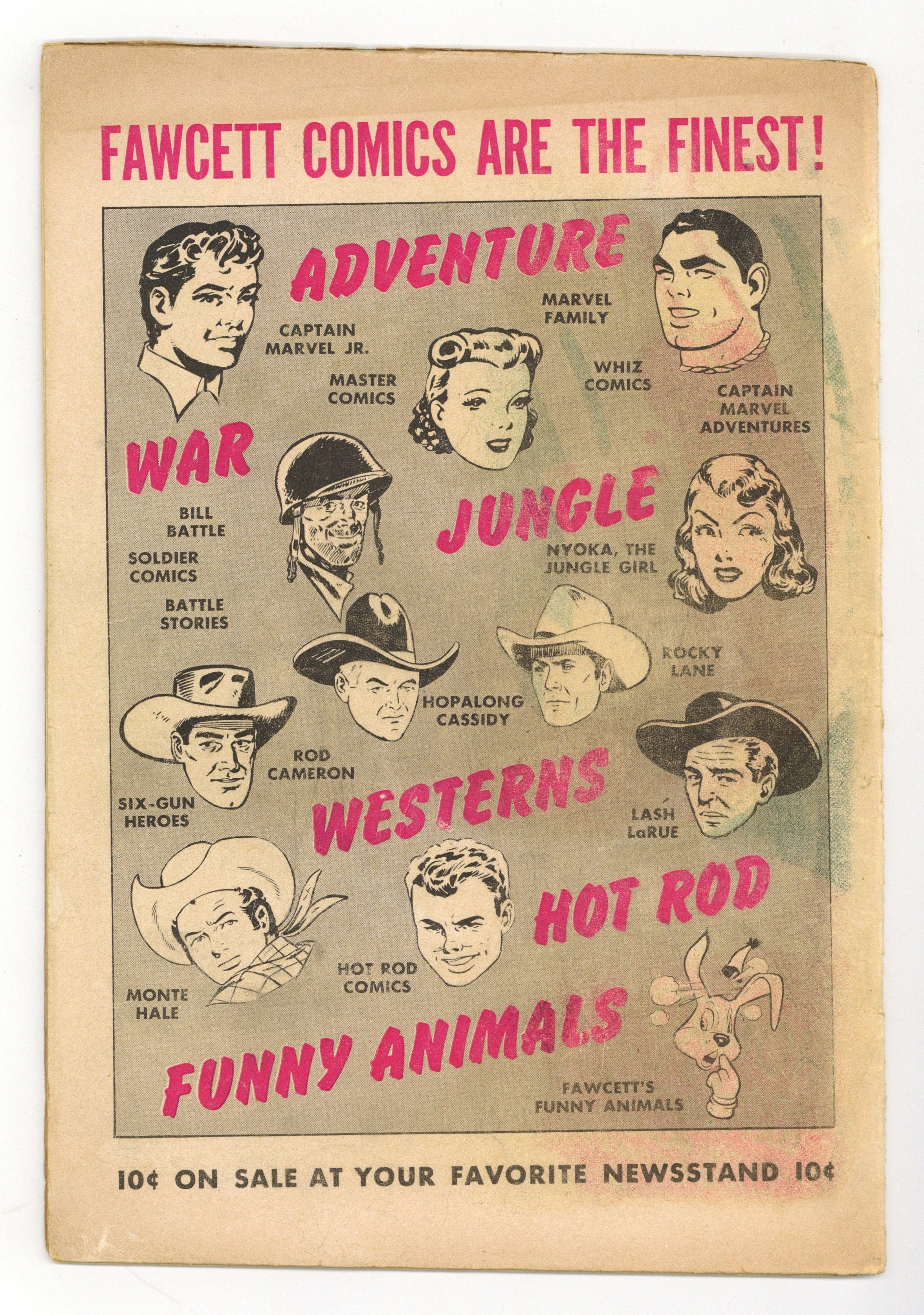 Cover by C.C. Beck. Stories by Otto Binder and unknown. Art by C.C. Beck, Pete Costanza and unknown. Captain Marvel (Billy Batson) stars in: "Hand of Horror" with story by Otto Binder; "Captain Marvel Fights the Mongol Blood-Drinkers" by Otto Binder, C.C. Beck and Pete Costanza (the Scarlet Vampire appearance); and "Captain Marvel Battles Viking Villainy" with story by Otto Binder (Dexter Knox appearance). Plus: Colonel Corn and Korny Kobb tale "The Well-Dressed Dope!"; Captain Kid in "The New Suit"; and Jon Jarl in the 2-page text story "Space Salvage" with script by Otto Binder (as Eando Binder). 36 Pages, Full Color. Cover price $0.10.