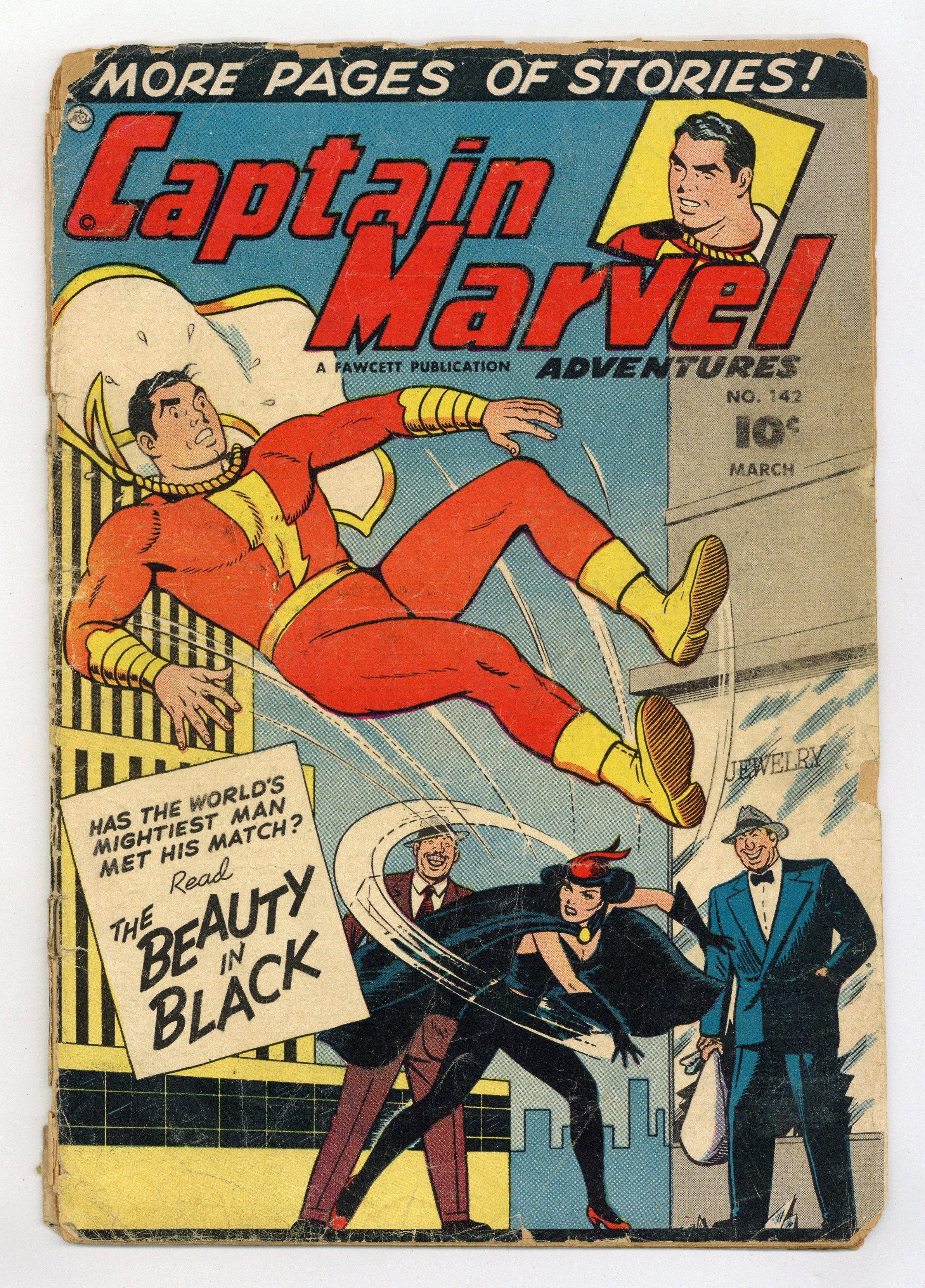 Cover by C.C. Beck. Stories by Otto Binder and unknown. Art by C.C. Beck, Kurt Schaffenberger and unknown. Has The World's Mightiest Man met his match? Find out in "The Beauty in Black!" by Otto Binder and C.C. Beck (Black Beauty introduction). Captain Marvel (Billy Batson) also stars in: "The Red Lightning Blitz" by Otto Binder and C.C. Beck (Red Crusher appearance); "Sabotage Aboard the Space Station" by Otto Binder and Kurt Schaffenberger (appearances by Doc Quartz and Dexter Knox); and "The Tiger Terror" by Otto Binder and C.C. Beck (Tawky Tawny appearance). Plus: Captain Kid in "The Boisterous Bully"! And: Jon Jarl in the 2-page text story "Korea of Space" with script by Otto Binder (as Eando Binder). 36 Pages, Full Color. Cover price $0.10.
