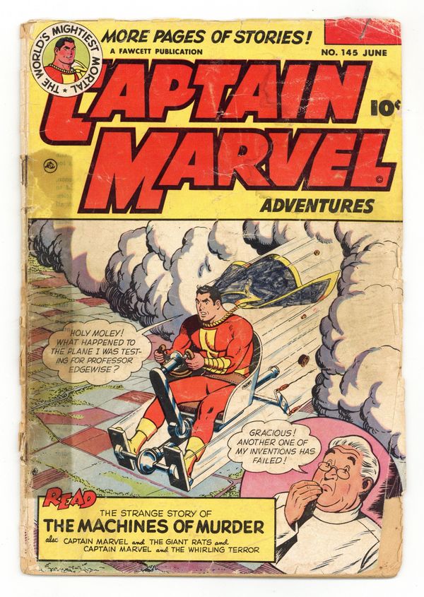 Cover by Kurt Schaffenberger. Stories by William Woolfolk, Otto Binder and unknown. Art by C.C. Beck, Pete Costanza and unknown. Captain Marvel travels to the year 81,953 and discovers that the land is ruled by giant rats, and mankind is reduced to hiding underground in "The World of Giant Rats" by William Woolfolk, C.C. Beck and Pete Costanza (appearances by Professor Edgewise and Mork-El). Captain Marvel (Billy Batson) also stars in "Whirling Terror" by Otto Binder and C.C. Beck (appearances by Dexter Knox and King Kull) and "The Machines of Murder!" (appearances by Professor Edgewise and Dr. Torpe). Plus: Captain Kid in "The Ride Down Death Hill"! And: Jon Jarl in the 2-page text story "The Space Ad" with script by Otto Binder (as Eando Binder). 36 Pages, Full Color. Cover price $0.10.
