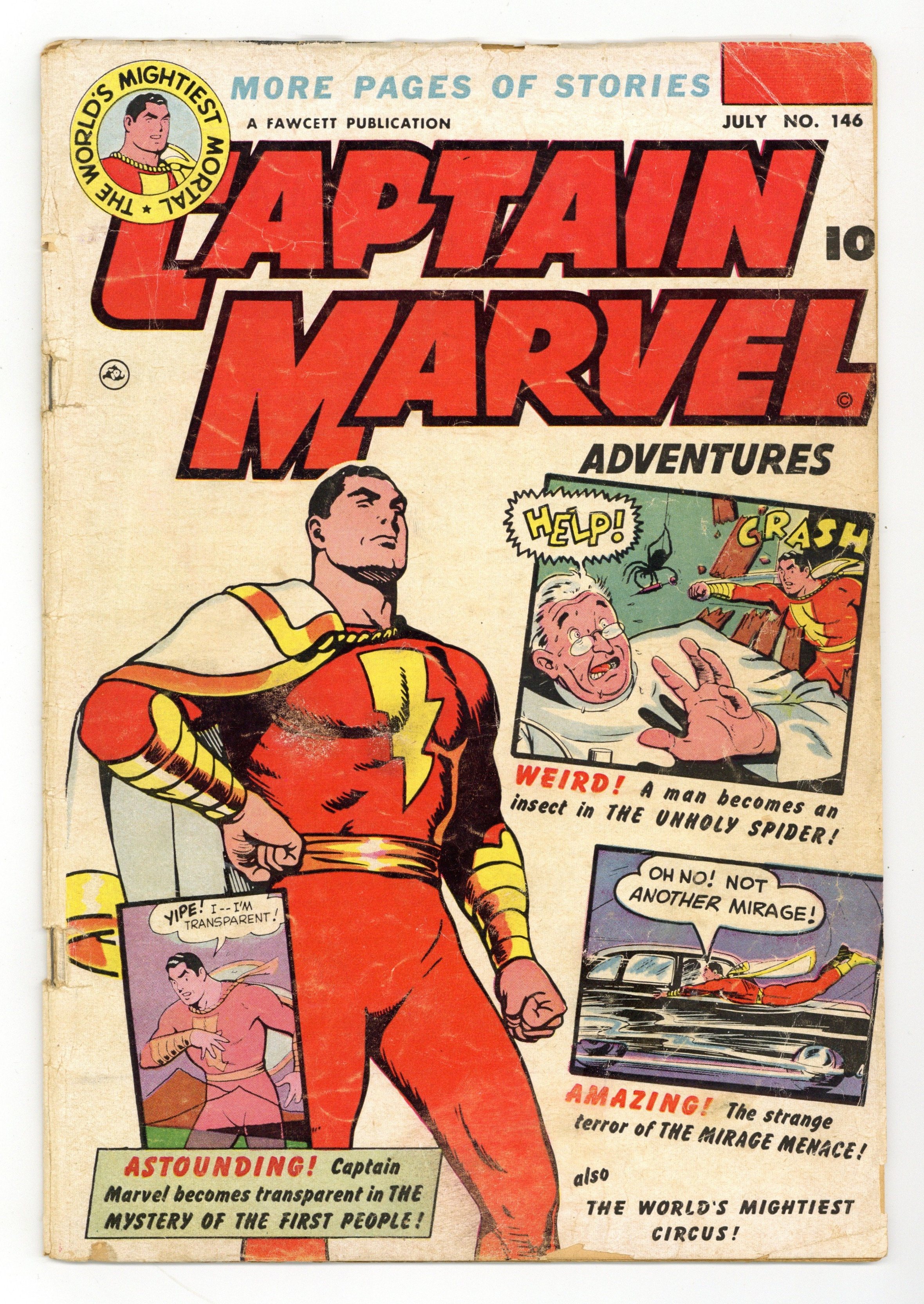 Stories by Bill Woolfolk, Otto Binder and unknown. Art by C.C. Beck, Pete Costanza and unknown. Captain Marvel becomes transparent in "Captain Marvel Battles Sivana and the First People" with story by Bill Woolfolk and pencils by C.C. Beck. Also in this issue: The strange terror of..."The Mirage Menace" with story by Otto Binder and inks by Pete Costanza (The Mirage Maker introduction); a man becomes an insect in "Captain Marvel Fights the Unholy Spider" with story by Bill Woolfolk; and "Captain Marvel and the World's Mightiest Circus" with story by Bill Woolfolk. Plus: Captain Kid in "The Lasting Impression"! And: Jon Jarl in the 2-page text story "The Space Junkman" by Otto Binder (as Eando Binder). 36 Pages, Full Color. Cover price $0.10.