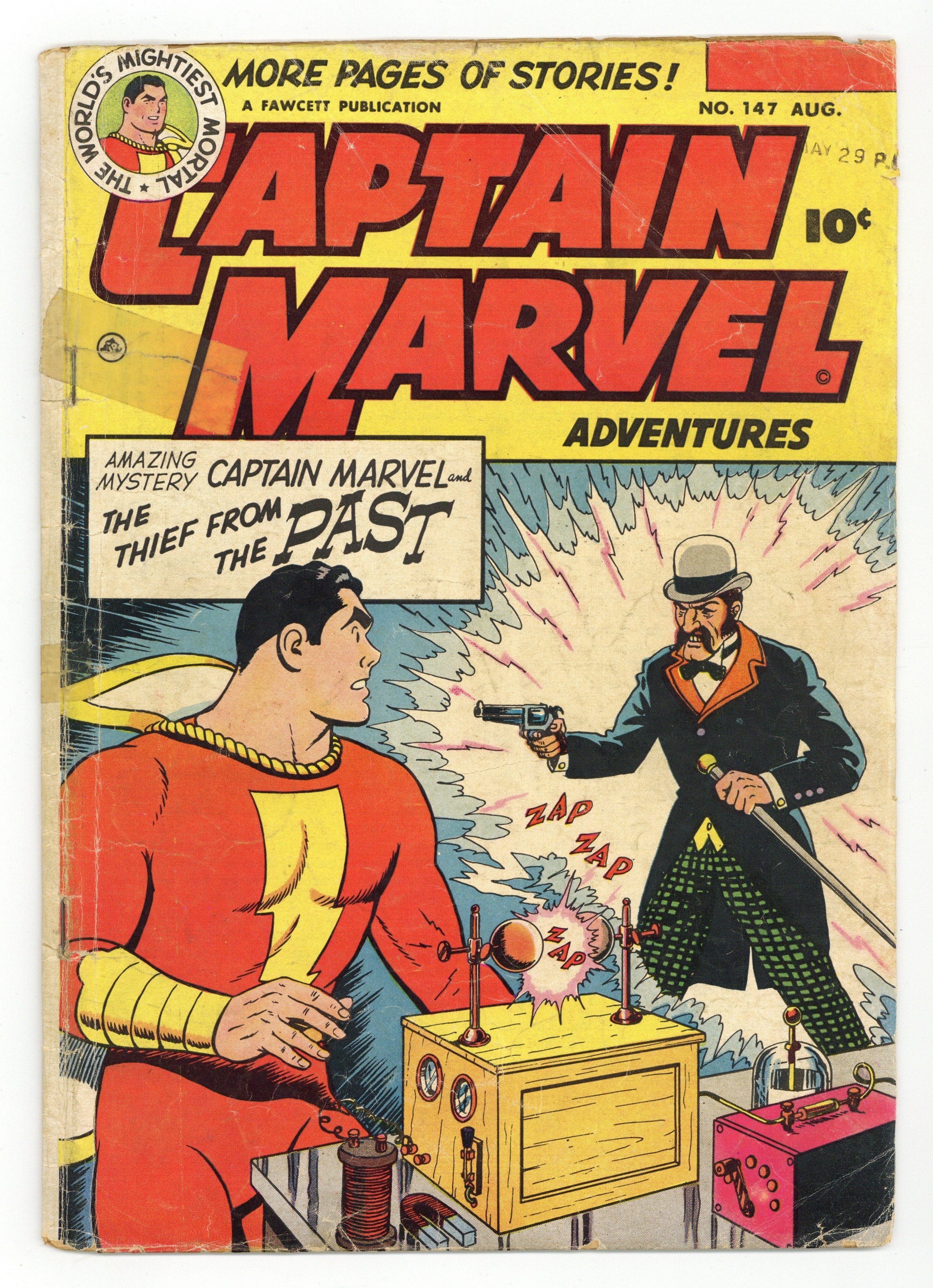 Stories by Otto Binder, Bill Woolfolk and unknown. Art by Kurt Schaffenberger, C.C. Beck, Jack Bowler and unknown. Captain Marvel (Billy Batson) stars in: "The Riddle of the Space Reds" by Otto Binder and Kurt Schaffenberger; "The Queen of Spies" by Otto Binder, C.C. Beck and Jack Bowler (Delura introduction); "The Vampire Burglar" with story by Bill Woolfolk and pencils by C.C. Beck; and "The Thief from the Past" by Bill Woolfolk and C.C. Beck. Plus: Captain Kid in "The Secrets of Success"! And: Jon Jarl in the 2-page text story "The Miniature Menace" by Otto Binder (as Eando Binder). 36 Pages, Full Color. Cover price $0.10.