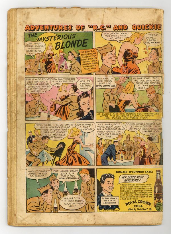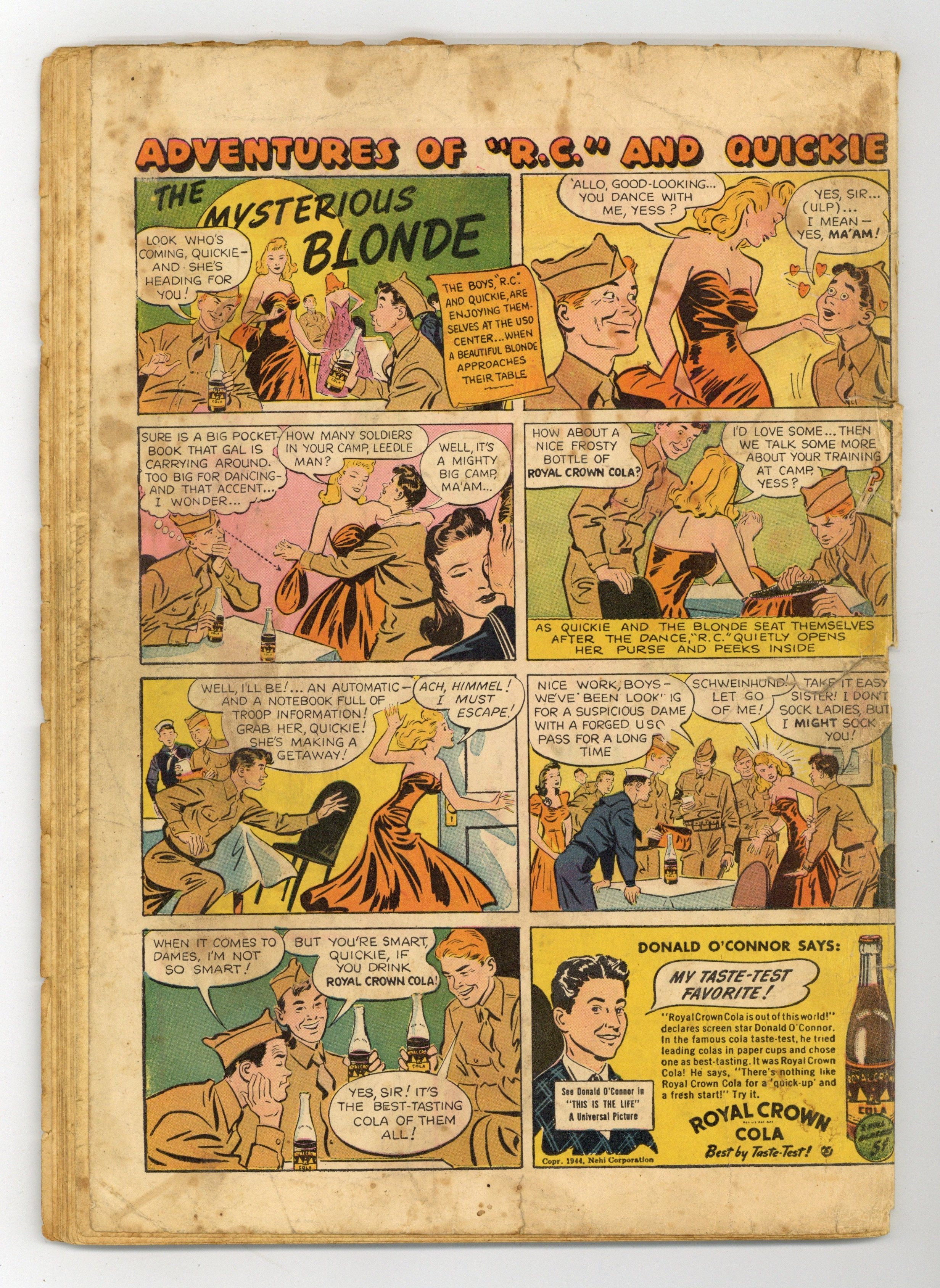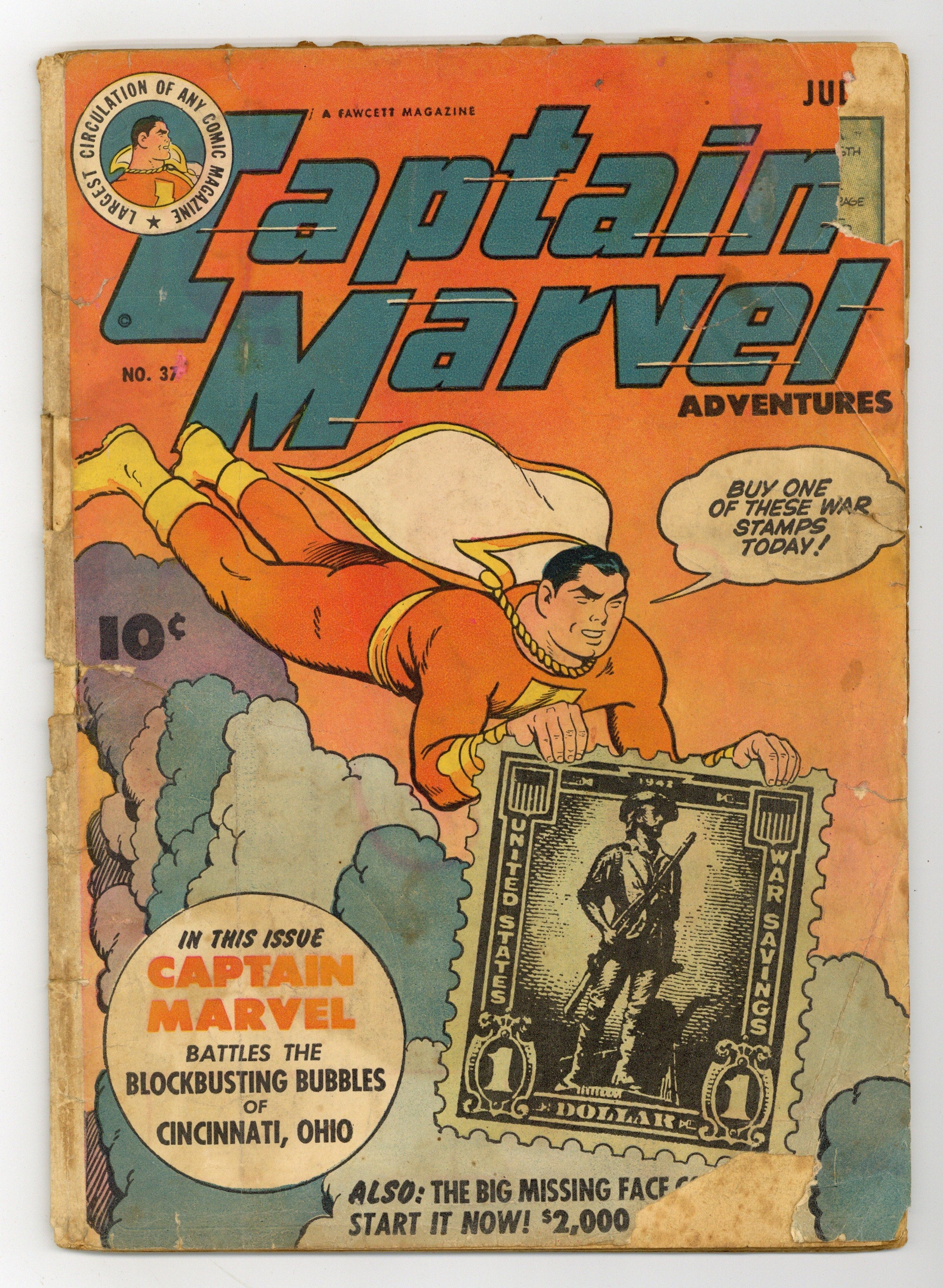 Cover by C.C. Beck. Stories by Otto Binder. Art by C.C. Beck, Pete Costanza and unknown. After Captain Marvel finds a way to plug the lava flow, he pursues Mr. Mind and Jeepers underground, where he meets a race of small people called the Sub-Americans, who have planned to use dynamite to split the western hemisphere from the eastern hemisphere if the Allied forces are endangered by the Nazis. Mr. Mind finds out about the dynamite and plans to use it for his own purposes in "The Monster Society of Evil Chapter 16: Earth Must Die" by Otto Binder and C.C. Beck. Captain Marvel also stars in: "His Battle of the Bubbles" by Otto Binder, C.C. Beck and Pete Costanza (Cincinnati, Ohio city story); "The Visitors from Space" with story by Otto Binder (Mary Marvel appearance); and "Trouble with Mr. Double" with story by Otto Binder. Plus: Captain Marvel "Missing Face Contest No. 2" 1-pager. And: 2-page text story "Pattern for Victory" by Carl G. Hodges. 52 Pages, Full Color. Cover price $0.10.