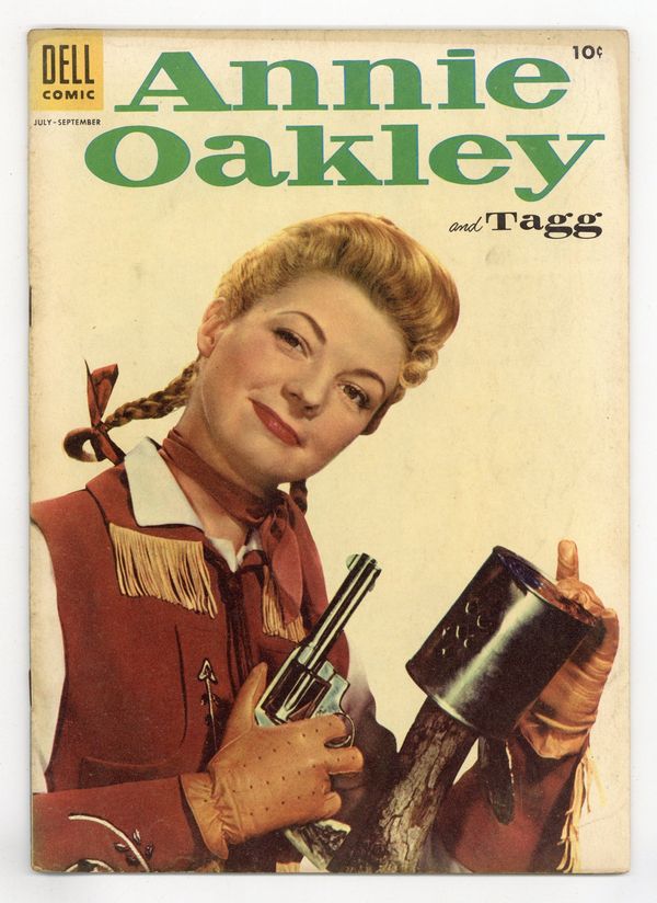 Photo cover features Gail Davis of "Annie Oakley." Stories and art by Bob Schoenke and August Lenox. Four Color (1942-1962 Dell 2nd Series) #438, 481, and 575 counted as the first three issues of this series in Dell's reckoning. Annie Oakley and her little brother Tagg have adventures, based on the 1954-1957 Western TV series "Annie Oakley." Annie joins a posse searching for outlaw Slick Paul, who is searching in turn for the loot from a past job. But after Paul captures Tagg, Tagg sends for help with a coded message to his sister. When the outlaw Shaw brothers return to town, it doesn't look good for Bick, their law-abiding brother. The Rainbow Trail; A Real Mild Hombre; Two Gun Secret; The Signal; Indian Designs: What They Mean. 32 pages, Full Color. Cover price $0.10.
