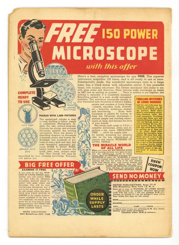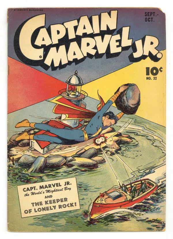 Cover by Bud Thompson. Stories by Art Helfant and others. Art by Art Helfant and others. Superhero action with Freddy Freeman, who gains the same powers as his hero Captain Marvel, better known these days as Shazam. A bitter cartoonist gets hold of an invention that turns people into living caricatures of themselves. Captain Marvel Jr. faces a spree of nonsensical crimes apparently created by escaped mental patients. A lighthouse operator witnesses the battle between Captain Marvel Jr. and modern-day pirates for a shipful of treasure. Plus a vintage Tootsie Roll ad, Captain Tootsie Captures Red the Terror!, by CC Beck and Pete Costanza. The Out of Focus People!; Boxcar Benny; Rubbernose Randolph: Time Waits for No One; Lunatic Larceny!; Near Sighted Northrup; Little Albert; The Secret of Solver Canyon; The Keeper of Lonely Rock! 32 pages, Full Color. Cover price $0.10.