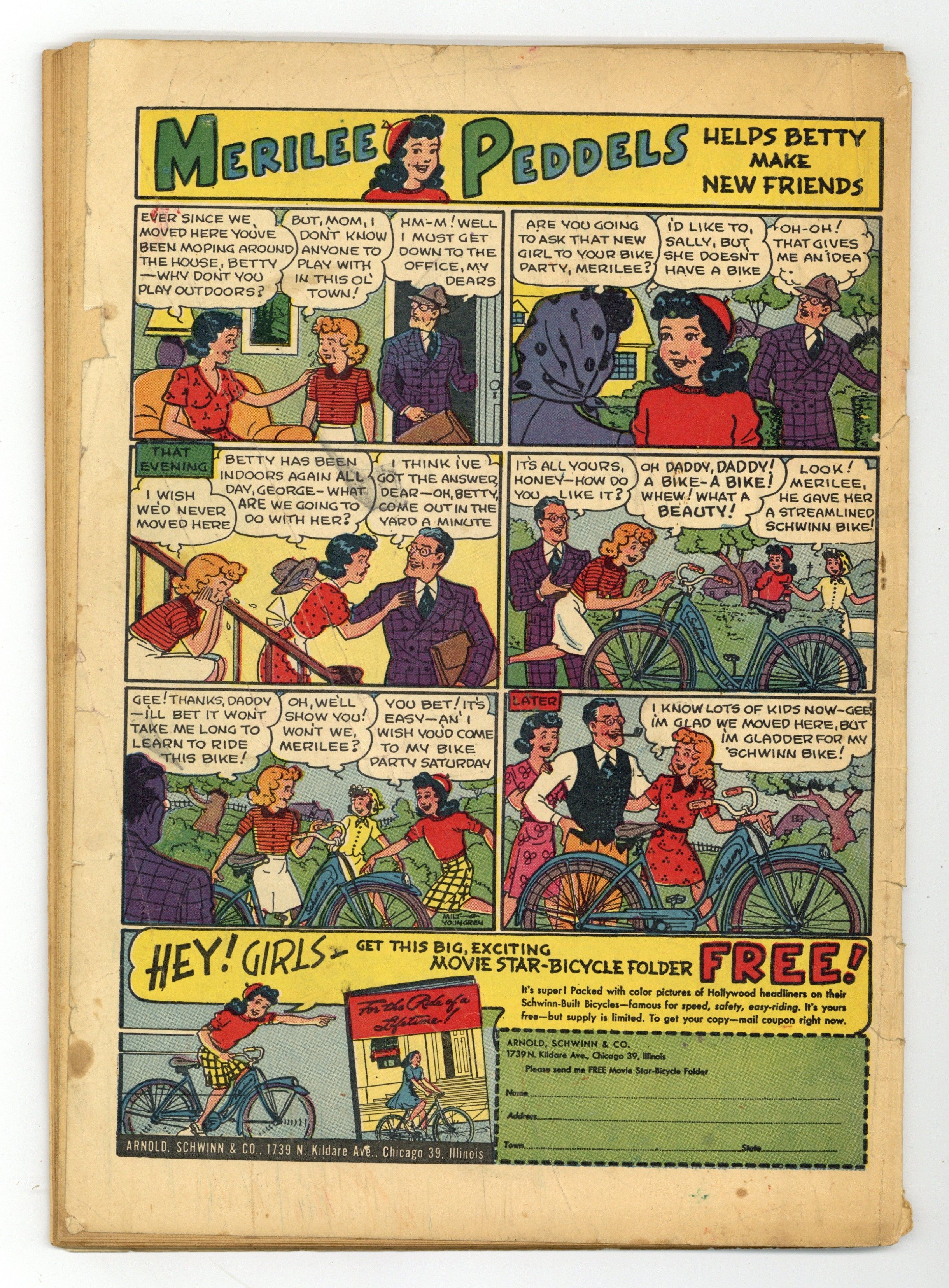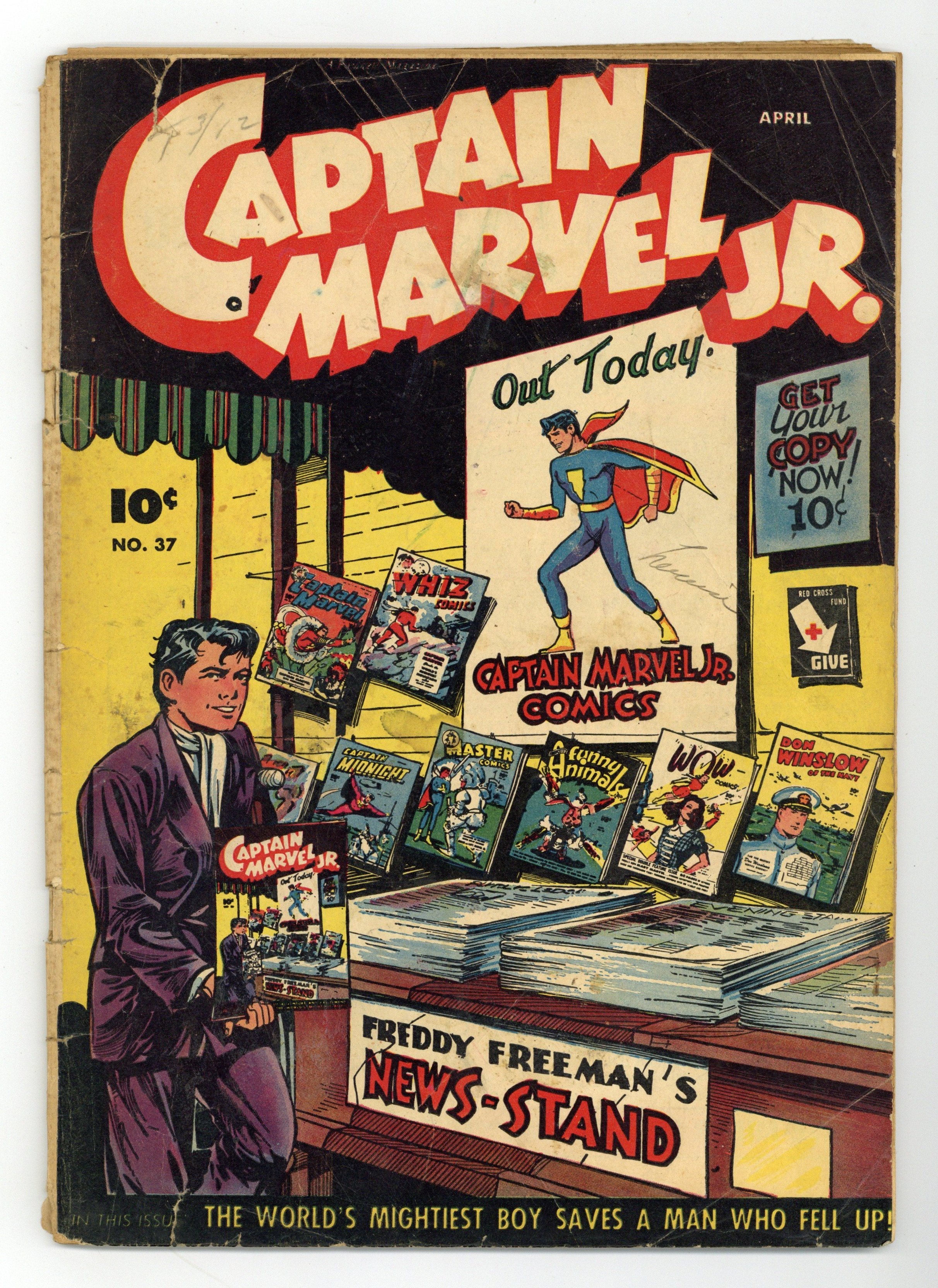 Cover by Bud Thompson. Stories by Otto Binder, Art Helfant and Sid Lazarus. Art by Mac Raboy, Art Helfant, Sid Lazarus and Bud Thompson. Superhero action with Freddy Freeman, who gains the same powers as his hero Captain Marvel, better known these days as Shazam. A fading Hollywood star tries to regain her fame with publicity stunts, but when she and Freddy are kidnapped by gangsters, Freddy convinces her to regain her fame and foil the kidnapping at the same time. Captain Marvel Jr. meets Greybeard, a criminal mastermind whose great age becomes his asset. Marvel Jr. battles a mad scientist whose anti-gravity serum could have all humanity falling up to their doom. "Infinity" cover features Freddy holding this very issue of Captain Marvel Jr., plus other Fawcett comics on Freddy Freeman's newsstand. Captain Marvel, Jr. Sees Stars!; Boxcar Benny; Rubbernose Randolph; Snortville Sneeze: Georgia Gives Birth to an Idea; The Graybeard!; Giggle Gags; The Crime Wave; Colonel Corn and Korny Kobb; Trouble in the Old Mine; The Man Who Fell Up! 48 pages, Full Color. Cover price $0.10.
