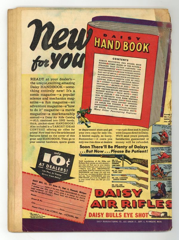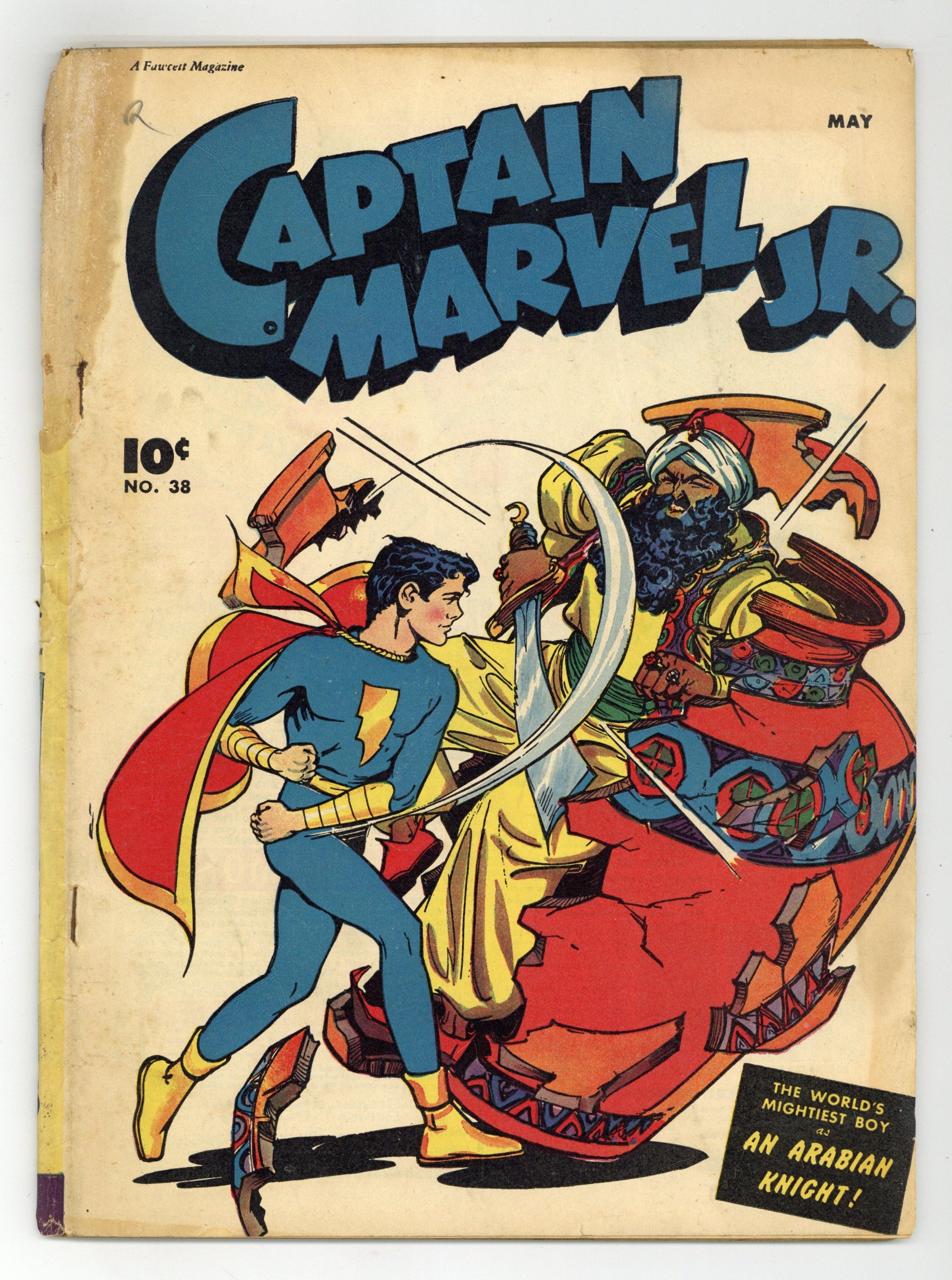 Cover by Bud Thompson. Stories by Otto Binder, Bill Woolfolk, Art Helfant and Sid Lazarus. Art by August Froehlich, Art Helfant, Sid Lazarus and Bud Thompson. Superhero action with Freddy Freeman, who gains the same powers as his hero Captain Marvel, better known these days as Shazam. Captain Marvel Jr. travels to "Arabia" to help a man woo a sultan's daughter with magical gifts. Criminal mastermind Greybeard figures out how to use a dowager's amnesia to steal her fabulous jeweled necklace. Captain Marvel Jr. figures out the connection between opium-related crimes on the waterfront and the stage magician named "Spawn." Captain Marvel Jr. discovers that a Western ghost town has real ghosts. Captain Marvel Jr. Fights the Arabian Knights!; Rubbernose Randolph; Boxcar Benny; The Stolen Half Century!; Whipper-Snappers: Auto Know Better; Rubbernose Randolph Gets in the Swim!; The Magic Act; Giggle Gags: A Close Shave; If the Shoe Fits; Snortville Sneeze; Captain Marvel Jr. Haunts the Ghost Vigilantes! 48 pages, Full Color. Cover price $0.10.