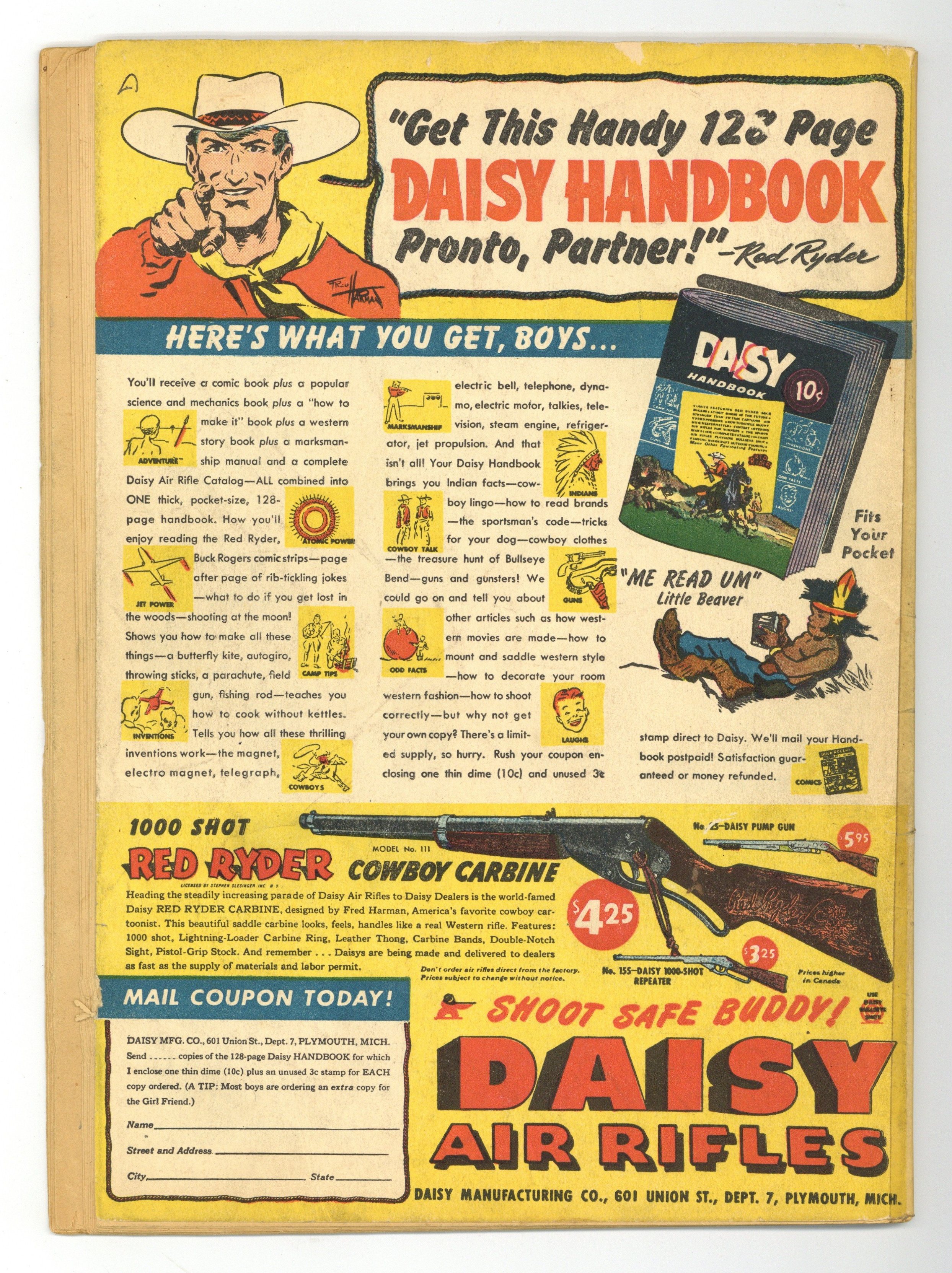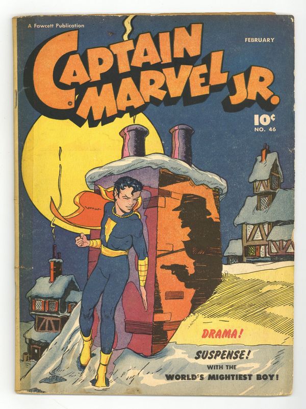 Cover by Bud Thompson. Stories by Otto Binder, Art Helfant¸ Bill Woolfolk and Sid Lazarus. Art by Bud Thompson¸ Sid Lazarus, and Art Helfant. Superhero action with Freddy Freeman, who gains the same powers as his hero Captain Marvel, better known these days as Shazam. When Professor Whittlestick sets out to proves superstitions false, he arouses the wrath of Captain Marvel Jr.'s old foe, the Spirit of Superstition (from issue #42). A Freddy Freeman Christmas story. Plus a vintage Tootsie Roll ad, Captain Tootsie Saves the Sailplane!, by CC Beck and Pete Costanza. Double or Nothing; Rubbernose Randolph; King for a Day!; Boxcar Benny; Snortville Sneeze: The Double Double-Cross; Captain Marvel Jr. Fights Superstition; Freddy Freshman: A Stolen Book; Speculation in Slugs; Freddy Freeman's Xmas! 48 pages, Full Color. Cover price $0.10.