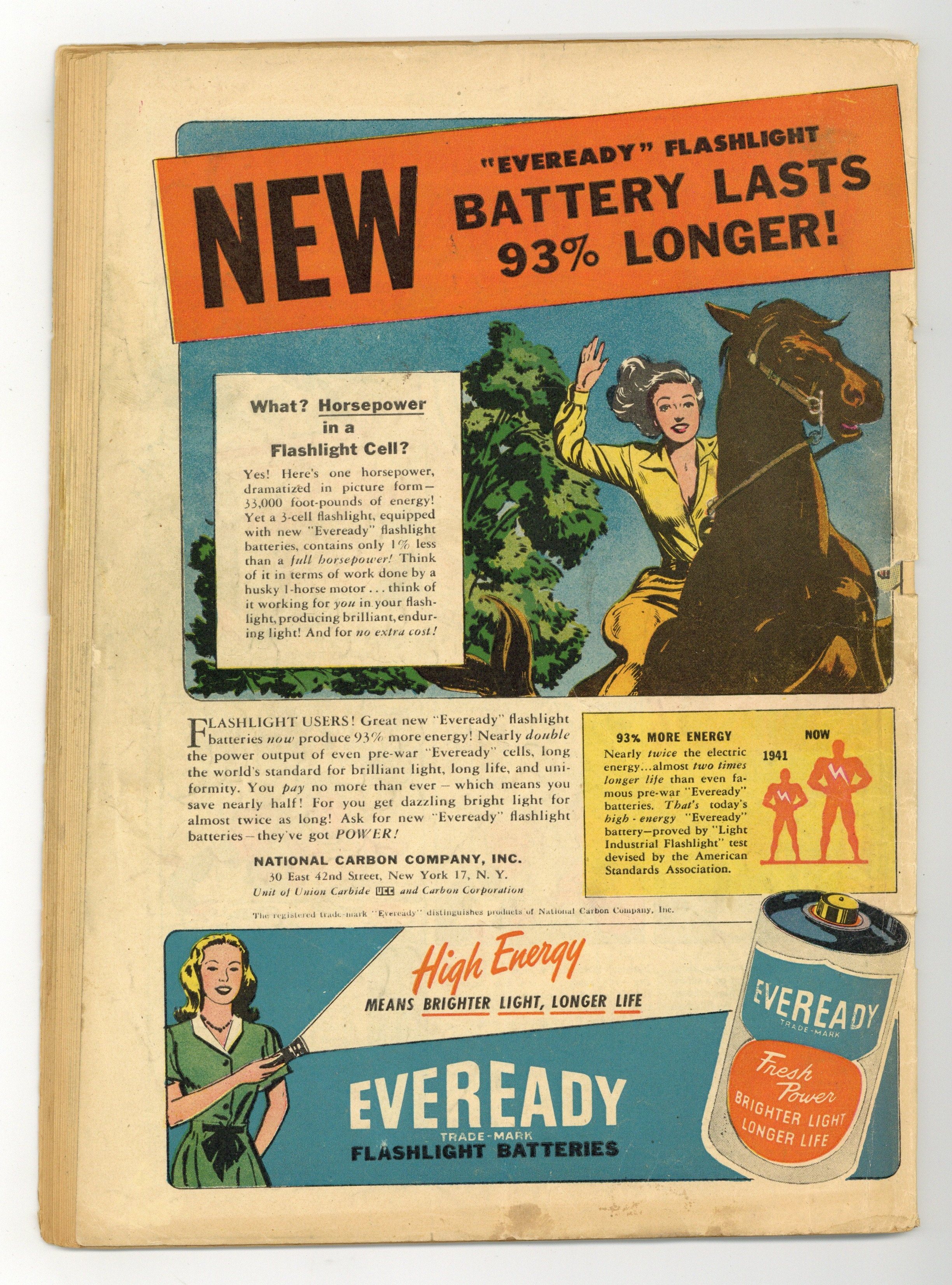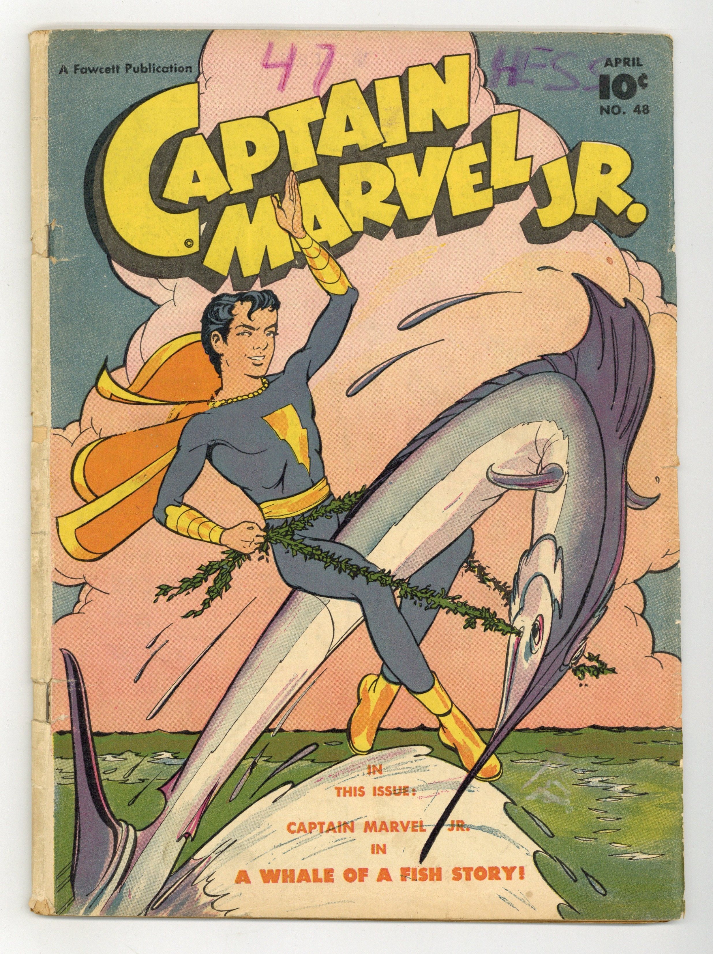 Cover by Bud Thompson. Stories by Otto Binder, Art Helfant¸ Bill Woolfolk and Sid Lazarus. Art by Kurt Schaffenberger¸ Sid Lazarus, and Art Helfant. Superhero action with Freddy Freeman, who gains the same powers as his hero Captain Marvel, better known these days as Shazam. Freddy tries to teach spoiled, wealthy snob Gilbert Tisdale that people are equal in America. Captain Marvel Jr. meets Jumbo the Whale. None Came Back; Rubbernose Randolph: You Can Bank On Him; The Un-American Way; Boxcar Benny: No Butts About It; Captain Marvel Jr. Meets Jumbo the Whale; For the Love of Baseball; Snortville Sneeze: Nautical but Nice; The Drive That Kills; Giggle Gags. 48 pages, Full Color. Cover price $0.10.