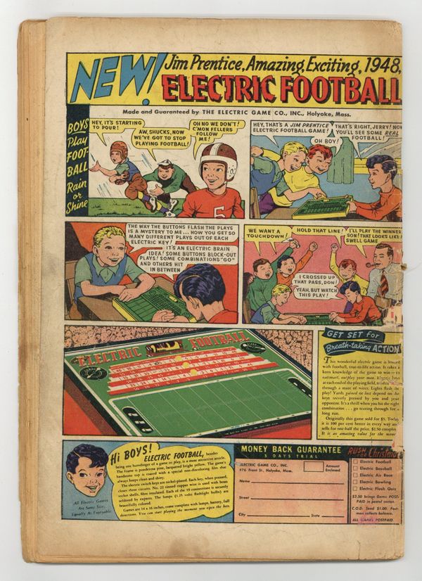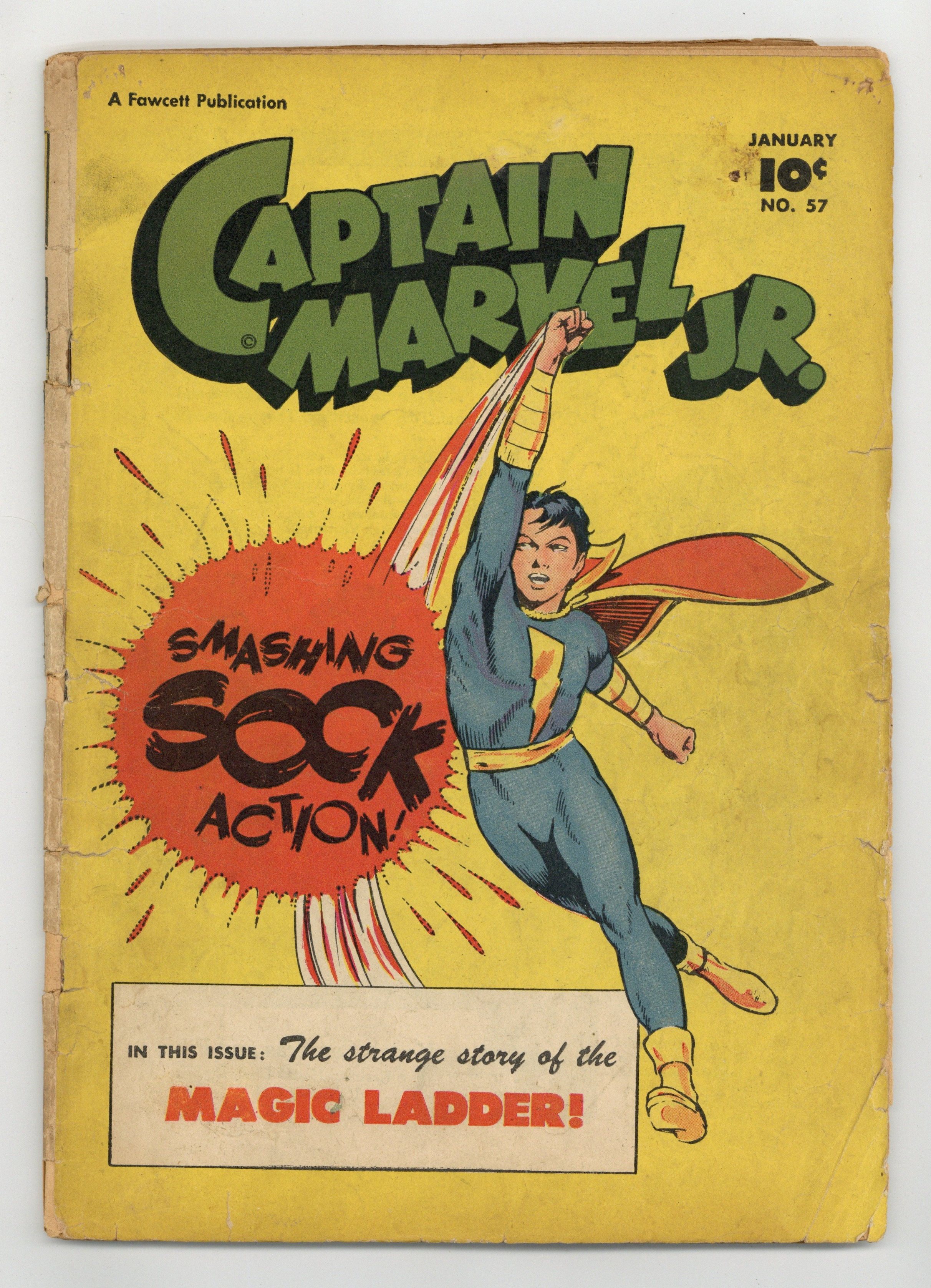 Stories by Otto Binder, Al Liederman, Art Helfant¸ and Bill Woolfolk. Art by Kurt Schaffenberger, Bud Thompson¸ Al Liederman, and Art Helfant. Superhero action with Freddy Freeman, who gains the same powers as his hero Captain Marvel, better known these days as Shazam. A boy finds a magic ladder buried by Oberon, king of the fairies, but it takes him to the sky kingdom of the exiled elves, where only Captain Marvel Jr. can save him. Marvel Jr. seeks the escaped circus performer who becomes the supervillain The Acrobat during a full moon, due to his "moonitis." A washed-up ex-boxer decides to end it all, unless CM Jr. can talk him down, in a story with art by Kurt Schaffenberger. The Magic Ladder!; Boxcar Benny: A Changed Man; Rubbernose Randolph: Stuck Up; Escape of the Acrobat!; Rubbernose Randolph: Uncandid Camera Fiend; Boxcar Benny: A Tip To The Wise!; The Road Back!; He Doesnt Scare Easily!; Jumbo Jones; Kanvasback: The Horizontal Heavyweight; The Lemming Mystery!; Rubbernose Randolph Is Sick of it All. 48 pages, Full Color. Cover price $0.10.