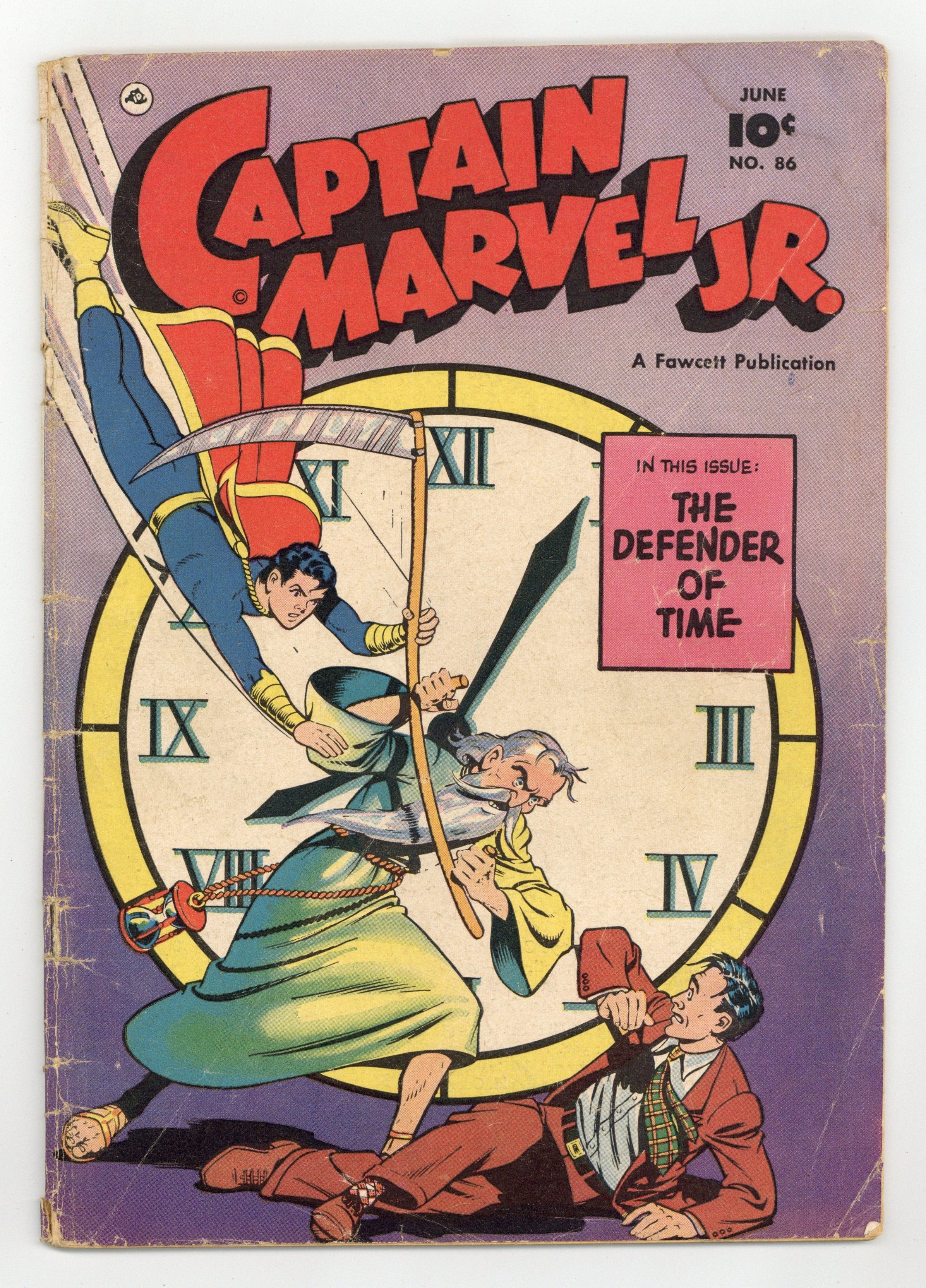 Cover by Kurt Schaffenberger. Stories by Art Helfant, Howard Boughner and Otto Binder. Art by Bud Thompson, Howard Boughner, Art Helfant and Joe Certa. Superhero action with Freddy Freeman, who gains the same powers as his hero Captain Marvel, better known these days as Shazam. Captain Marvel Jr. faces a time-based menace. A mad scientist's latest creation is "crimicillin," which gives criminals the strength to fight the law. The Medical Menace; Murder Clue; Kanvasback: The Black Eye; The Defender of Time; Judge Smudge: Forgetful!; The Golden Eggs; Rubbernose Randolph: Horr-Eye-Ble Accident! 32 pages, Full Color. Cover price $0.10.