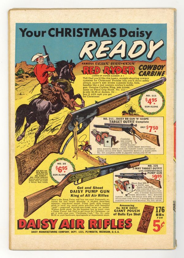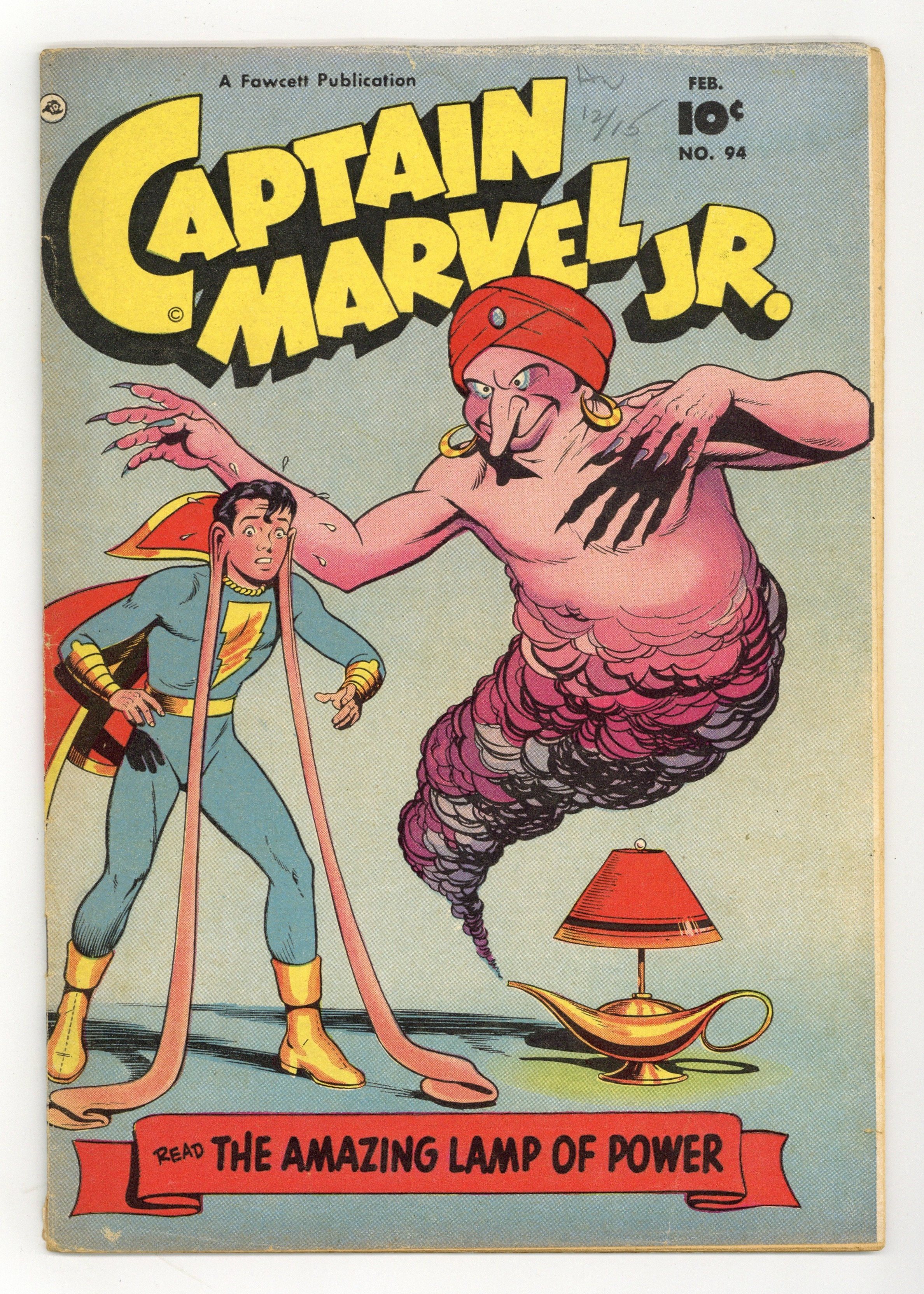 Starts Jan 3 Cover by Kurt Schaffenberger. Stories by Bill Woolfolk, Howard Boughner, Art Helfant and Otto Binder. Art by Bud Thompson, Art Helfant, Howard Boughner and Joe Certa. Superhero action with Freddy Freeman, who gains the same powers as his hero Captain Marvel, better known these days as Shazam. Mrs. Wagner brings home an antique lamp that contains an ill-tempered genie, but even Captain Marvel Jr. can't foresee what happens when she plugs the lamp in to an electrical outlet. A nobody named Hiram Boggs tries to gain a reputation as the head of all the city's criminal rackets, just for fun, but that gets the attention of the real godfather. Kanvasback the boxer explains why he was looking for punctuation in his alphabet soup. The Menace of the Medicine Man; Kanvasback: Food Foolishness; The Lamp of Power; The Copy Cat; Judge Smudge; Rubbernose Randolph; Cook the Crook; The Lord of the Underworld; Movie Mogul Moglethorpe. 32 pages, Full Color. Cover price $0.10.