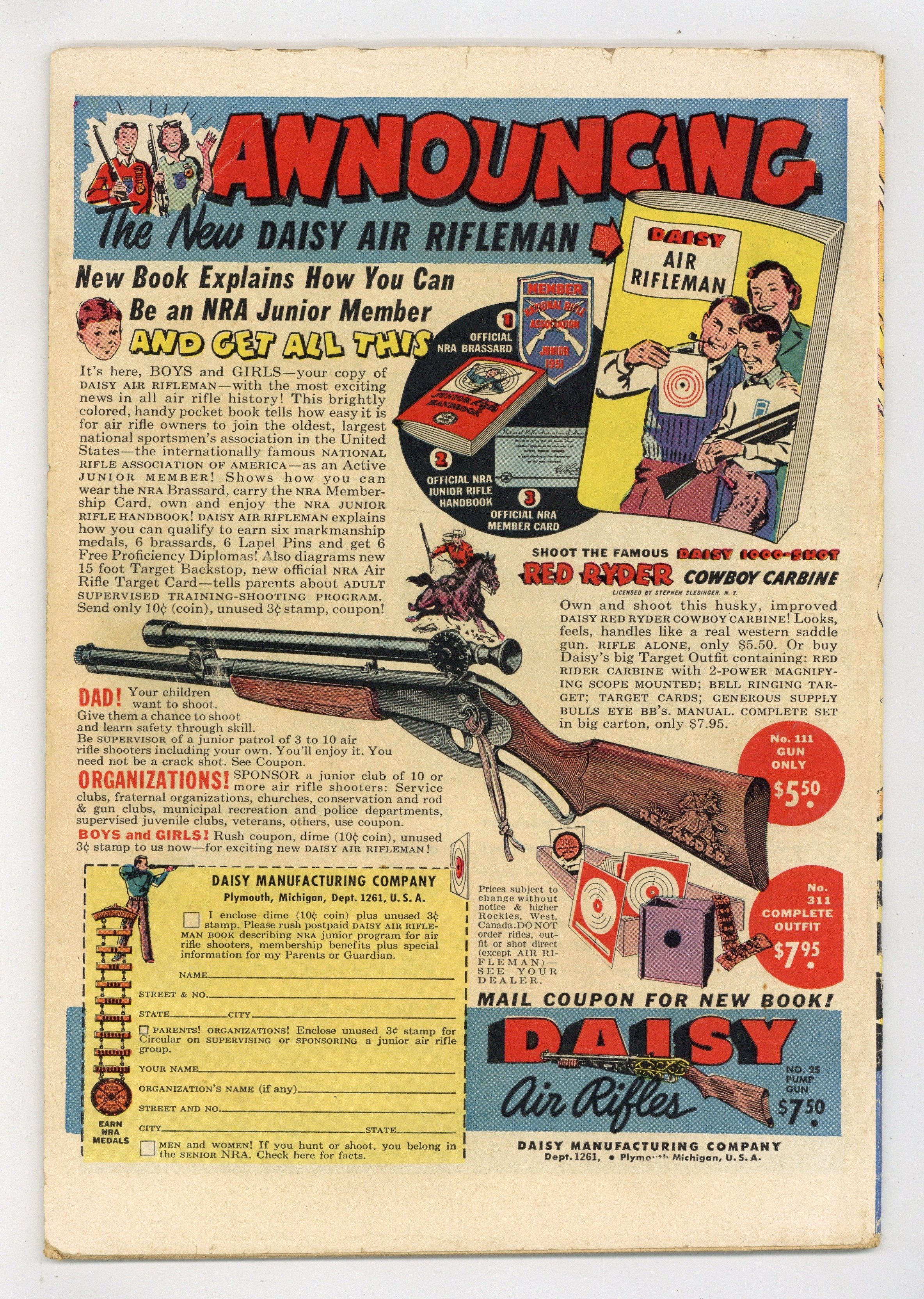 $39.00Cover by Kurt Schaffenberger. Stories by Bill Woolfolk, Howard Boughner, and Art Helfant. Art by Art Helfant, Howard Boughner and Joe Certa. Superhero action with Freddy Freeman, who gains the same powers as his hero Captain Marvel, better known these days as Shazam. Crooks attack the city with the Crime Chariot, a sort of gangster tank that even gives Captain Marvel Jr. a run for his money. A strange hunger overtakes Captain Marvel Jr. and causes him to eat everything in sight. A space-ark of refugees from deep space arrives on Earth. The Crime Chariot; Rubbernose Randolph; Judge Smudge; The Iron Glove Murder; Captain Marvel, Jr.'s Strange Appetite; The Ark From Space; Kanvasback: Cupid's Kayo; The Touch of Life. 48 pages, Full Color. Cover price $0.10.