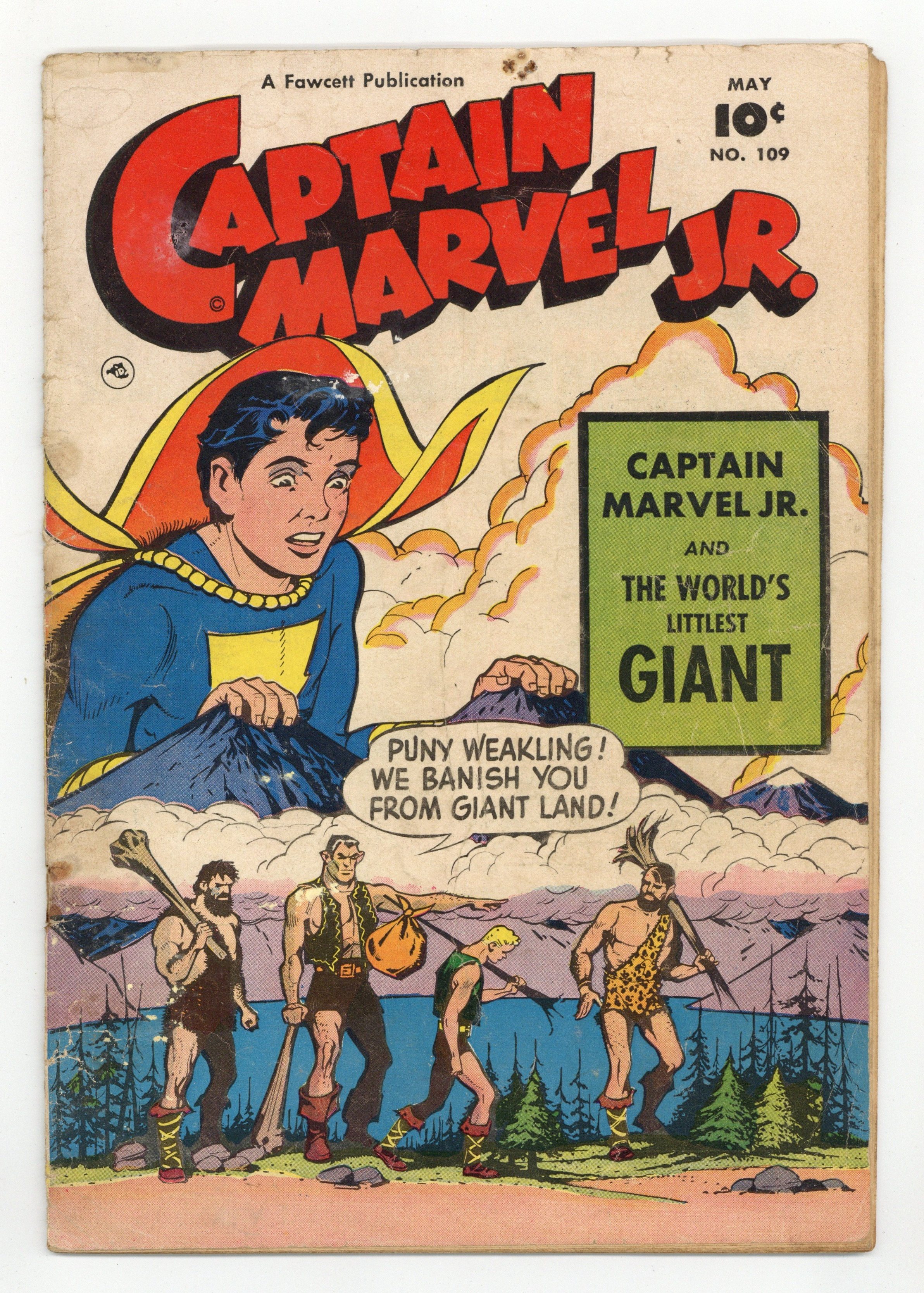 Cover by Bud Thompson. Stories by Bill Woolfolk, Art Helfant and Howard Boughner. Art by Bud Thompson, Art Helfant, Howard Boughner and Joe Certa. Superhero action with Freddy Freeman, who gains the same powers as his hero Captain Marvel, better known these days as Shazam. Captain Marvel Jr. encounters Ybles, an extraterrestrial predator who is hunting, not individual humans, but the planet Earth itself. Seven-foot-tall Sarkum is ejected from Giantland because he's too short, and Captain Marvel Jr. tries to help him regain his stature in the community. A recurring nightmare of being trapped in a fire is actually a warning to Freddy Freeman about the Mad Arsonist. Ybles, The Planet Hunter; Rubbernose Randolph: The Last Resort!; Judge Smudge: Likely Story!; Train Trip; Rubbernose Randolph: Isnt Pig-Headed; Judge Smudge: It Certainly Is!; The Littlest Giant!; Kanvasback: The Bog Bout; The Horrible Nightmare of Freddy Freeman. 32 pages, Full Color. Cover price $0.10.