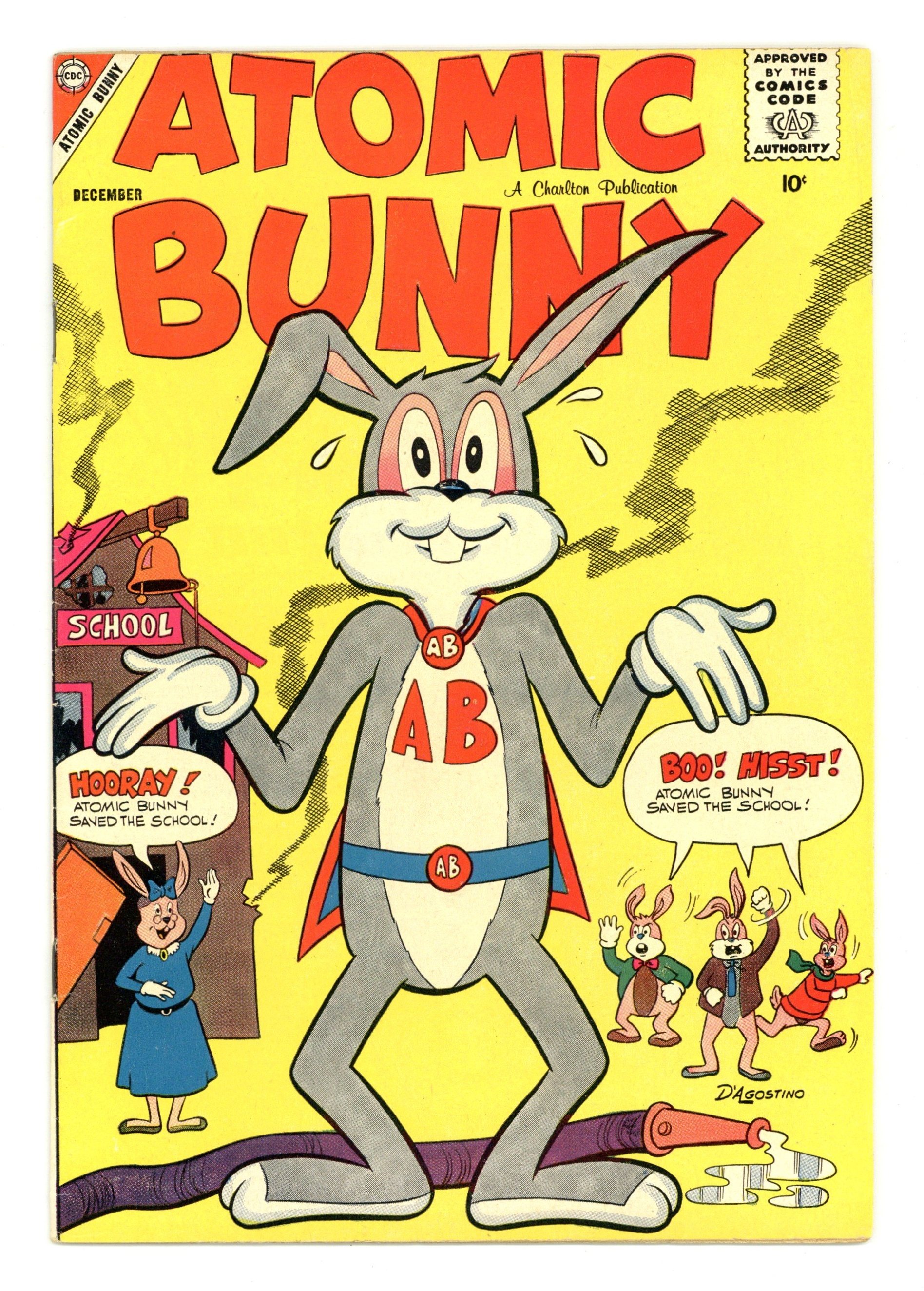 Jon D'Agostino cover features a Bugs Bunny look-alike instead of Atomic Bunny. Two "Atomic Bunny" stories feature Atomic Rabbit instead of Atomic Bunny; Atomic Rabbit's chest initials have been modified to state "AB" instead of "AR". Contains funny animal stories. In order of appearance: "Atomic Bunny, Not a Ghost of a Chance" and "Atomic Bunny, Sly Fox's Trail" art by George Wildman; "Atomic Bunny, The Gift"; "Scandal at Sod Fork" art by George Wildman; and "Atomic Bunny, The Headless Hooligan!". "Darling Deer Demonstrates" illustrated text story. 36 pages. Full color. Cover price $0.10.