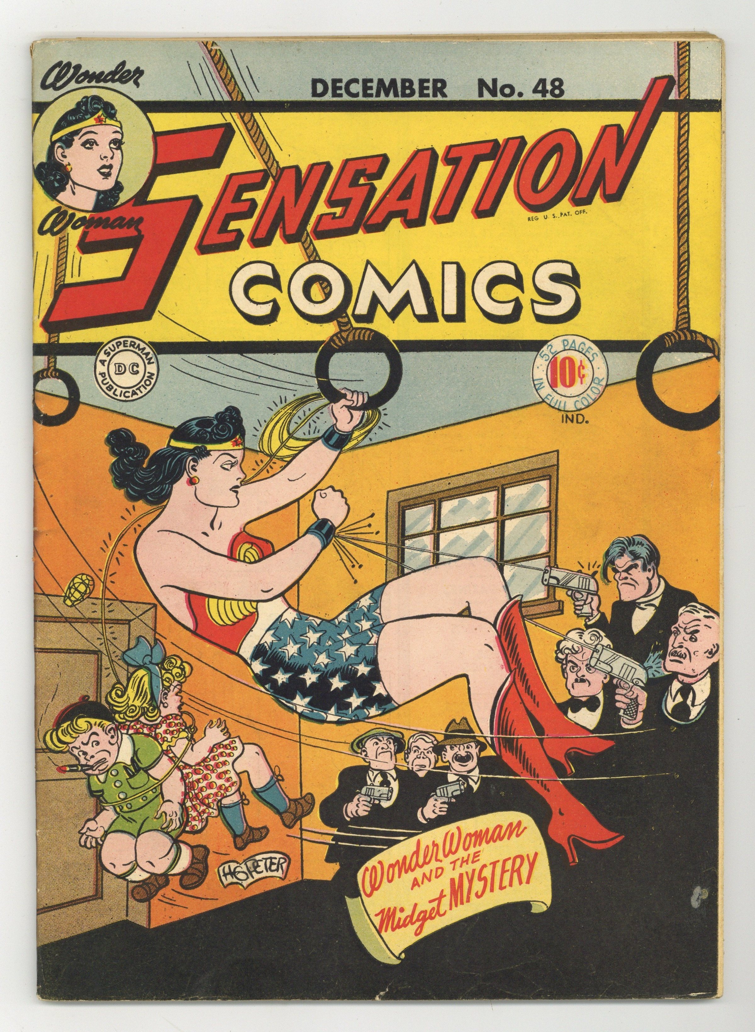 Cover art by Harry G. Peter. Wonder Woman story, art by Harry G. Peter [as H. G. Peter]; Midget crooks commit crimes by pretending to be children. The Ham Leapers--Picture Stories from Mythology, art by Don Cameron. Ghost Trouble--Little Boy Blue and the Blue Boys, art by Frank Harry. Losses Pay A Profit starring Mr. Terrific, art by Stan Aschmeier [as Stan Josephs]. Through Darkest Africa With Stretch Skinner starring Wildcat, art by Joe Gallagher. 52 pgs. $0.10. Cover price $0.10.