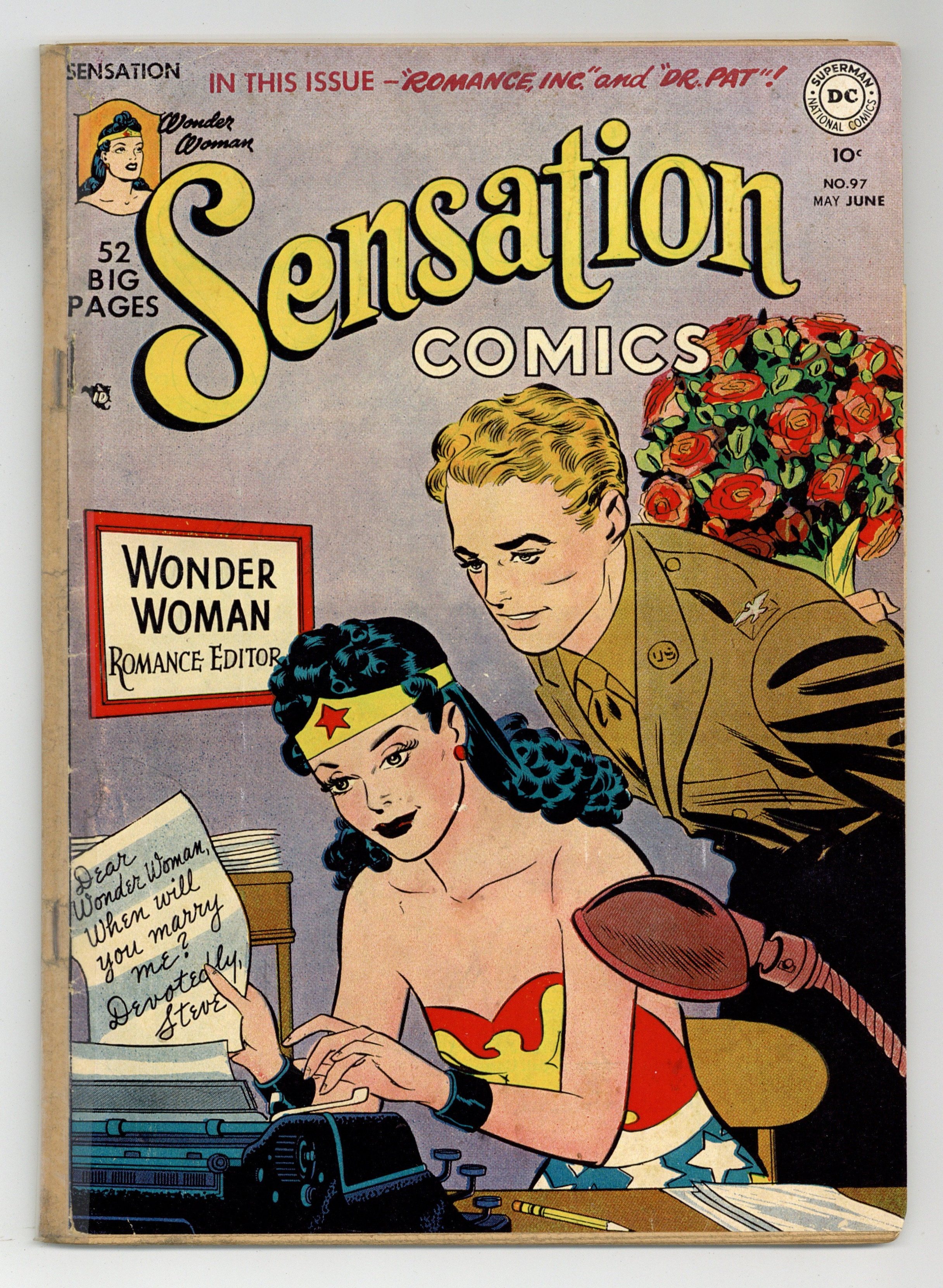 Cover art by Irwin Hasen. Wonder Woman, Romance Editor, script by Robert Kanigher; Readers of the Daily Globe select Wonder Woman to be editor of the Hopeless Hearts column, with the task not only to give advice but actually solve the readers' problems. Headline Heroines story, art by Frank Giacoia. Case of the Absent-Minded Doctor starring Dr. Pat, pencils by Carmine Infantino, inks by Frank Giacoia. Vacation From Love--Romance, Inc., art by Carmine Infantino. 52 pages, full color. Cover price $0.10.