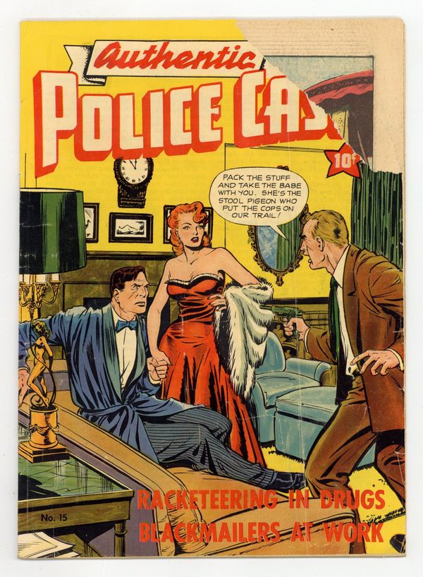 Cover by Matt Baker. Stories and art by Matt Baker, Ray Osrin, Enrico Bagnoli, Ralph Lane and Michael OMalley. Pre-Code crime comics from St. John with an above-average lineup of artists. Bad girl Molly Stamm is the brains behind an international market in stolen "wonder drugs," in a story with art by good-girl art legend Matt Baker. A major gang figure who was going to testify to a Senate committee is murdered in broad daylight on Millionaire Beach by men in scuba gear wielding spearguns. Private eye Vic Flint is hired to find out who is blackmailing wealthy industrialist AJ Mogul. Cover by Baker. Trapping the Triangle Gang; Death on Millionaires Beach; Vic Flint: Blackmailers at Work; Racketeering in Drugs. 36 pages, Full Color. Cover price $0.10.