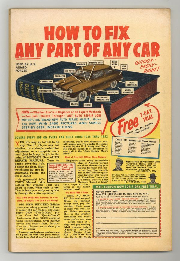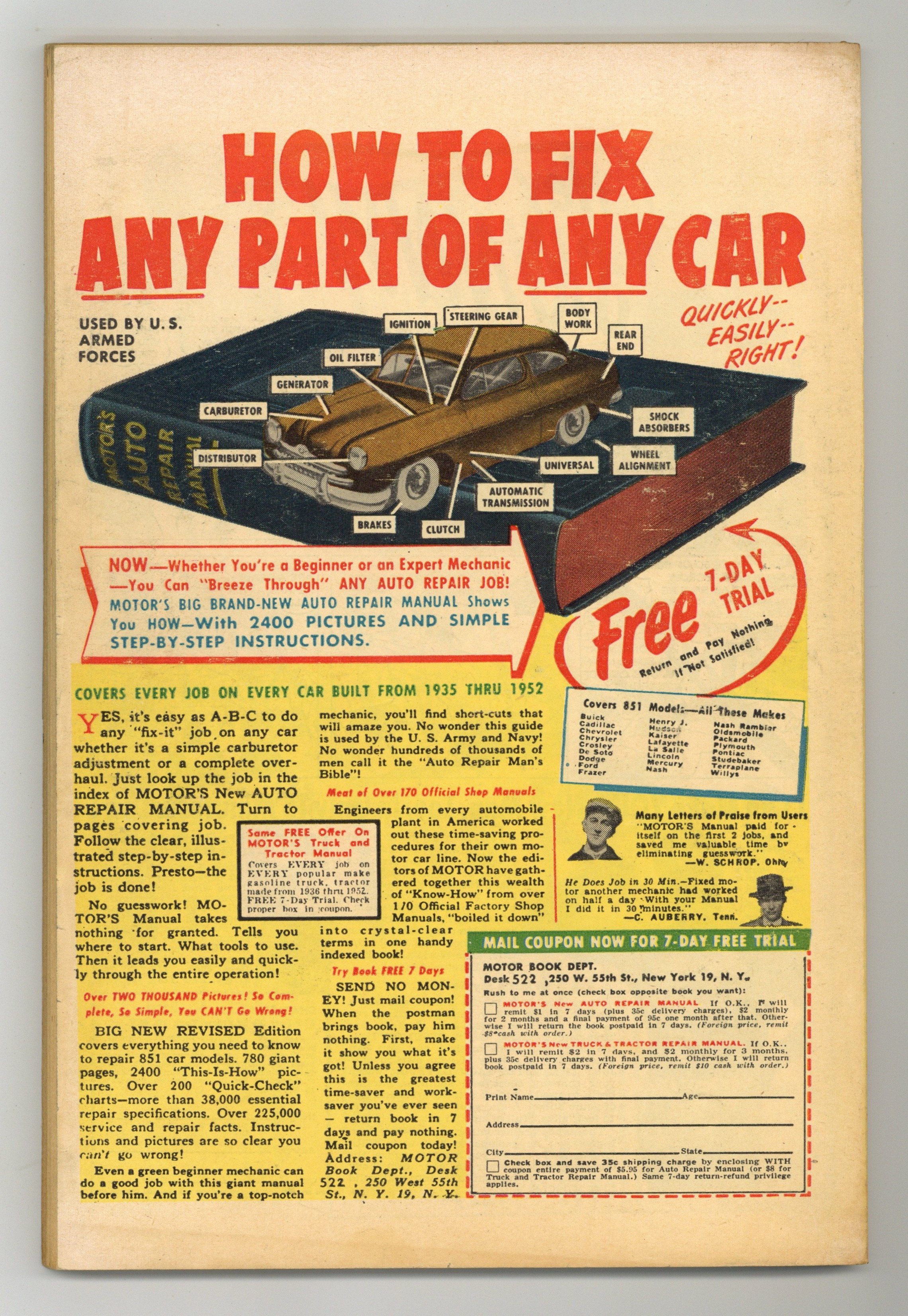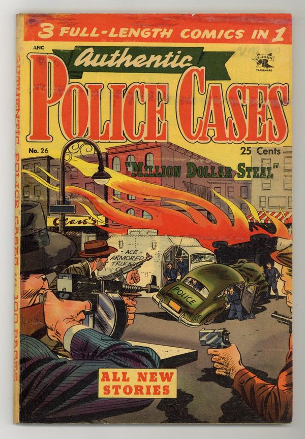 Stories and art by Antonio Canale, Mario Norberto Leone, Enrico Bagnoli, Michael O'Malley¸ Ralph Lane, and Bill Molno. Pre-Code crime comics from St. John with an above-average lineup of artists. 100-page giant. Lou Terril and his gang set their sights on a million-dollar pension payroll... but is it all just a trap set by the cops? Private eye Vic Flint is hired to keep wealthy murder witness Monte De Carlo alive, but he has no such deal with the hoodlums Peewee and Egghead. Blackie becomes an expert at a particular skill: torching buildings for the insurance money. Million Dollar Steal; Vic Flint: The Case of Kid Slick; Confessions of a Police Informer; Vic Flint: Blood on the Snow; Arson Expert; The Final Proof; Last Cruise of the Ibex; Murder by Appointment; Ups and Downs in Crime; Hit and Run; Plunder on Patrol; Gag Bag; The $80,000 Stick-up; 3 Dimes; The Tough Guy; Comedy Column. 100 pages, Full Color. Cover price $0.25.