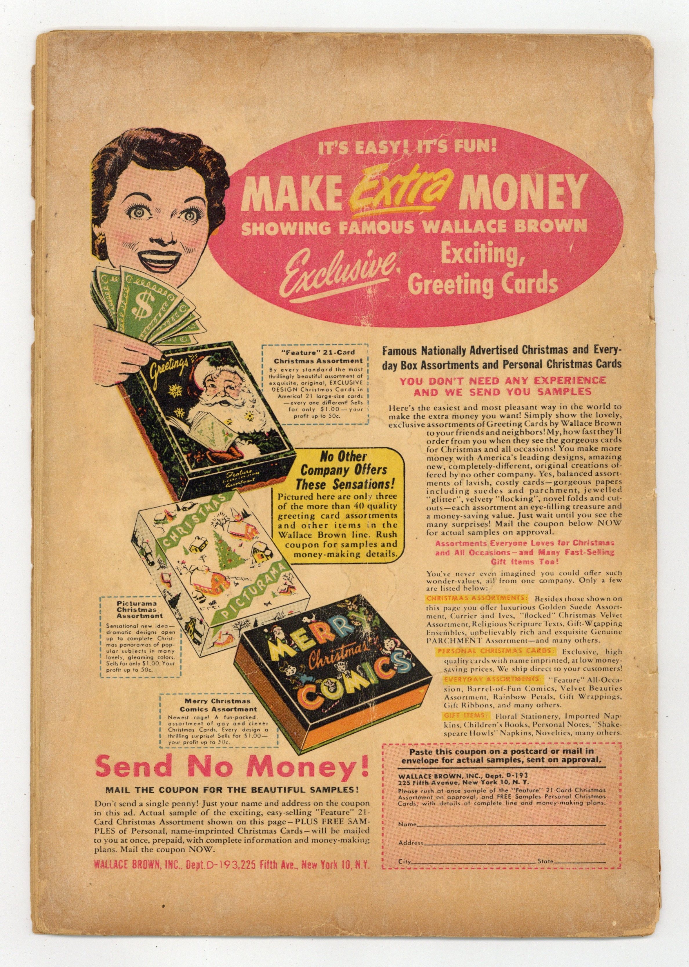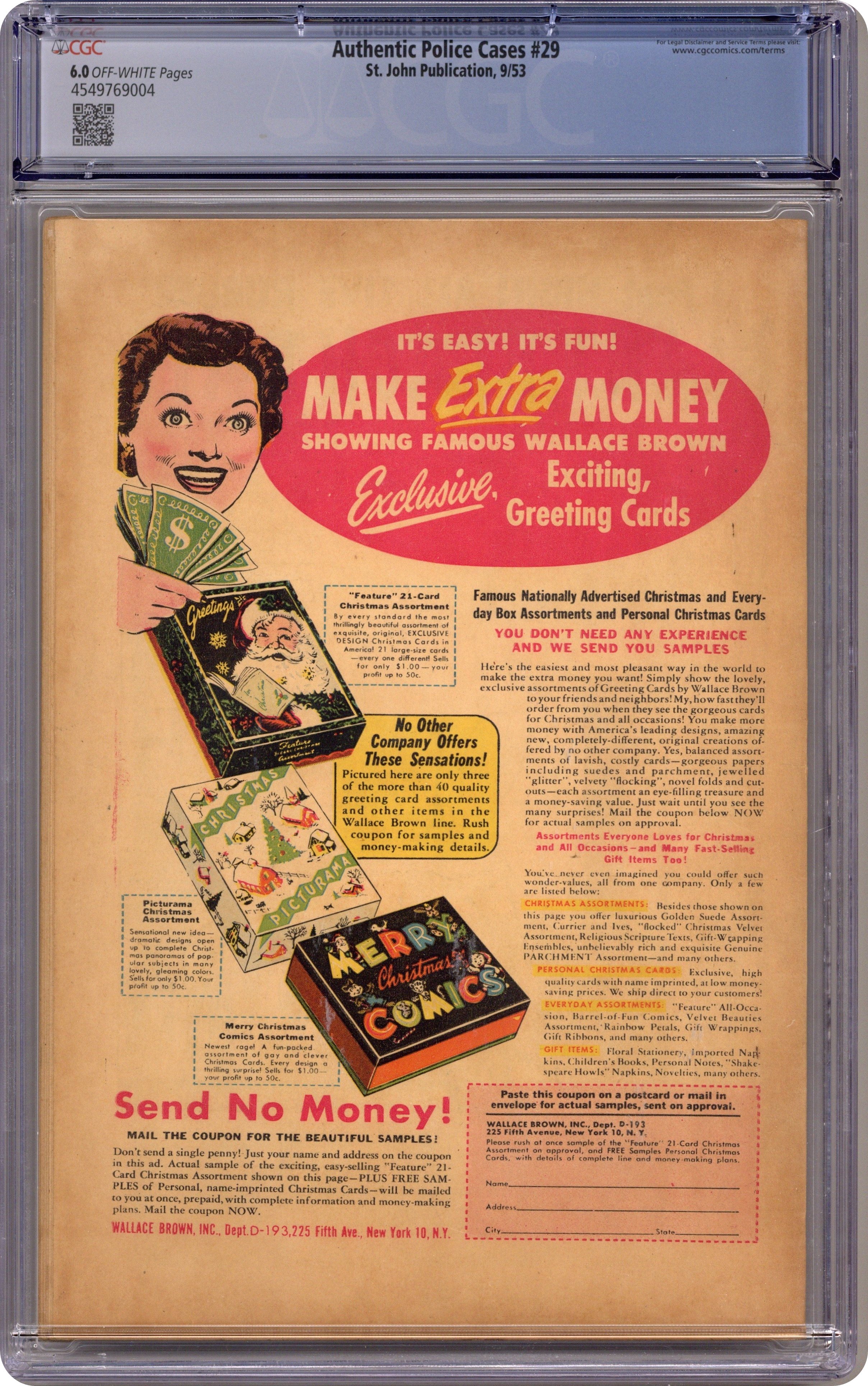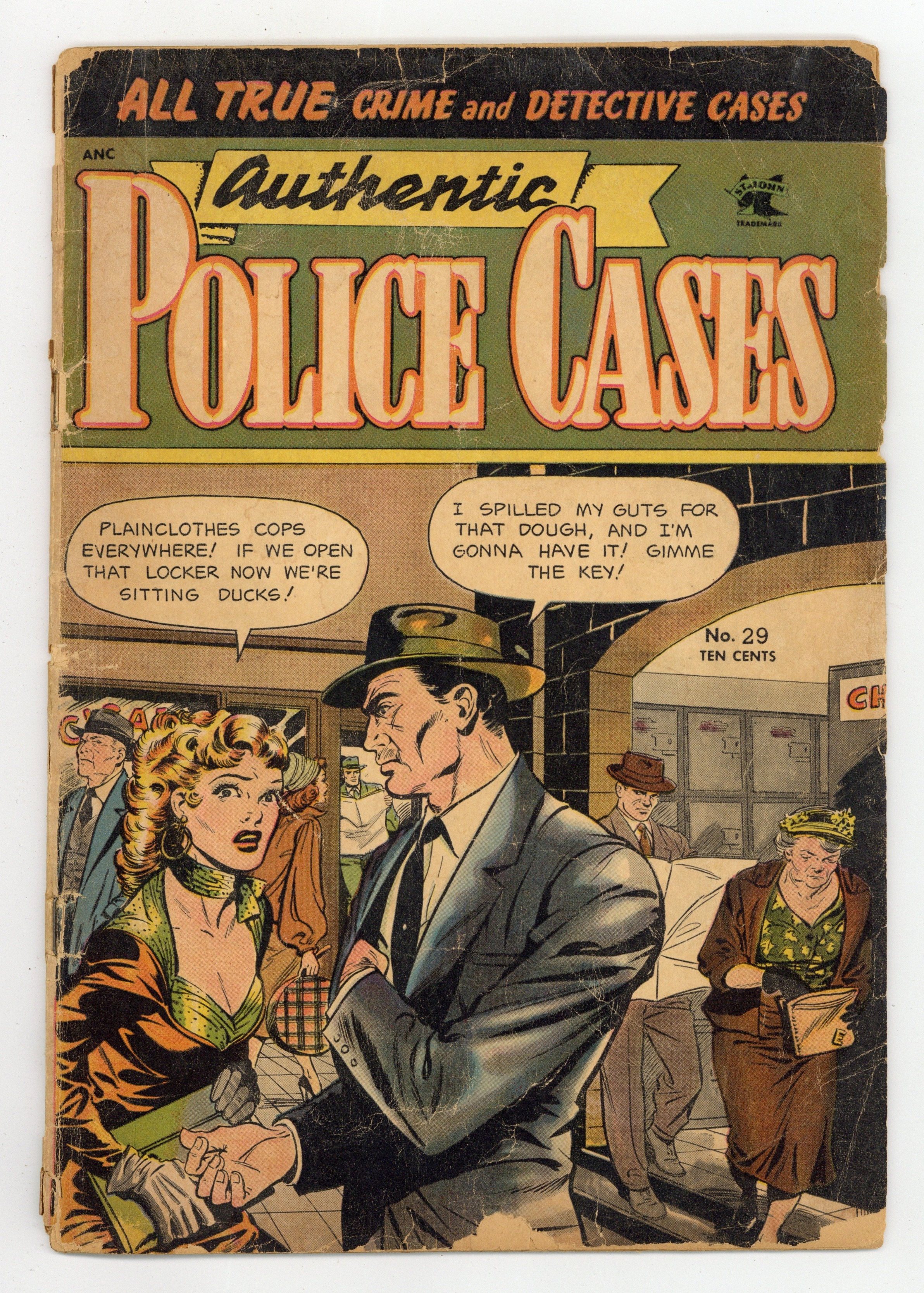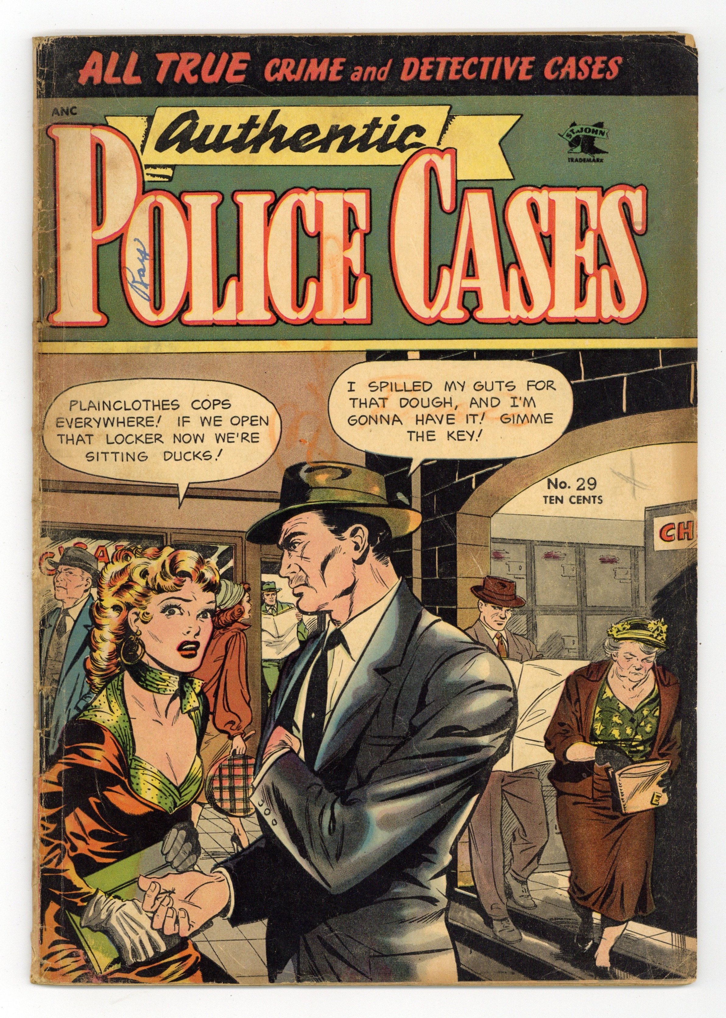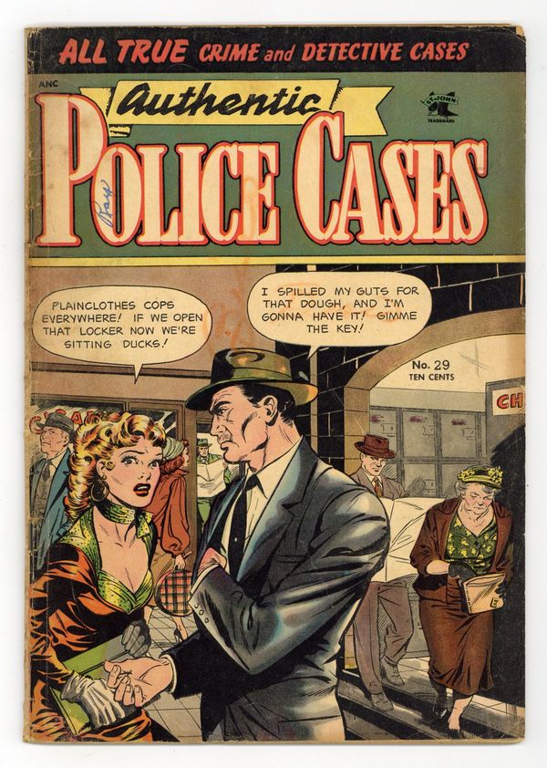 Cover by Matt Baker. Stories and art by Antonio Canale, Enrico Bagnoli, and Ralph Mayo. Pre-Code crime comics from St. John with an above-average lineup of artists. A farmhand named Joe goes to the big city - Chicago - where he falls in with the Mob and becomes a hired killer. A cop goes undercover as a night watchman to get the goods on a robbery gang. Armored-car hijackers count on a thick fog to disguise their watery escape. Cover by good-girl art legend Matt Baker. Killer from Hicksville; Foremost Fugitive; A Dangerous Job; Hard-Luck Lefty; Escape by Water; Every Crooks a Loser; When Ex-Cons Meet! 36 pages, Full Color. Cover price $0.10.