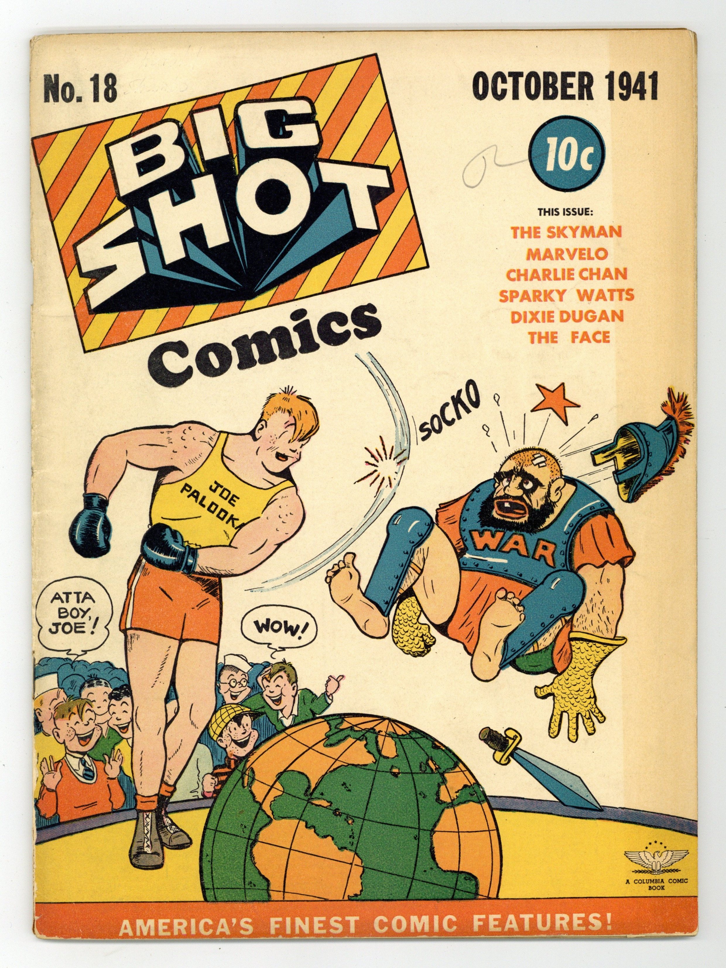 Stories and art by Boody Rogers, Ogden Whitney, Ham Fisher, Ray McGill, J. P. McEvoy, John Striebel, and Alfred Andriola. Big Shot featured reprints of McNaught Syndicate humor and adventure strips, alongside original characters like Skyman and The Face. Doc Static's cure for Sparky's sudden microscopic shrinking has the side-effect of giving Slap Happy super-powered feet. Marvelo the Magician and his assistant Zee join Commodore Crank's yacht for a Caribbean cruise, but someone doesn't want them on board. Charlie Chan tries to prove Eric innocent of being the deadly Rockingham Bandit before the real Bandit gets to him. Skyman; Sparky Watts; Captain Devildog; Joe Palooka; Spy-Chief; Charlie Chan; Rocky Ryan; Dixie Dugan; Marvelo; The Face; Oliver Drab. 64 pages, Full Color. Cover price $0.10.