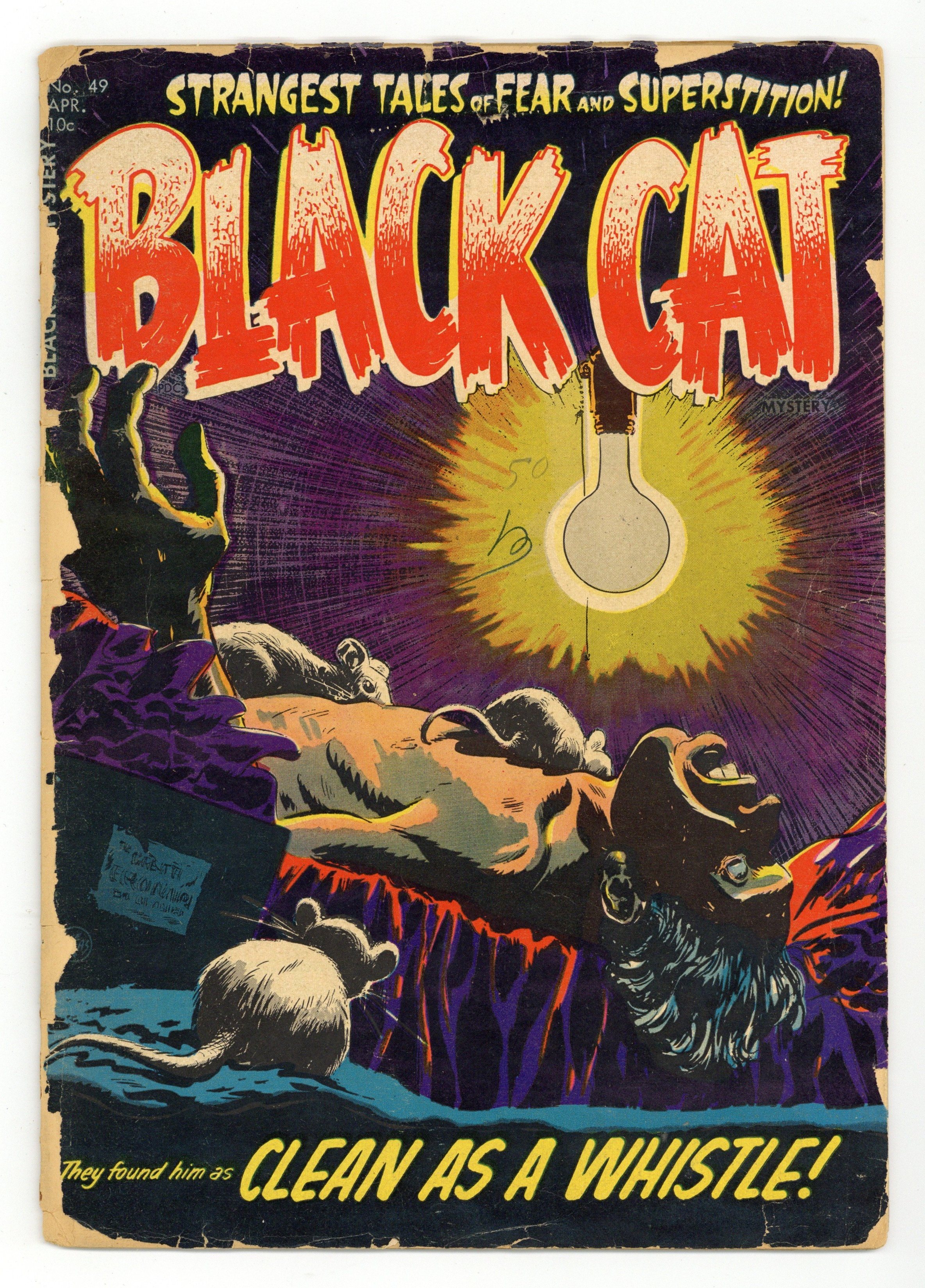Cover by Lee Elias. Stories and art by Bob Powell, Howard Nostrand, John Giunta and Joe Certa. Former superhero comic Black Cat becomes a showcase for Harvey's unique brand of pre-Code horror. Henpecked Abner contends with his domineering wife over their shared bathroom, until one day Abner just snaps. A dark spoof of The Three Musketeers finds the sinister Milady with a secret advantage against the heroes. A harried businessman is tormented by letters from Death, promising an impending meeting. Clean As a Whistle; The Three Musketeers; Paranoia; A Promise Kept. 32 pages, Full Color. Cover price $0.10.