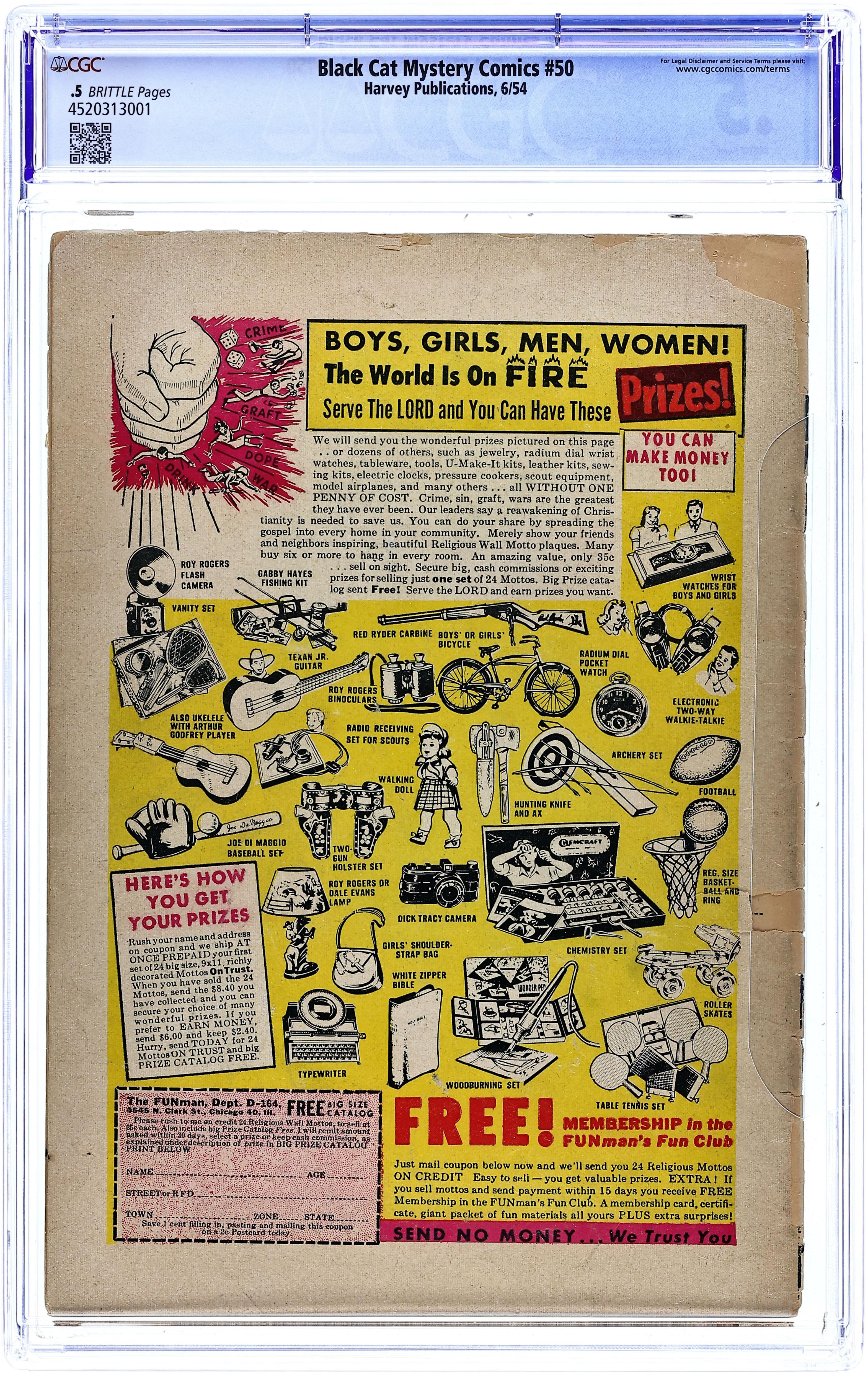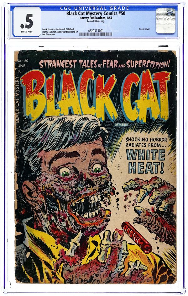 Cover by Lee Elias. Stories and art by Bob Powell, Howard Nostrand, Manny Stallman, John Giunta Joe Certa, John Belfi, Sid Check and Frank Frazetta. Former superhero comic Black Cat becomes a showcase for Harvey's unique brand of pre-Code horror. A man is stealing corpses form the cemetery, and the townspeople want to know why. A dark spoof of the movie Mogambo, an experiment in the Mad-style humor that resulted in Harvey's short-lived comic Flip. A mysterious visitor to a small town has plans of revenge against the town elders, in a story with early inking assists by fantasy art legend Frank Frazetta. Notorious pre-Code cover by Lee Elias, showing a man's face and hands burning away, is one of the most famous of the era. The King Is Dead; The Artificial Sky; Occupation; Moe Gambo; White Heat; And Still Champion; Torture!; Here Today…. 36 pages, full color. Cover price $0.10.