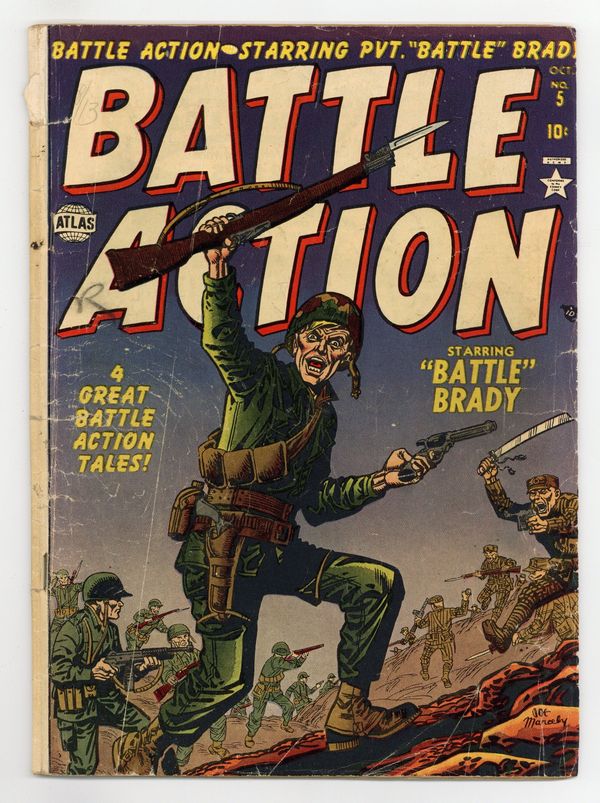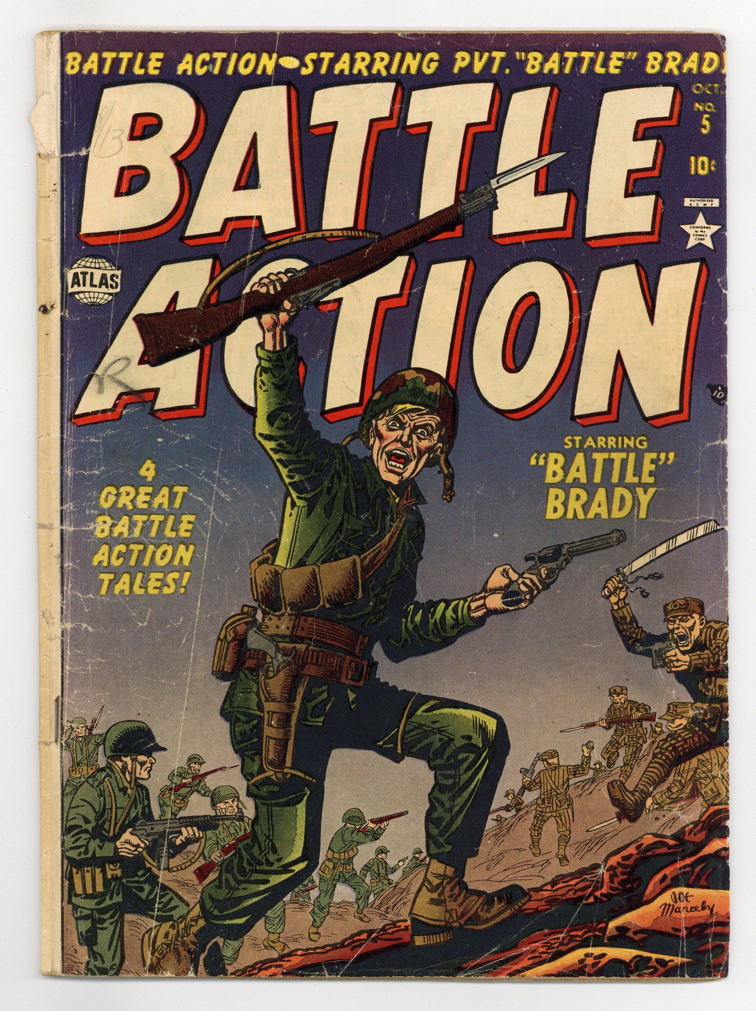 $25.00Battle Brady in two untitled stories (scripts by Hank Chapman, art by Joe Maneely), plus "Night Patrol" (art by Norman Steinberg), "The Sniper" (art by Vern Henkel), and a two-page text story, "Too Old To Die." Used in Parade of Pleasure by Geoffrey Wagner. Maneely cover. Cover price $0.10.
