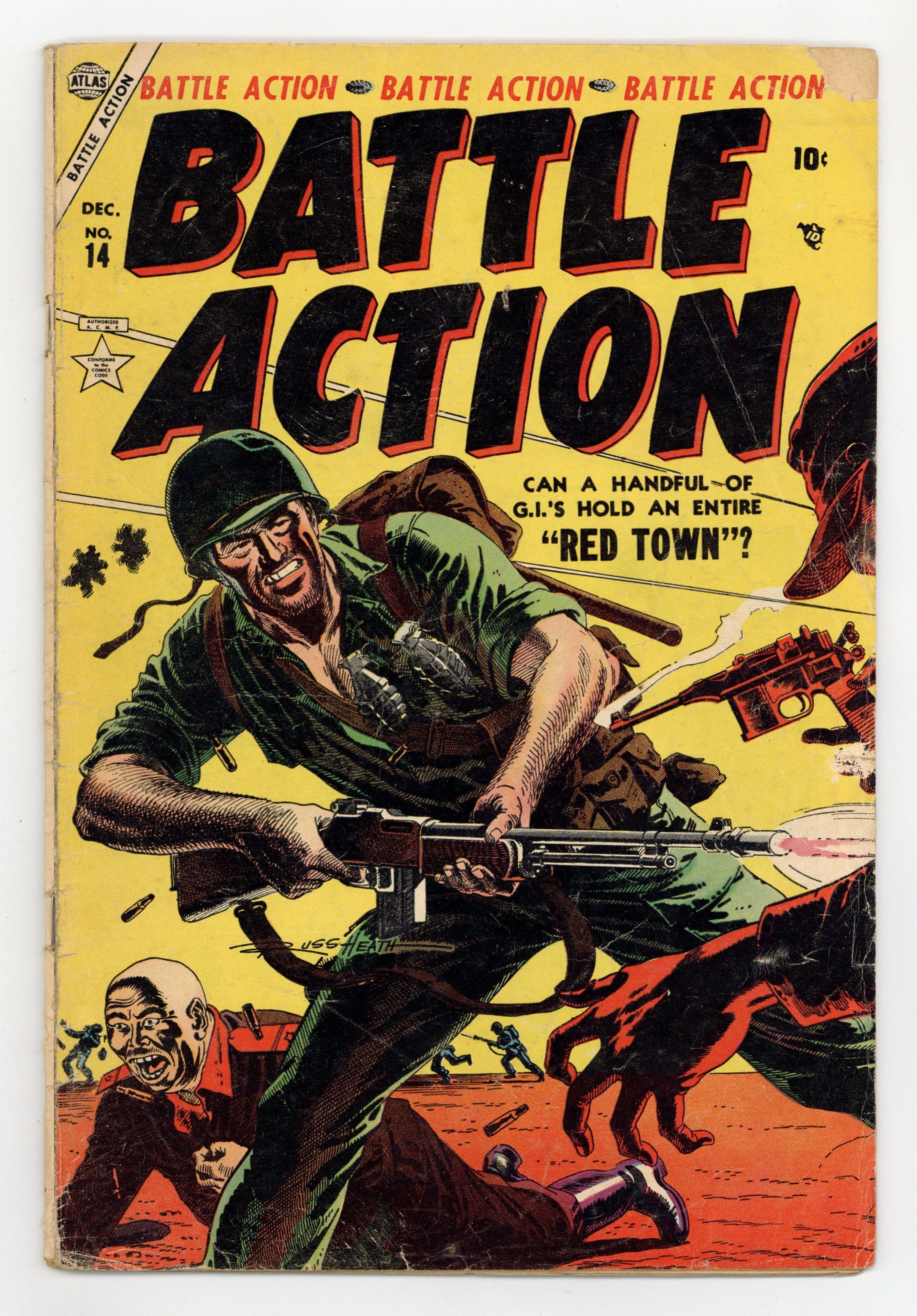 "The Town" (art by Russ Heath), "21 Days" (art by Syd Shores), "Anthem," "The Serbs" (art by Dick Ayers), and a two-page text story, "The Signal." Heath cover. Cover price $0.10.