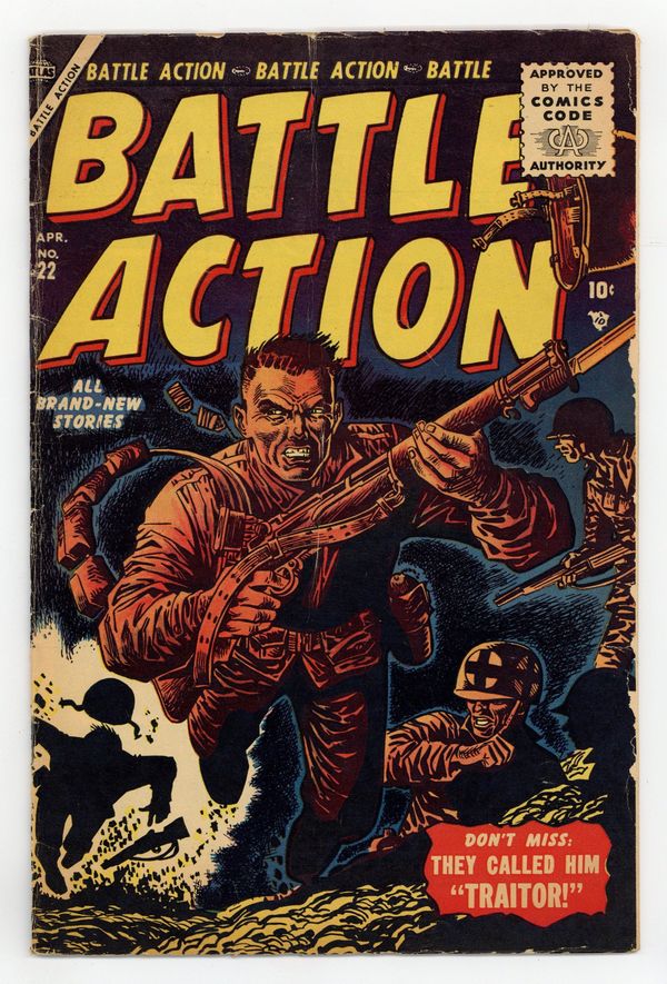 $35.00Cover art by Joe Maneely. The Best Laid Plans, art by Gene Colan. Swamp War text story. The Yank from Kentucky, art by Chuck Miller. The Army that Wouldn't Be Beaten! starring General Zachary Taylor. They Called Him "Traitor!", art by Mac L. Pakula. Outnumbered!, art by John Romita. 32 pgs. Cover price $0.10.