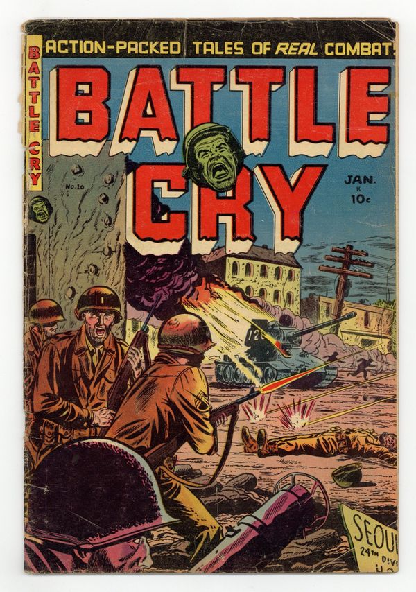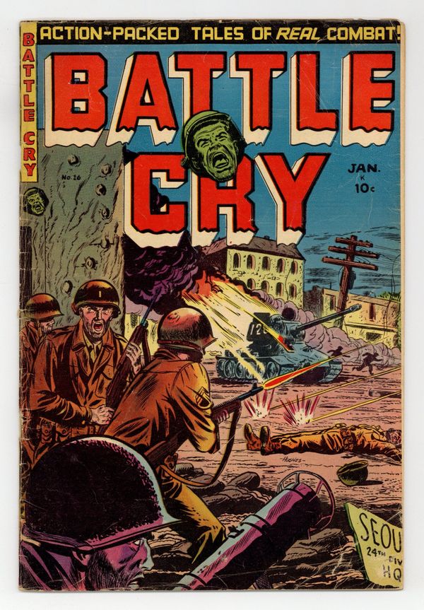 Cover by Eugene Hughes. Stories and art by Eugene E. Hughes and Bernard Baily. War comics from publisher Stanley Morse in the tradition of EC's war comics. A day in the life of a weary platoon sergeant during WWII. Soldiers find extremes of weather add to the dangers of combat during every season of the year. Geronimo's leadership in the Apache Wars wins respect from his enemies and makes his name a household word in America. Platoon Sergeant; The Four Seasons; Carbine!; Leadership!; Famous Battle Cry Series: Geronimo! 32 pages, Full Color. Cover price $0.10.