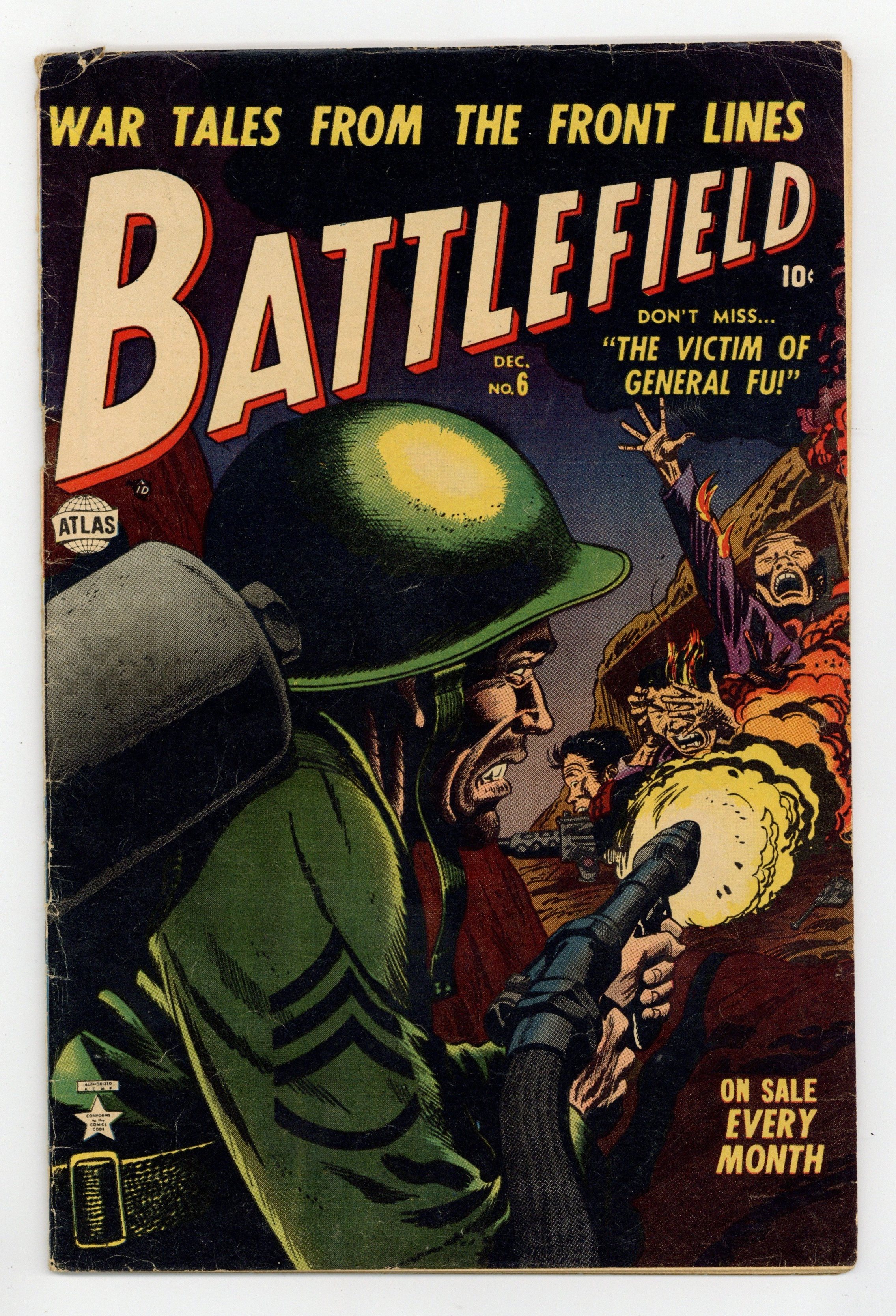 Cover by Russ Heath. "The Victim of General Fu!", script by Don Rico, art by Paul Reinman; Tracy must warn his company of the mine field they are about to enter. "The Secret of Sabotage" two-page text story. "T.O.T.--Time On Target," script by Paul S. Newman, art by Jack Keller; Lt. Rowlans needs to keep the Reds bottled up for five more minutes until the artillery can destroy them. "Massacre At Manghowon!", art by Ed Robbins; By using pumpkin gourds an American patrol is able to sneak up on a North Korean unit that has occupied a friendly village. "Race Against Death!", art by Jay Scott Pike; PFC Judson must race thru the Red lines to find help for his men. 36 pgs., full color. Cover price $0.10.