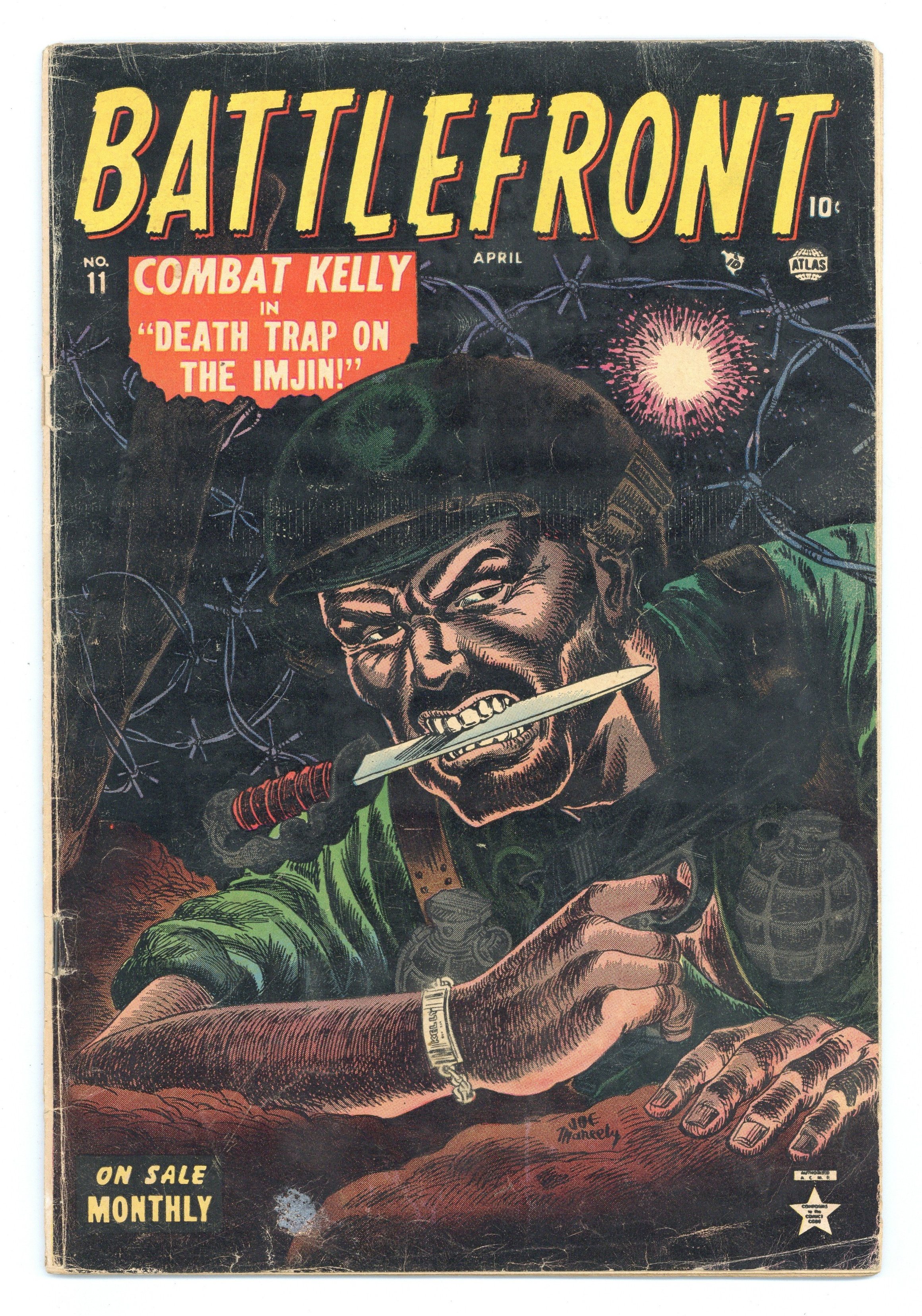 Cover by Joe Maneely. Written by Hank Chapman and unknown. Art by Dave Berg, Joe Sinnott, Mike Sekowsky, Cal Massey and unknown. Combat Kelly stars in an untitled story (cover has the title as "Death Trap on the Imjin!") by Hank Chapman and Dave Berg. Plus: "The King!" with art by Joe Sinnott; "The Outsider!" with pencils by Mike Sekowsky; "3 Day Pass" with art by Cal Massey; and 2-page text story "The Marine Sinks a Sub"! 36 pages, full color. Cover price $0.10.