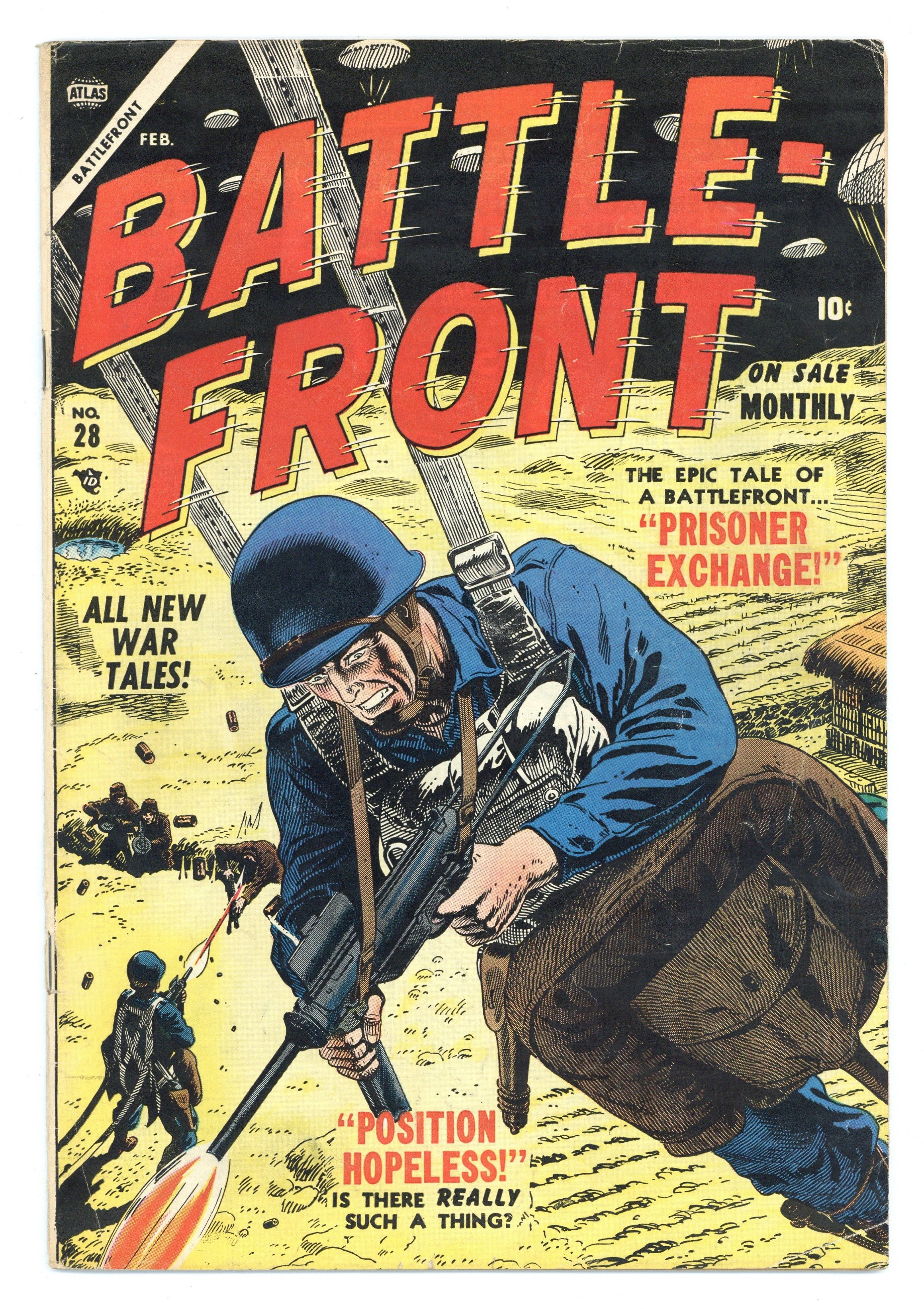 $46.00Cover by Russ Heath. Written by unknown. Art by Mort Drucker, Dick Ayers, Mort Lawrence, Werner Roth, Ernie Bache and Bob Forgione. All new war tales! Don't miss the epic tale of a battlefront..."Prisoner Exchange" with art by Mort Drucker. Then, is there really such a thing as..."Position...Hopeless!" with art by Dick Ayers and Ernie Bache. Also in this issue: "The Defenders!" with art by Mort Lawrence; "Velletri!" with art by Werner Roth; and 2-page text story "Lone Mission!" with art by Bob Forgione. 32 pages, full color. Cover price $0.10.