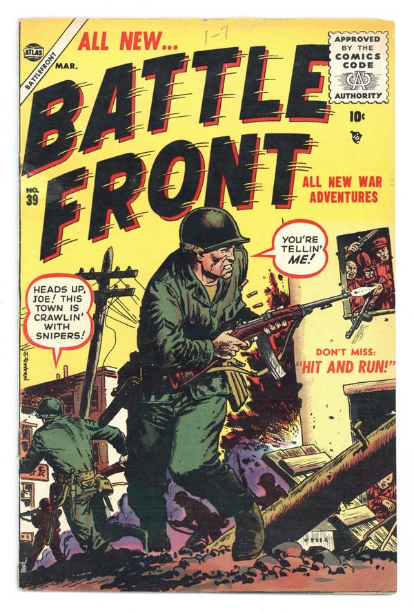 Cover by John Severin. Written by unknown. Art by Gene Colan, Bob Forgione, Dick Ayers, Robert Q. Sale and Syd Shores. All new war adventures! Featuring: "Hit and Run!" with art by Gene Colan; "Bazookas...Attack!" with art by Bob Forgione; "On Flanders' Fields!" with art by Dick Ayers; "The Marksman!" with art by Robert Q. Sale; The Fight for Freedom! tale "Men Without Masters" with art by Syd Shores; and 2-page text story "Besieged"! 32 pages, full color. Cover price $0.10.