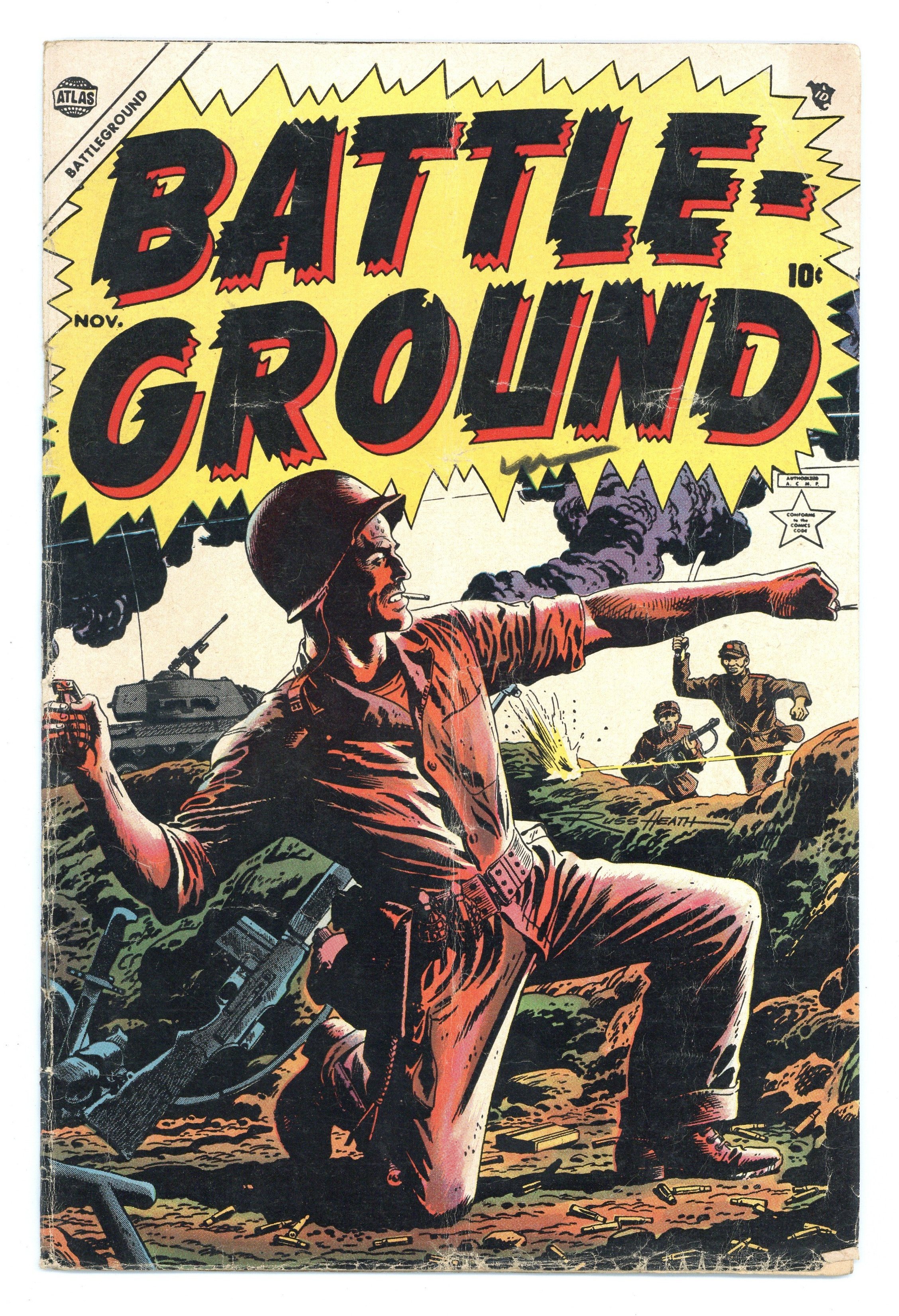 "Wonsan" (art by Jay Scott Pike), "Obsolete" (art by Paul Reinman), "Turning Point" (art by Jack Katz), "Monsoon" (art by Robert Q. Sale), and a two-page text story, "Secret Weapon." Russ Heath cover. Cover price $0.10.