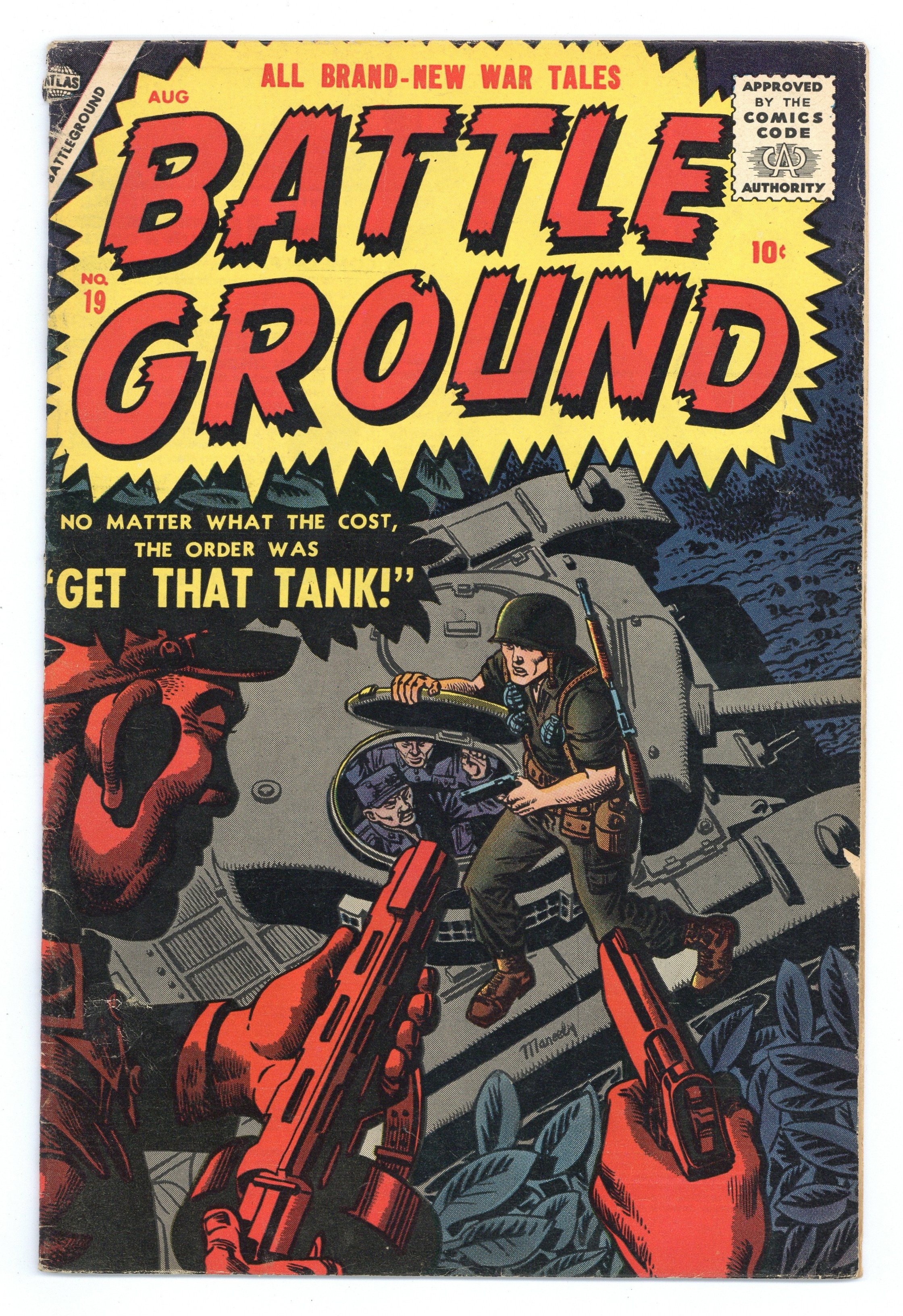 "Get That Tank" (art by Gene Colan), "Bombardment" (art by Joe Maneely), "Escape" (art by Jack Keller), "Battle Banner" (art by John Severin), "At Gun Point," and a two-page text story, "Hopeful Defeat." Maneely cover. Cover price $0.10.