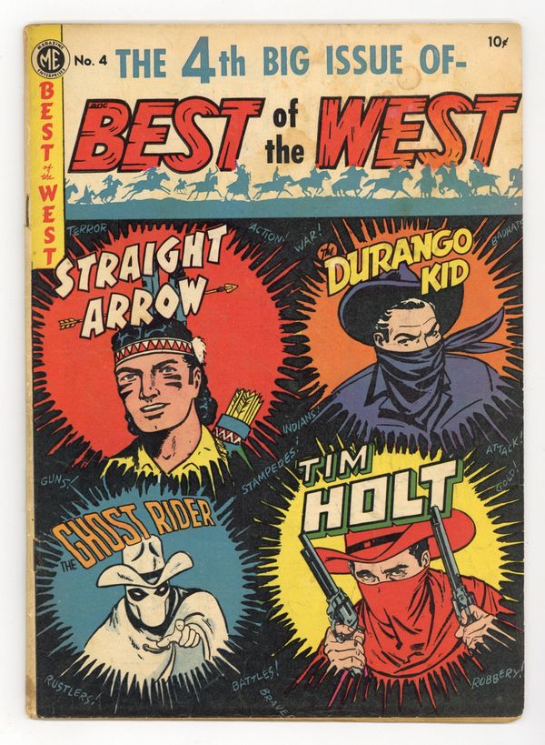 (A-1 Comics #59) Cover by Fred Meagher, Joe Certa, Dick Ayers and Frank Bolle. Edited by Raymond C. Krank. Art by Fred Meagher, John Belfi, Frank Bolle and Dick Ayers. Sometimes listed as A1 Comics (1944 Life's Romances) #59. Part of A1 Comics, an anthology from Magazine Enterprises with content that varied from month to month. This issue featured tales of Old West heroes. Feather-Hat is jealous of Straight Arrow because of his war decorations; Ghost Rider seeks the truth about a shaman's severed head that seems to order its tribe to war; Durango Kid investigates a murder at a mining outfit and almost gets dynamited. Also featuring a color ad for the "Complete 15 Piece Bronco Buster" Cowboy and Cowgirl Outfits. The Mark of a Warrior; The Talking Dead; The Junk Robbers; The Blasts of Doom! 32 pages, Full Color. Cover price $0.10.