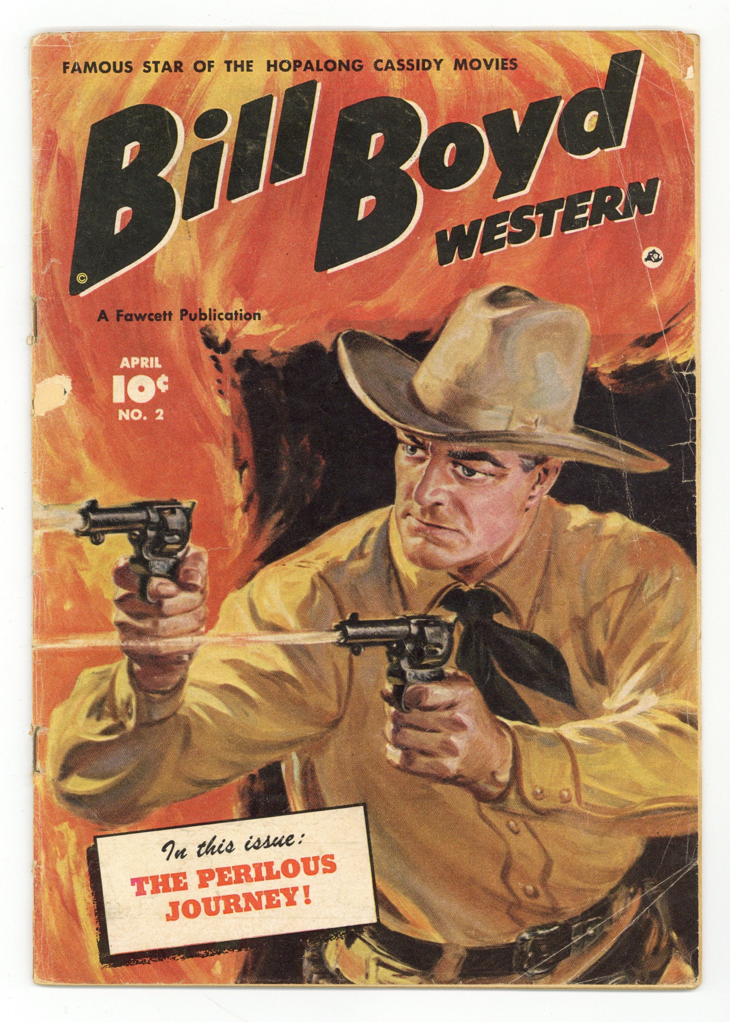 Painted cover by Norman Saunders. Movie cowboy Bill Boyd, best known for playing Hopalong Cassidy, stars as himself in tales of Western adventure. Tricked into helping an outlaw to escape from a posse, Bill is jailed, and must escape to track the outlaw gang and clear his name. Hammerhead tries to start a fight with a horse after getting splashed by a puddle. Windy Whopper gives a stranger a tour of the town, but not everything Windy says can be trusted. Plus a vintage PSA for War Bonds featuring Captain Marvel (Shazam). The Perilous Journey; Rustler's Range; Brainy Buster; Hammerhead; Windy Whopper: The Pony Express Rider. 32 pages, Full Color. Cover price $0.10.