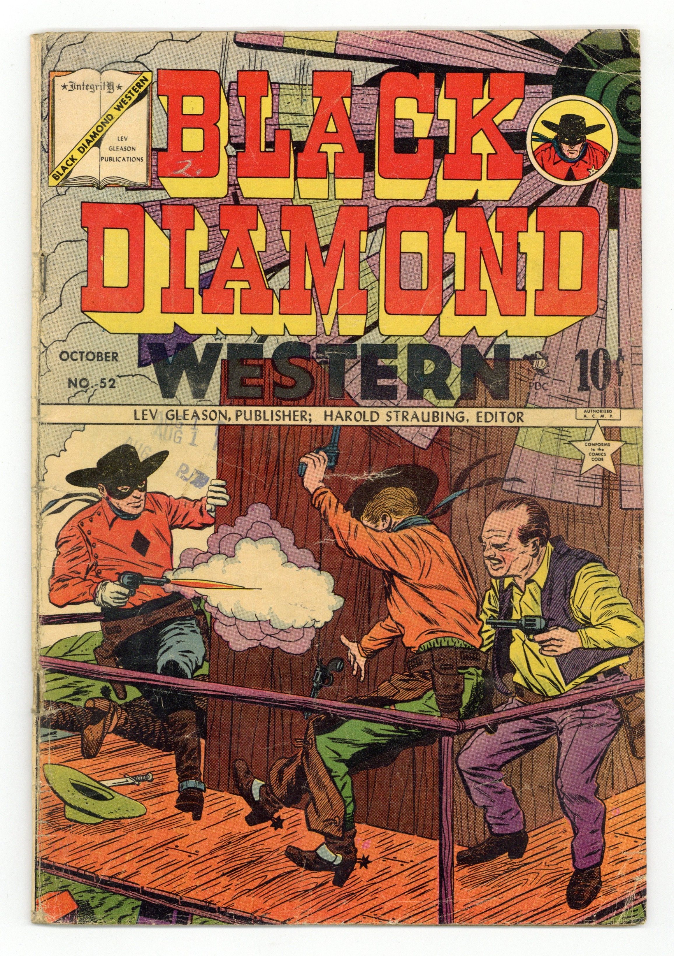 Cover by Bill Walton. Stories and art by Bill Walton and Vic Carrabotta. Masked like the Lone Ranger or Zorro, Black Diamond fights for justice in the West, aided by his sidekick Bumper and his status as a federal marshal. Black Diamond tries to prove a man was framed for a prospector's murder, in a story that use the wide panels - but no other special features - of the previous issue's "Deep Dimension" pseudo 3-D effect. Buck Roper is targeted by kidnappers who learn about his rich parents, but his rodeo friends intervene. Red Fire is accused when a masked arsonist terrorizes the town. Black Diamond: Six Gun Showdown; Buck Roper: The Rodeo Ransom; Tight Noose; Red Fire: The Flaming Torch Rider of the Plains. 36 pages, Full Color. Cover price $0.10.